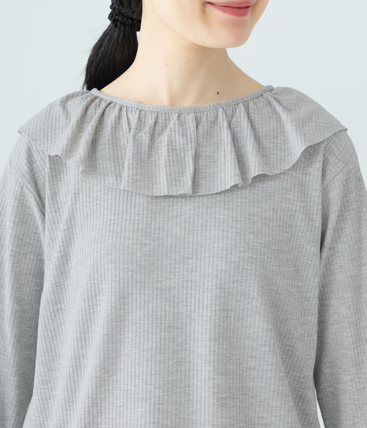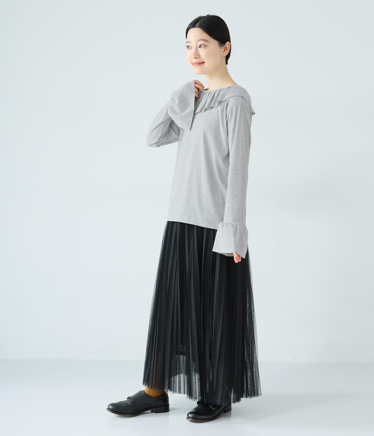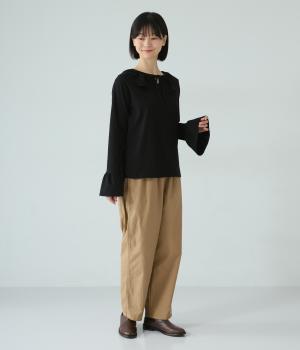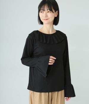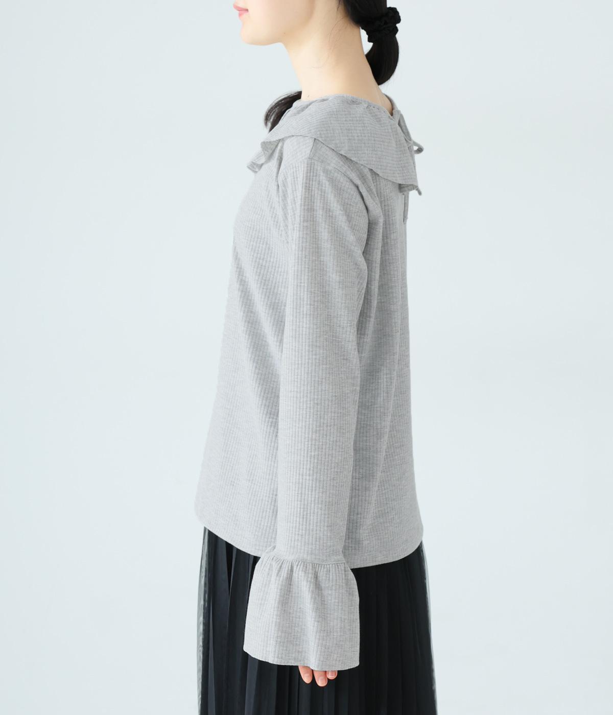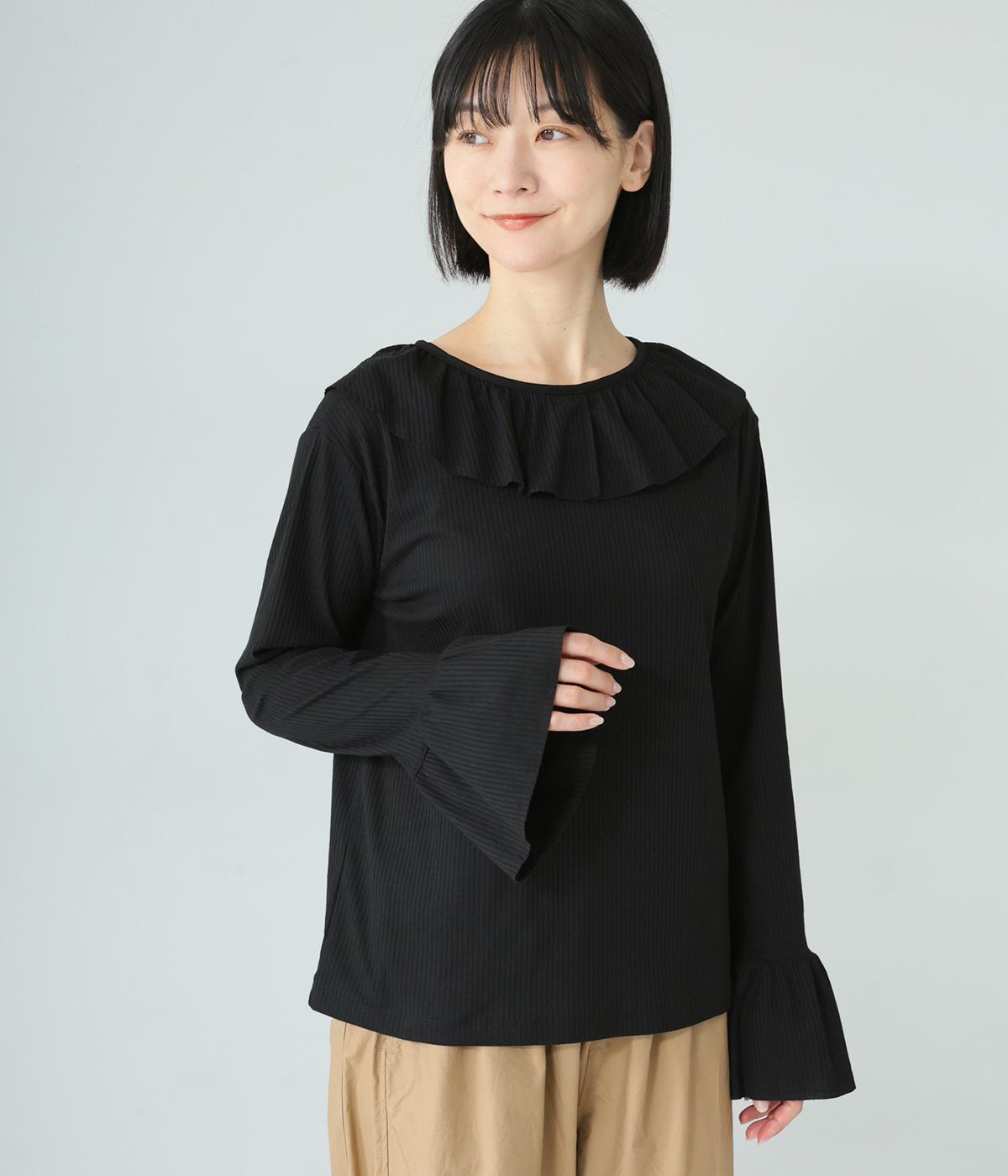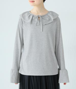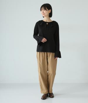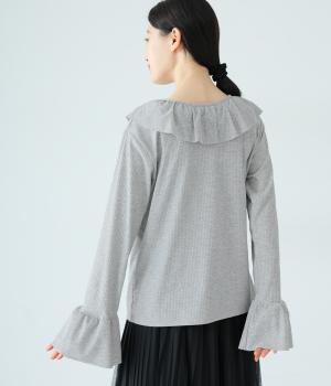 襟元のラッフルカラーとリボンが愛らしいトップス。前後2way仕様で、気分に合わせて着こなしに変化をつけられます。袖口は切り替えとギャザーを入れ、華やかさをアップ。襟や袖のデザインをいかしたレイヤードスタイルもたのしめます。