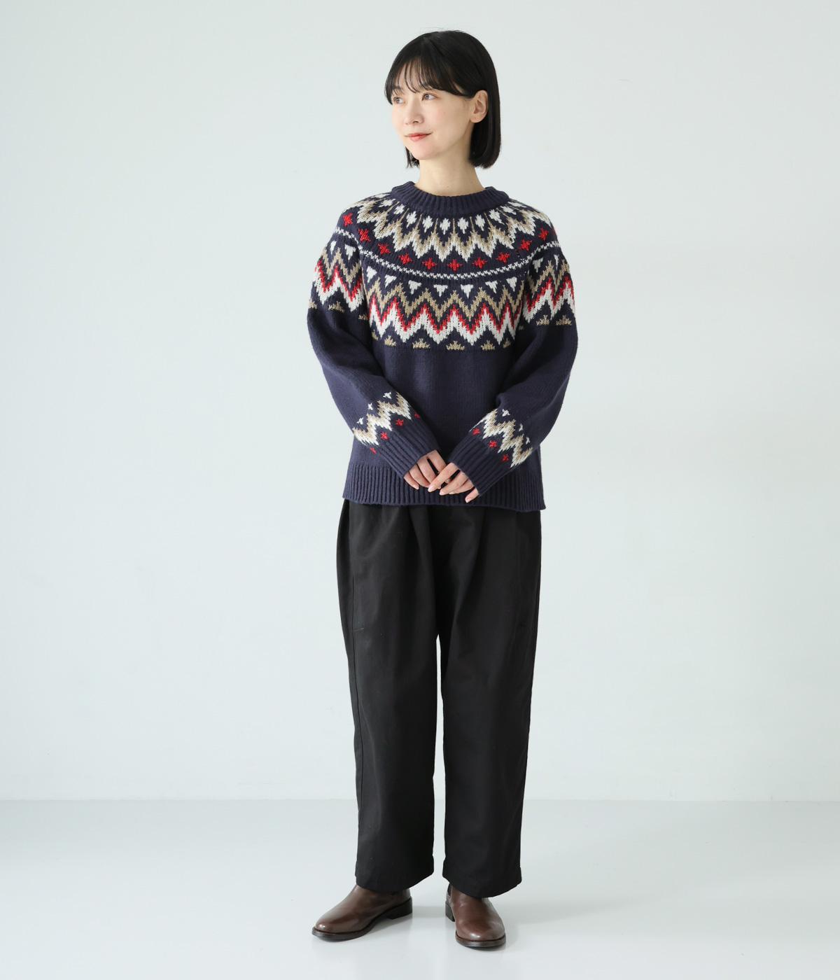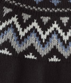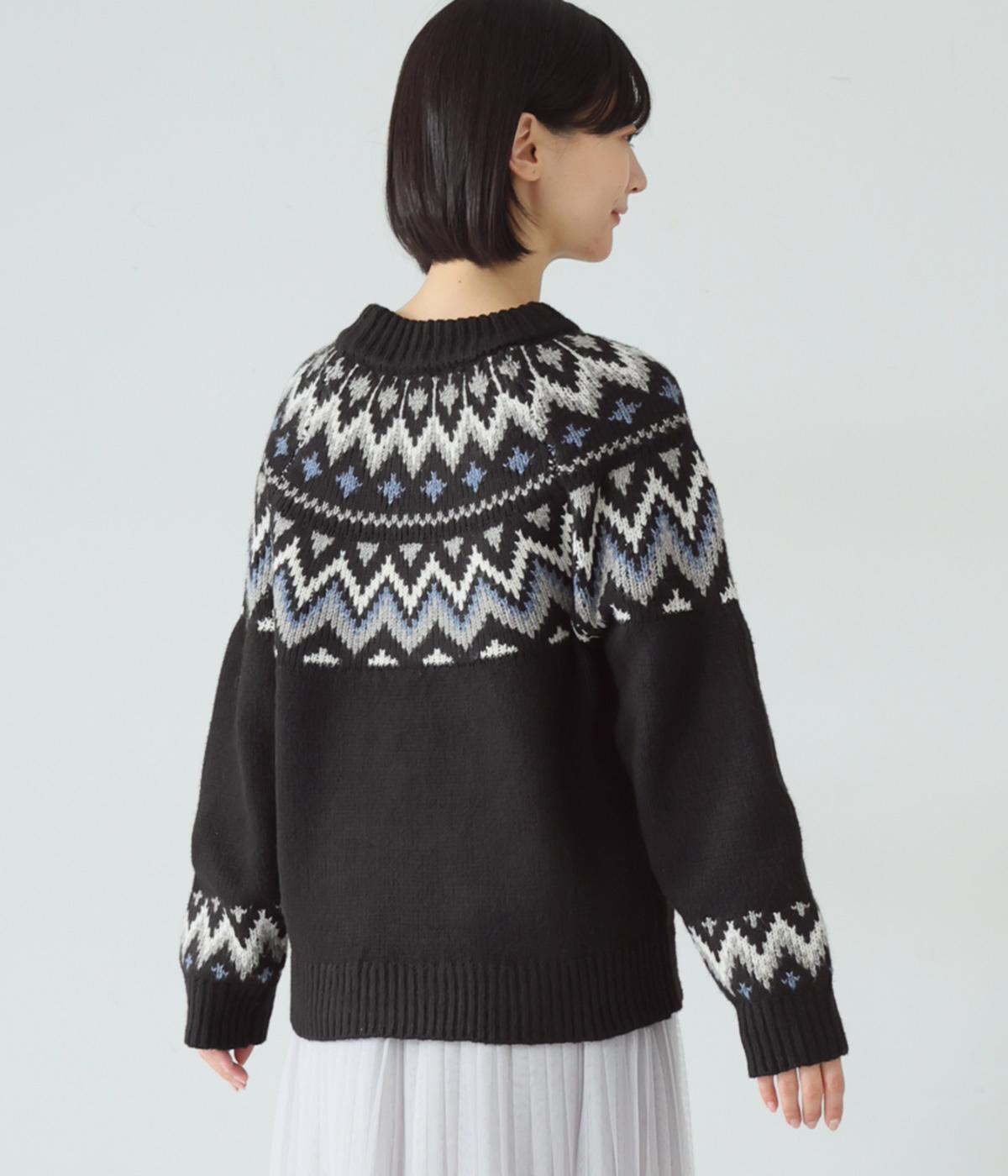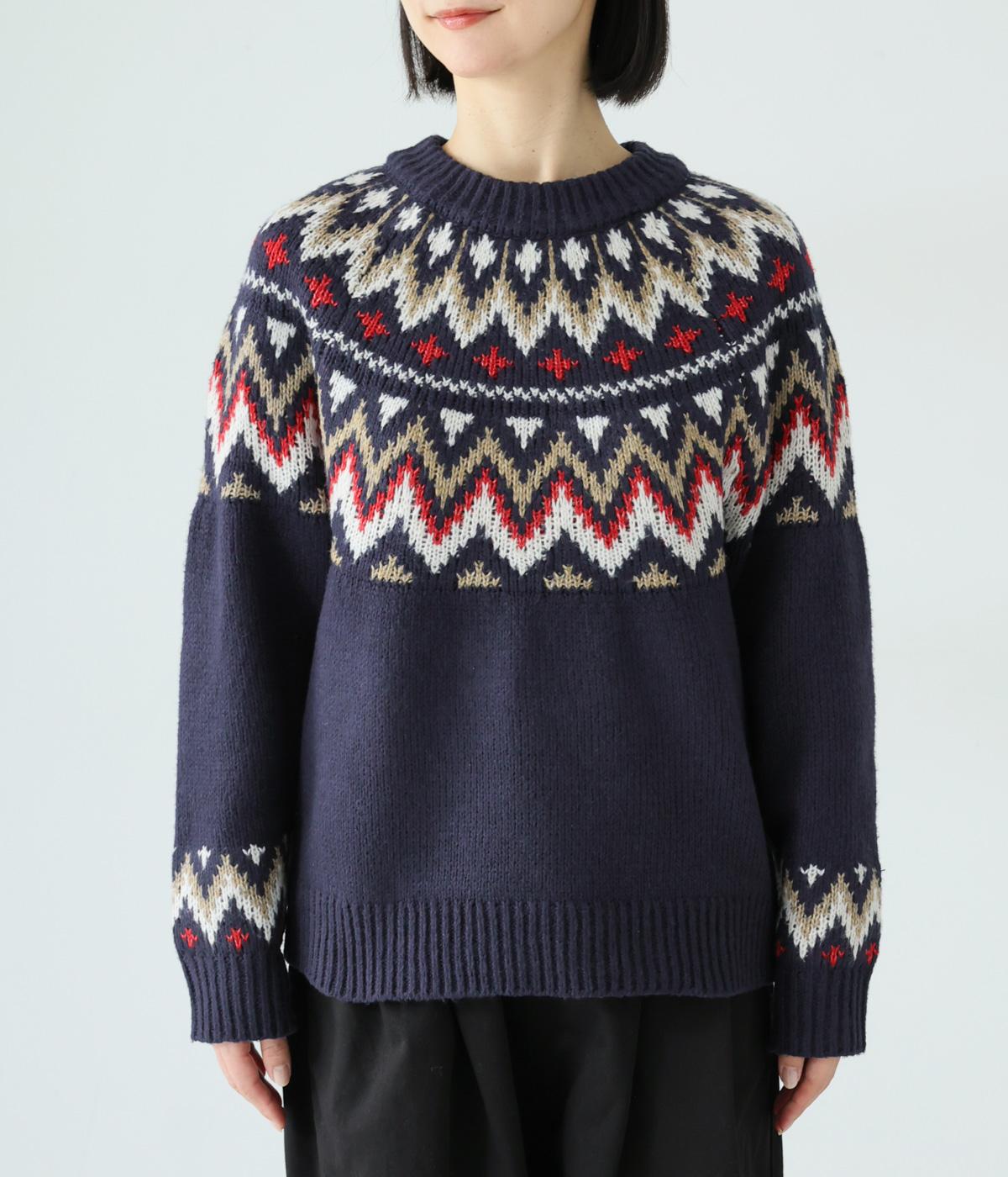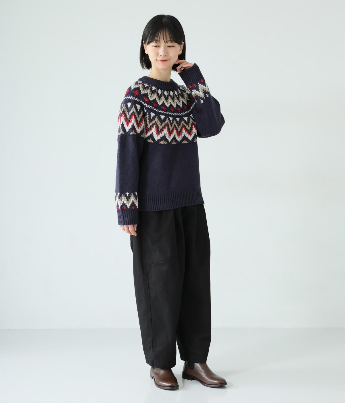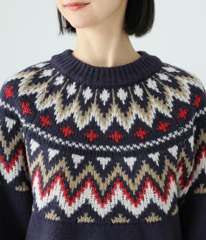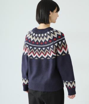 チクチク感の少ないとてもやわらかな風合いが魅力のニットです。ほどよい厚みがあるのであたたかく、寒い時期にも頼れる生地感。配色にメリハリを持たせたジャカード柄にも注目です。