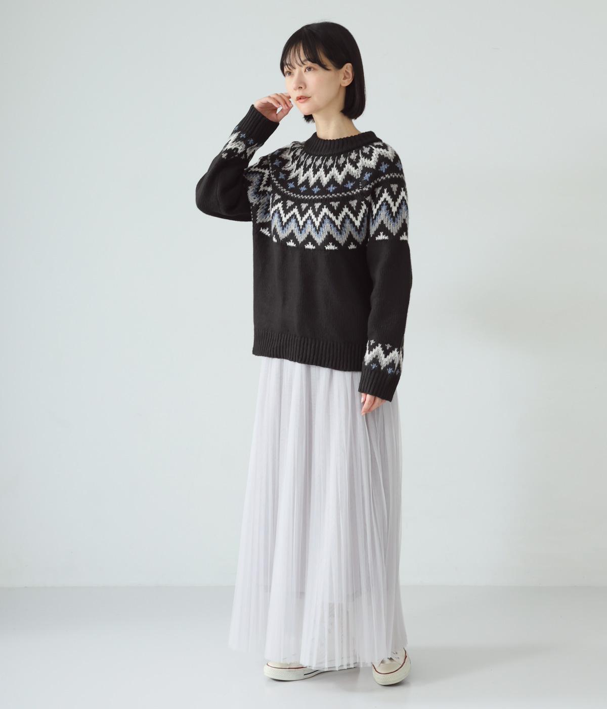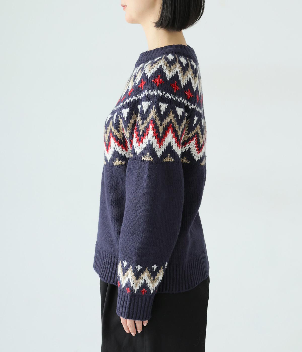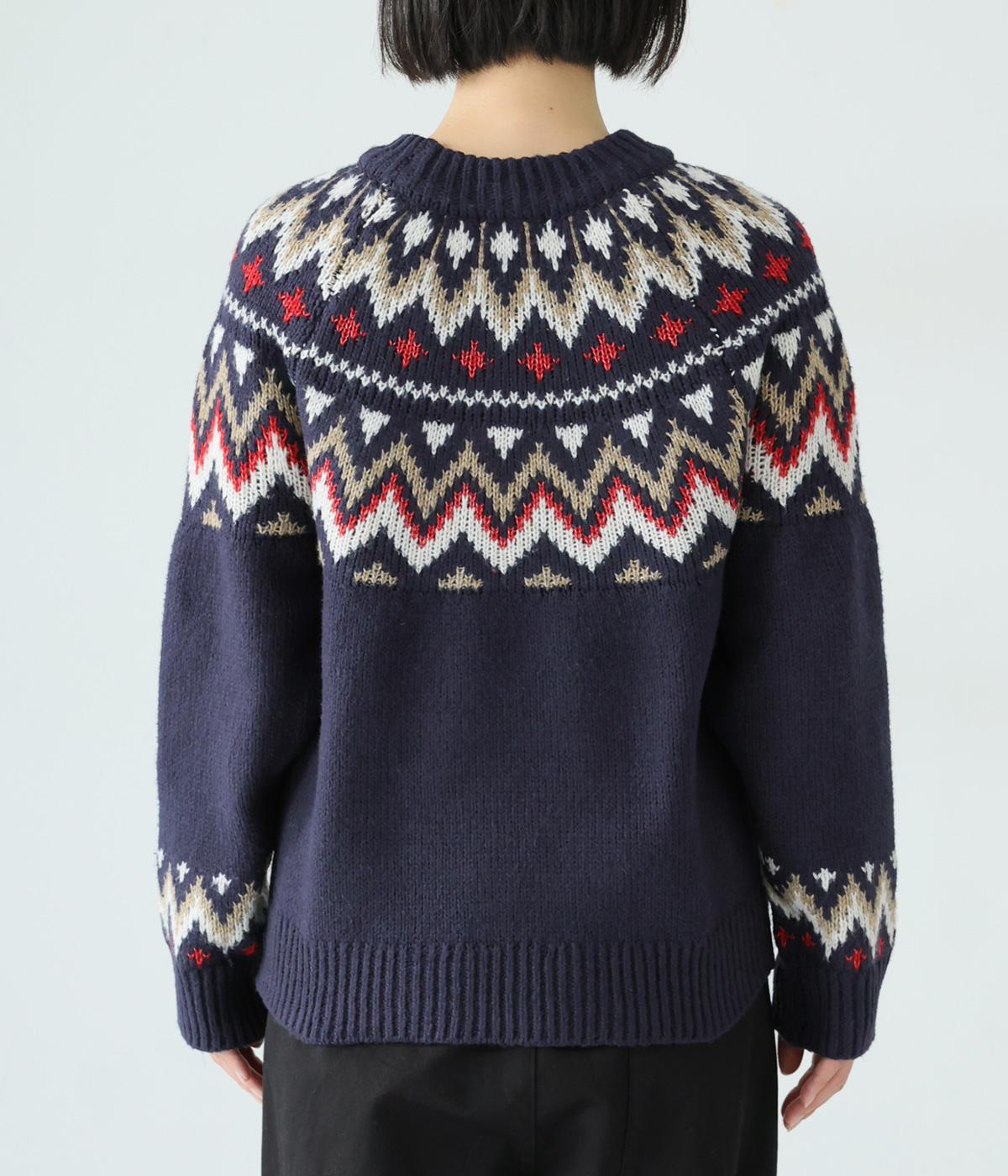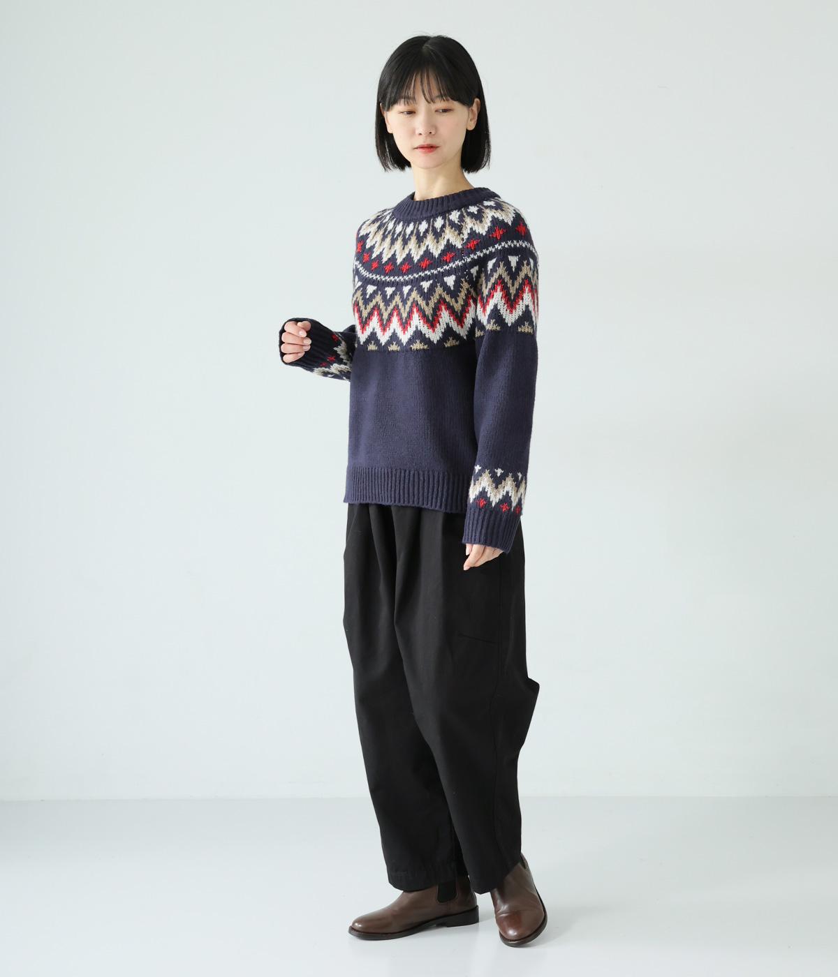 チクチク感の少ないとてもやわらかな風合いが魅力のニットです。ほどよい厚みがあるのであたたかく、寒い時期にも頼れる生地感。配色にメリハリを持たせたジャカード柄にも注目です。
