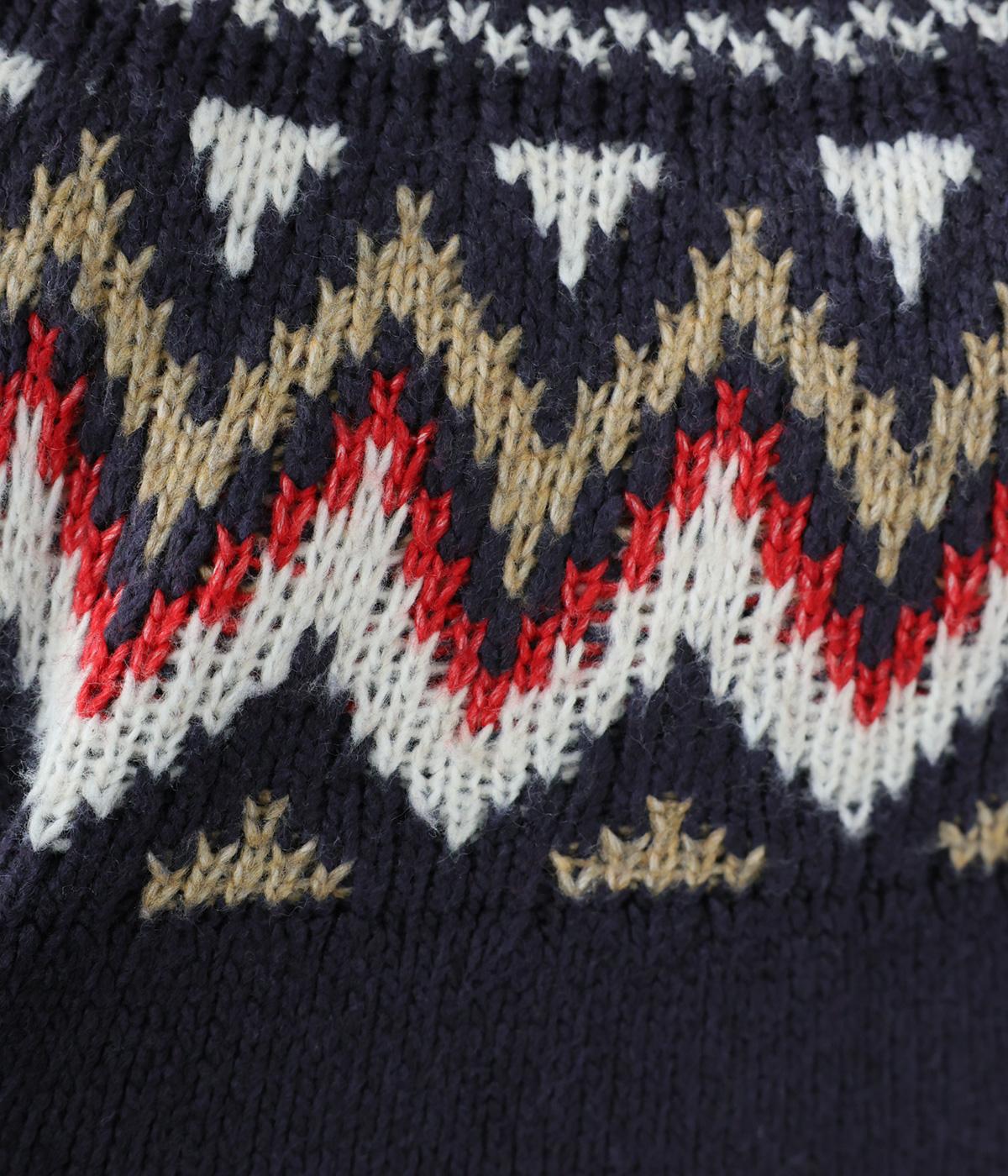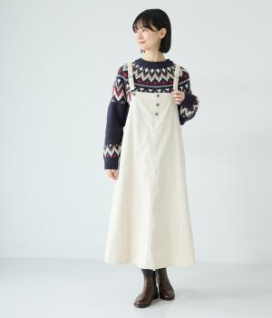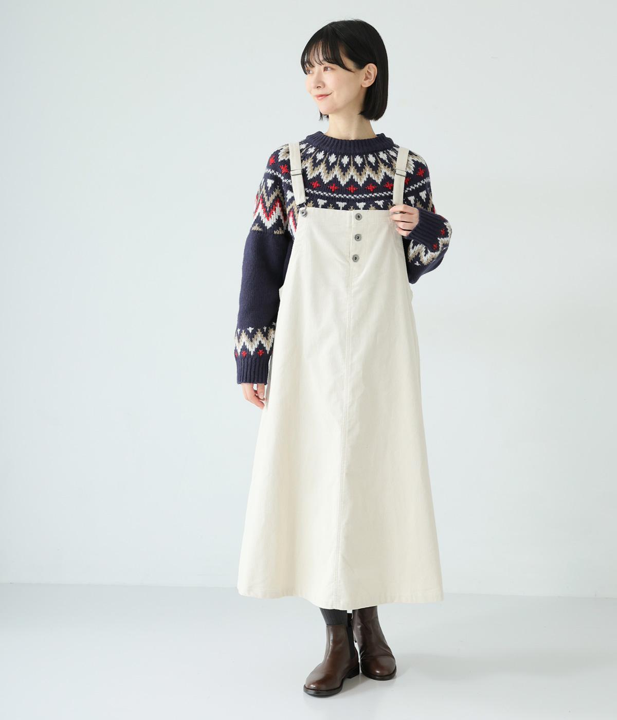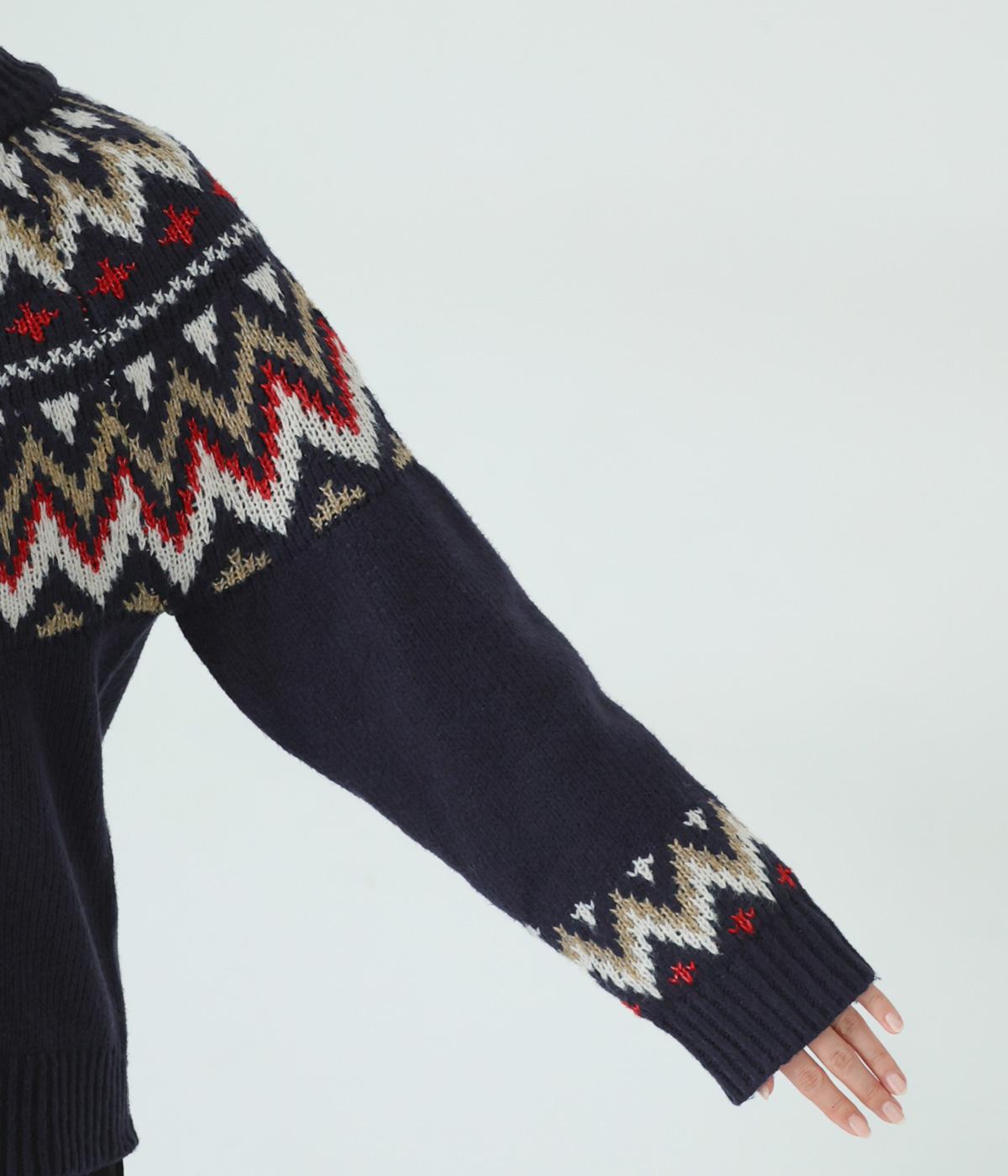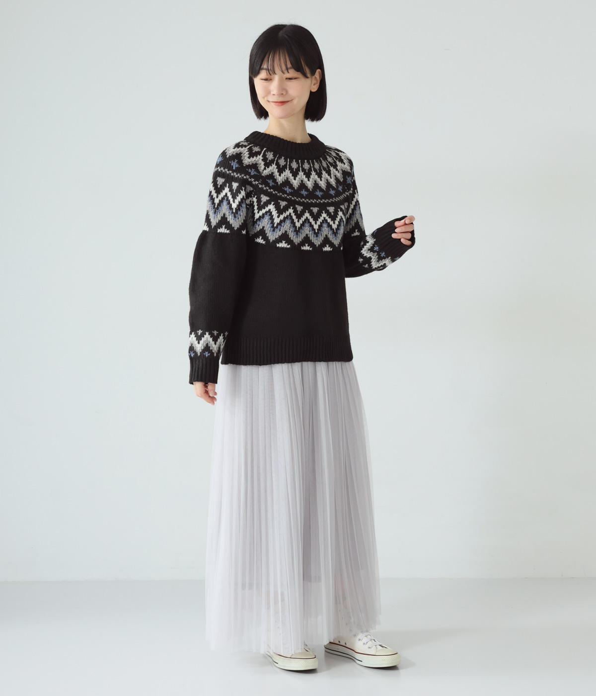チクチク感の少ないとてもやわらかな風合いが魅力のニットです。ほどよい厚みがあるのであたたかく、寒い時期にも頼れる生地感。配色にメリハリを持たせたジャカード柄にも注目です。