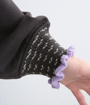 ほどよい厚みのコットン混のポリエステル生地です。首元と袖口にはやわらかな肌ざわりのニット生地を合わせました。伸縮性のあるニットで着やすさも確保しました。