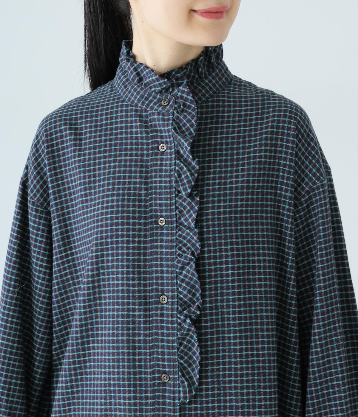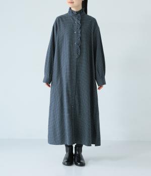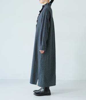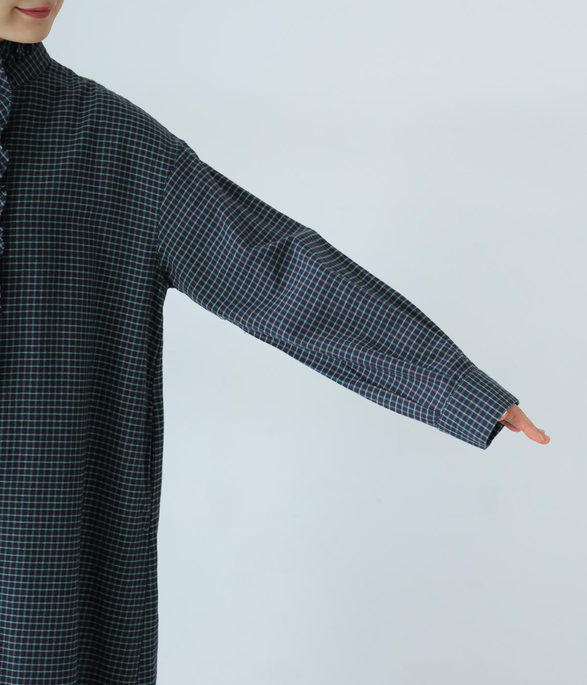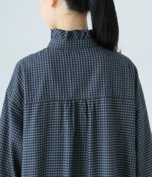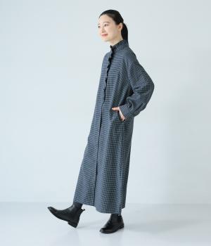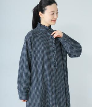 前立てにつながる切りっぱなしのフリル襟が華やか。ストンと落ちるシルエットが美しく、甘くなりすぎない大人らしい装いが楽しめます。前開きなので、羽織りものとしての着こなしもおすすめです。