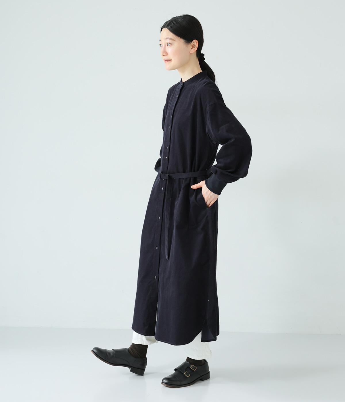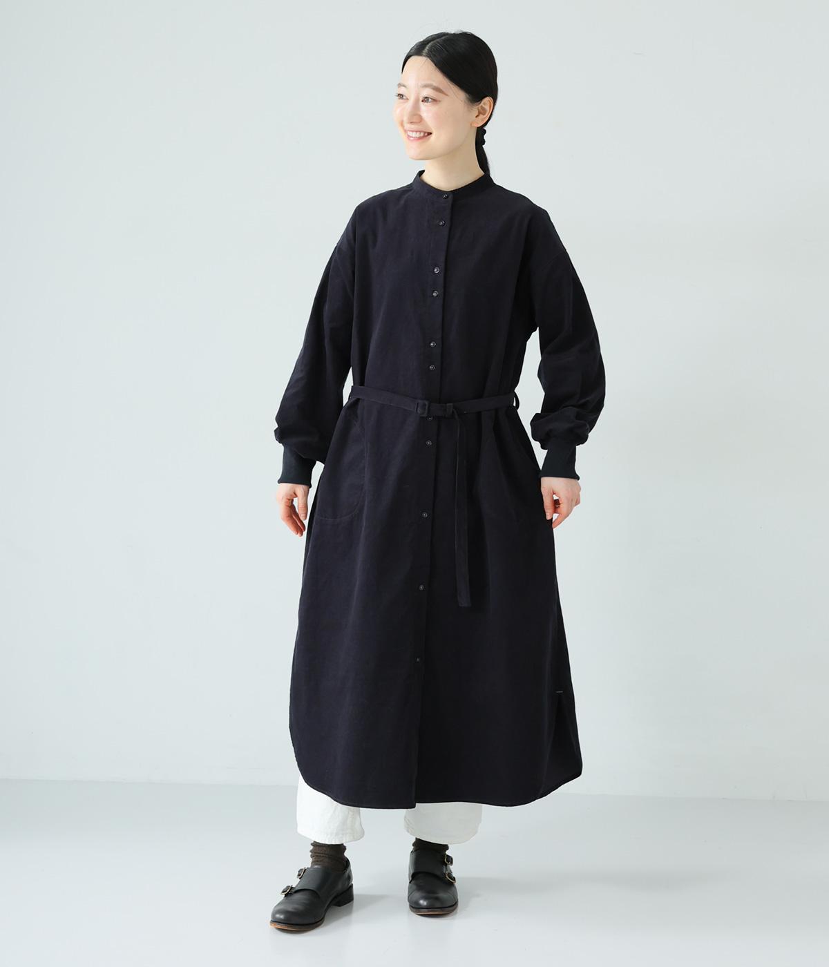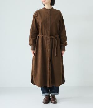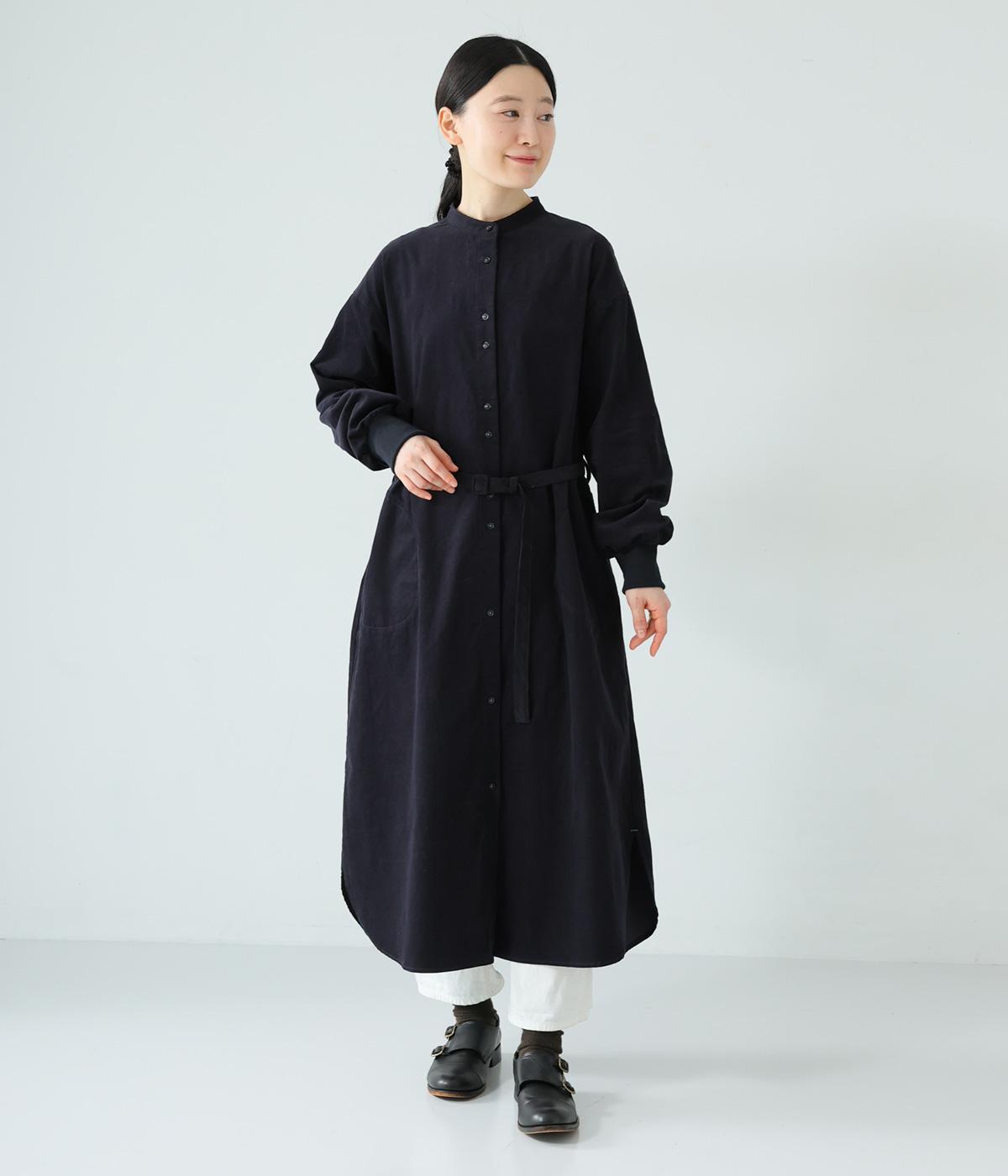 低めのスタンドカラーがきちんと感を与えるシャツワンピース。ゆとりのあるシルエットをすっきりとウエストマークする共布ベルトつきです。袖口には伸びのよいリブをつけているので、たくし上げも簡単。羽織りとしても重宝する着まわし力の高いアイテムです。