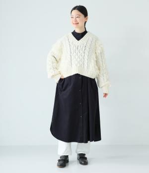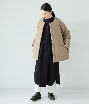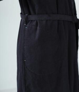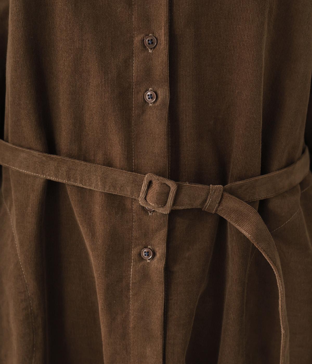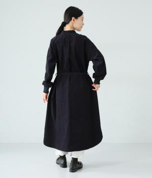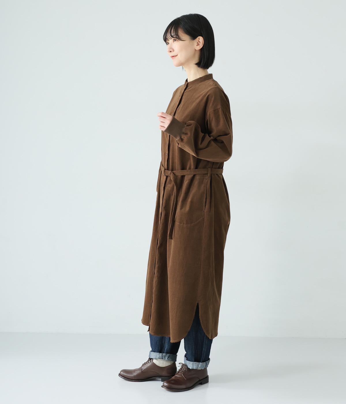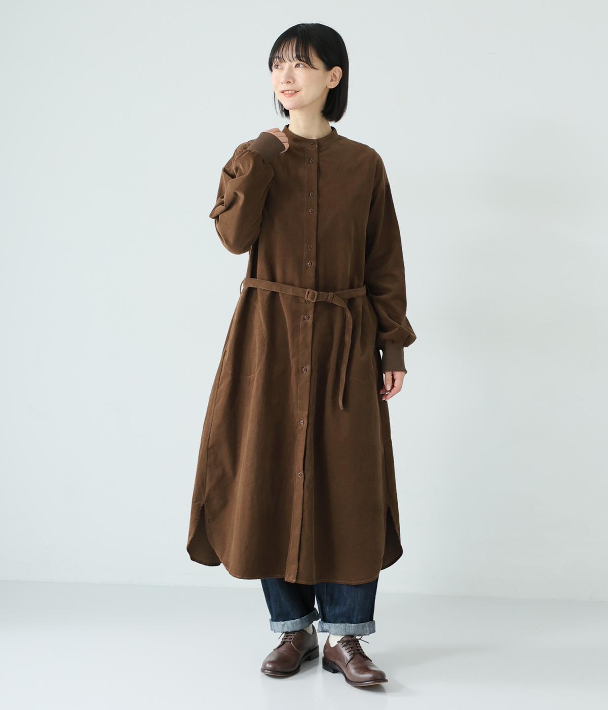 低めのスタンドカラーがきちんと感を与えるシャツワンピース。ゆとりのあるシルエットをすっきりとウエストマークする共布ベルトつきです。袖口には伸びのよいリブをつけているので、たくし上げも簡単。羽織りとしても重宝する着まわし力の高いアイテムです。