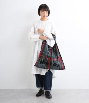 オリジナルのチェック生地に大人気の「MERCI」刺しゅうをほどこした、特別感のあるバッグ。大きめサイズで存在感があり、日常使いの必需品もしっかり収納してくれます。ワンハンドルで持ったときのシルエットも◎。