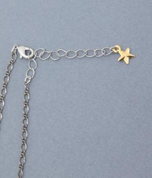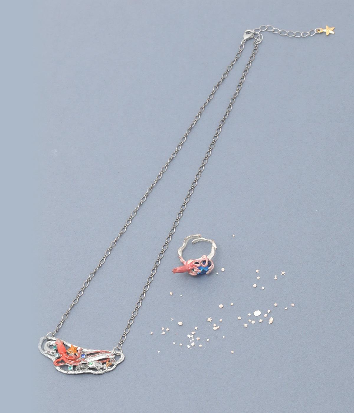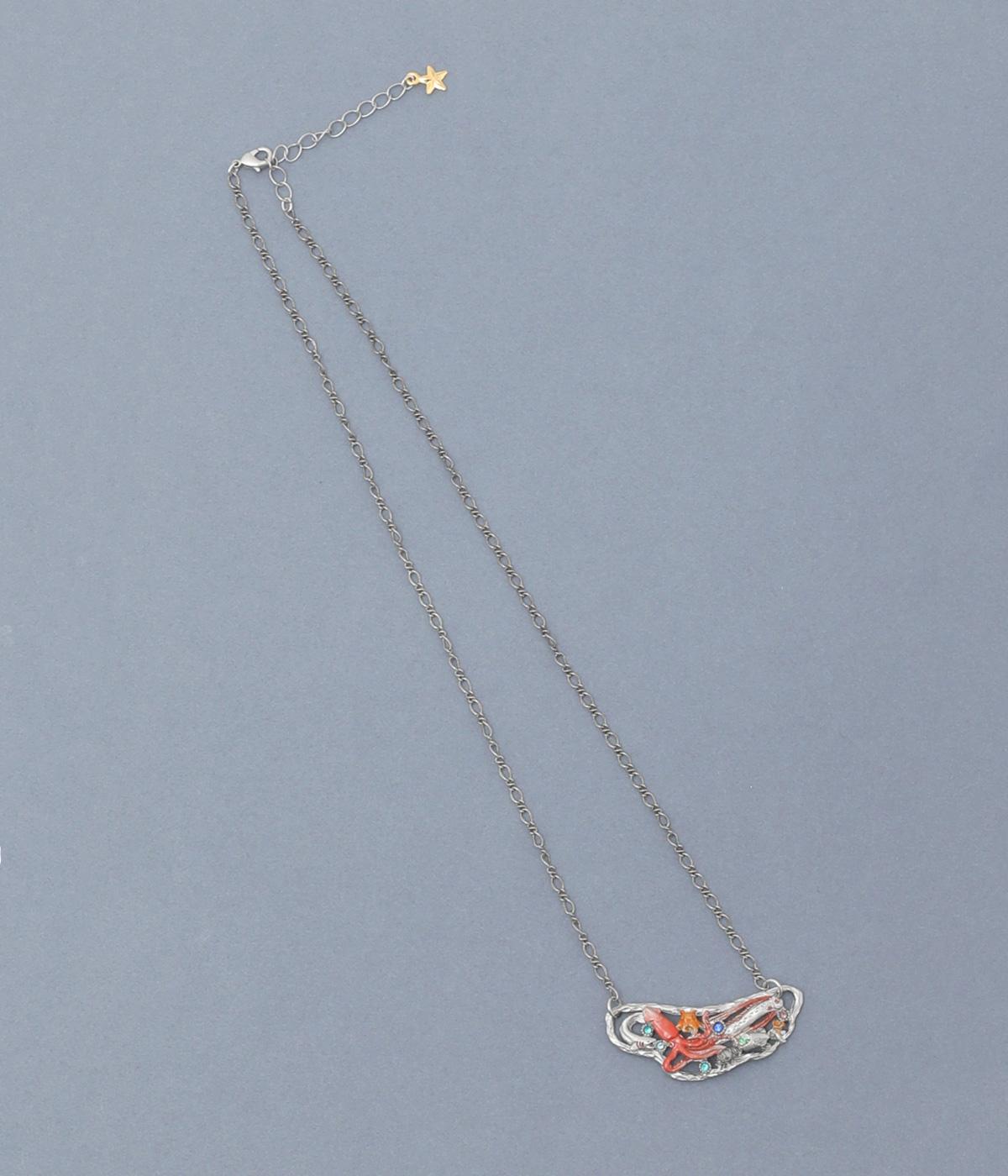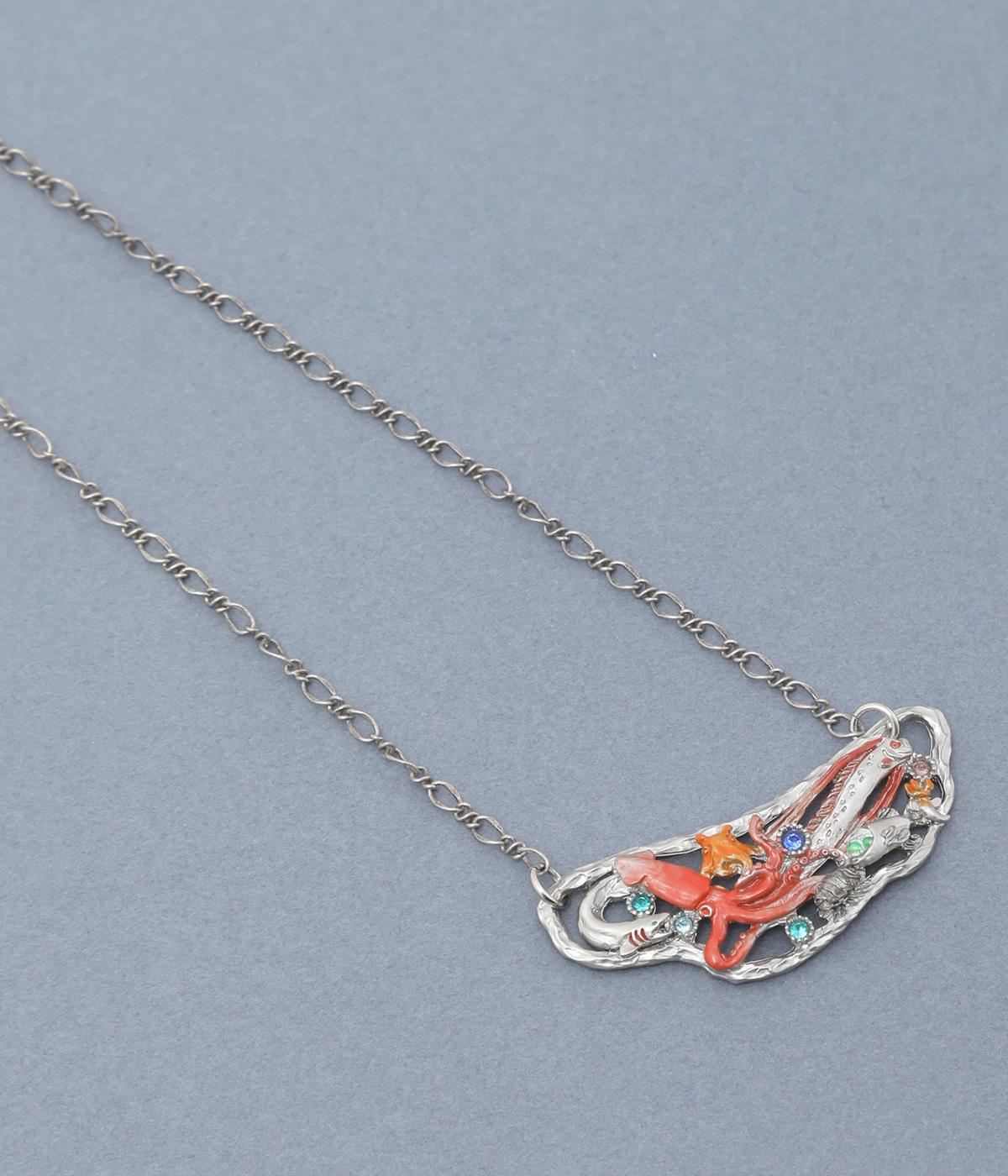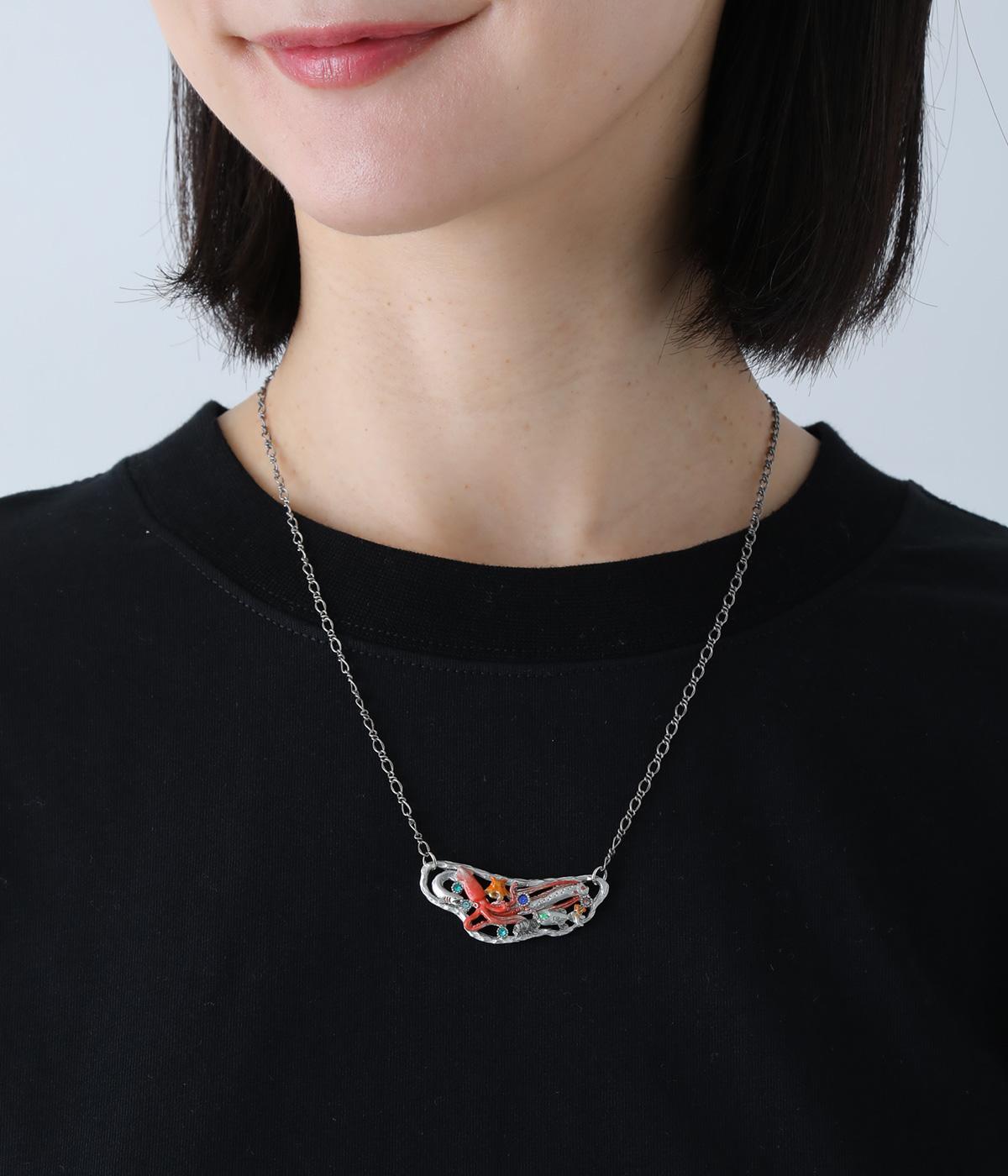 揺らぐ波や泡に包まれ、さまざまな深海の生き物が集まるネックレス。深海の暗さを思わせる落ち着いたシルバーをベースに、きらりと輝くカットガラスを散りばめました。生き物たちのカラフルな姿がコーディネートにアクセントをプラスしてくれます。