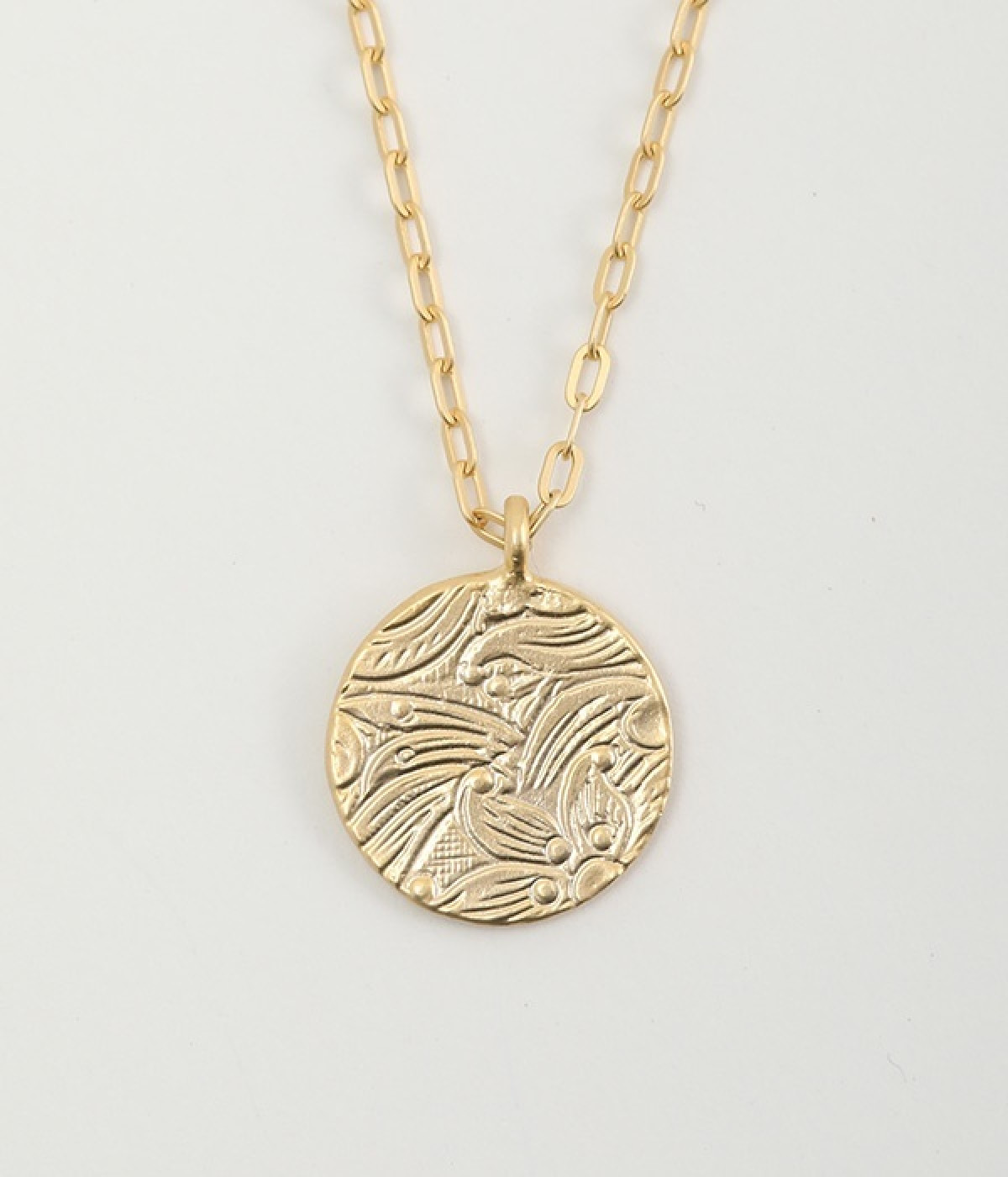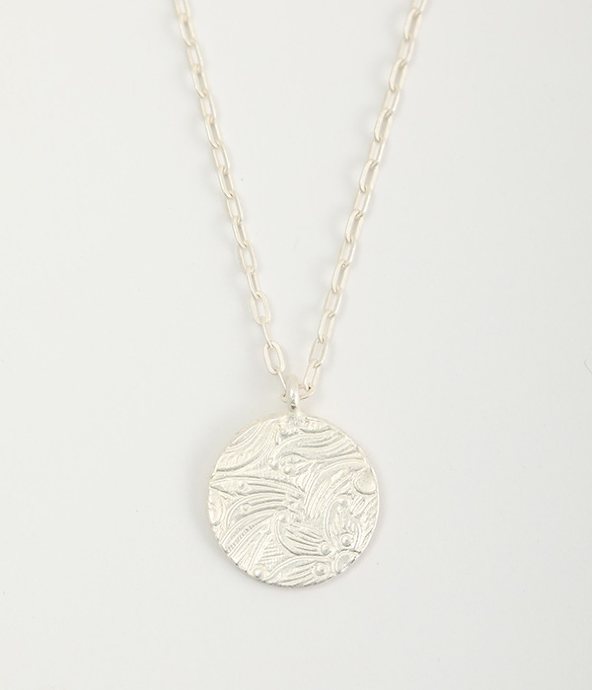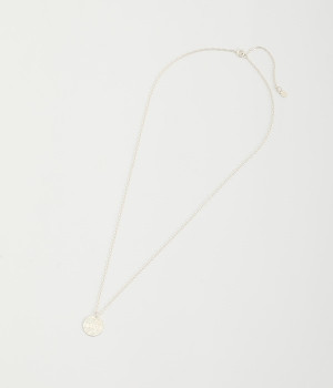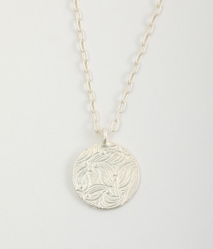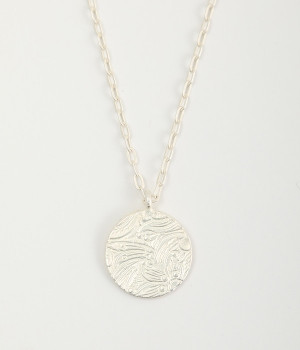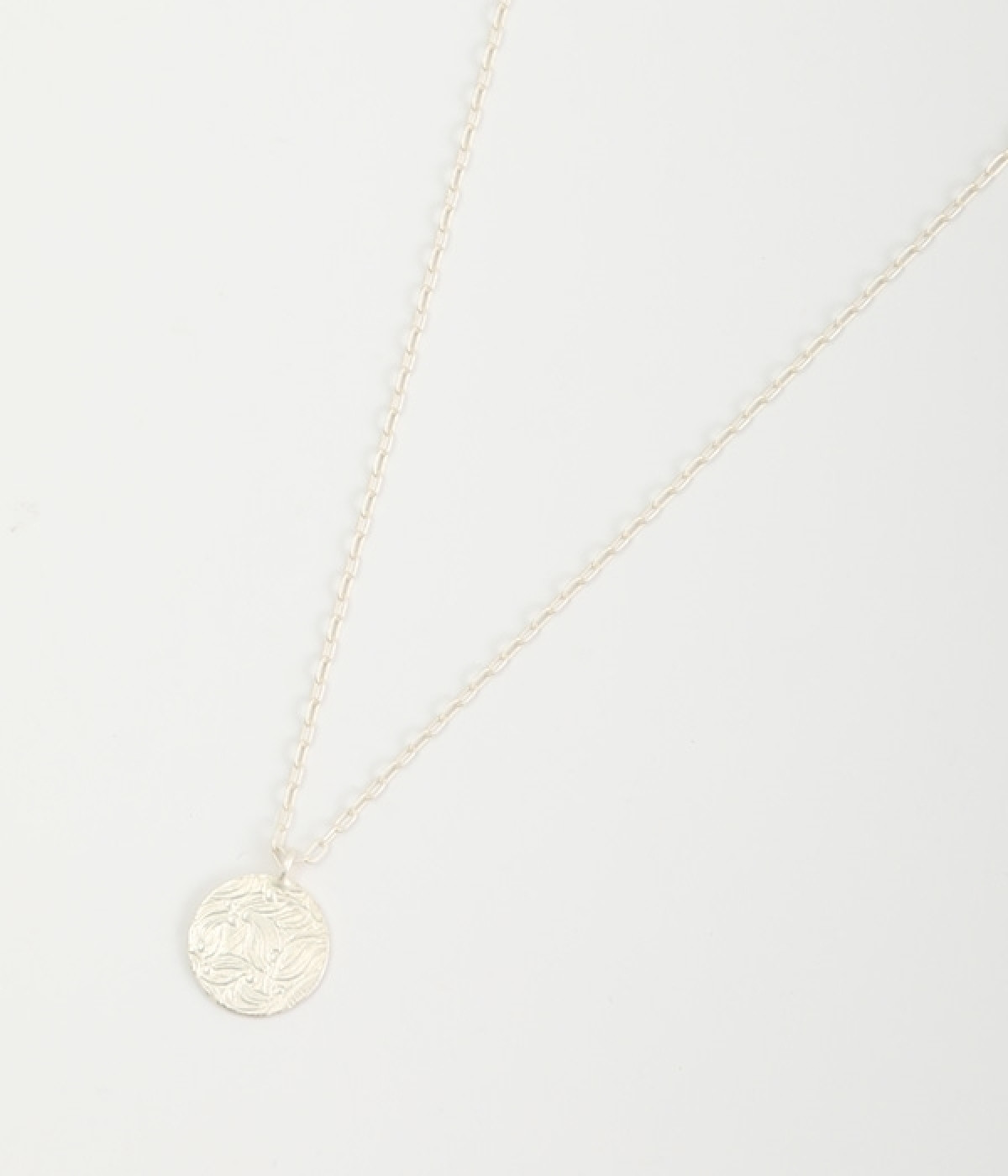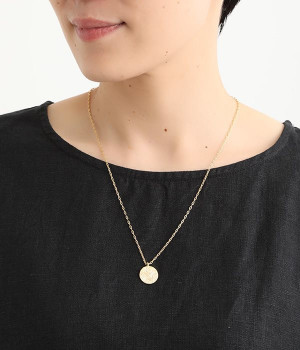 ヴィンテージ感のあるボタニカル文様のレリーフプレートをメダルモチーフに仕上げた、セミロングタイプのネックレスです。両面で異なるレリーフ文様が楽しめるリバーシブル仕様がポイントで、胸元にさりげないアクセントを添えてくれます。マットな色合いの真鍮と、抜け感あるチェーンとの組み合わせも魅力です。アジャスターによって5cm調節も可能。