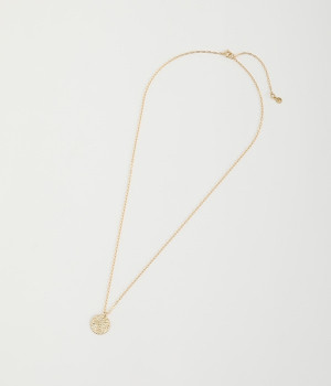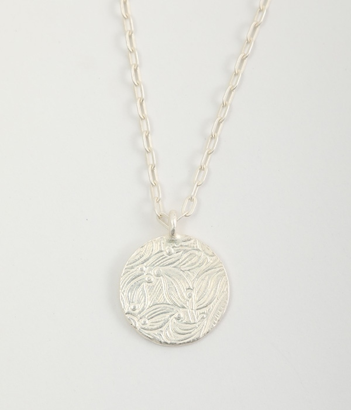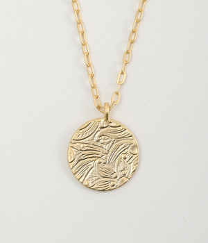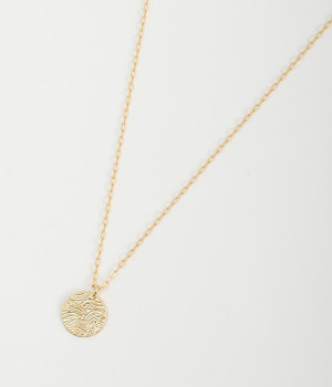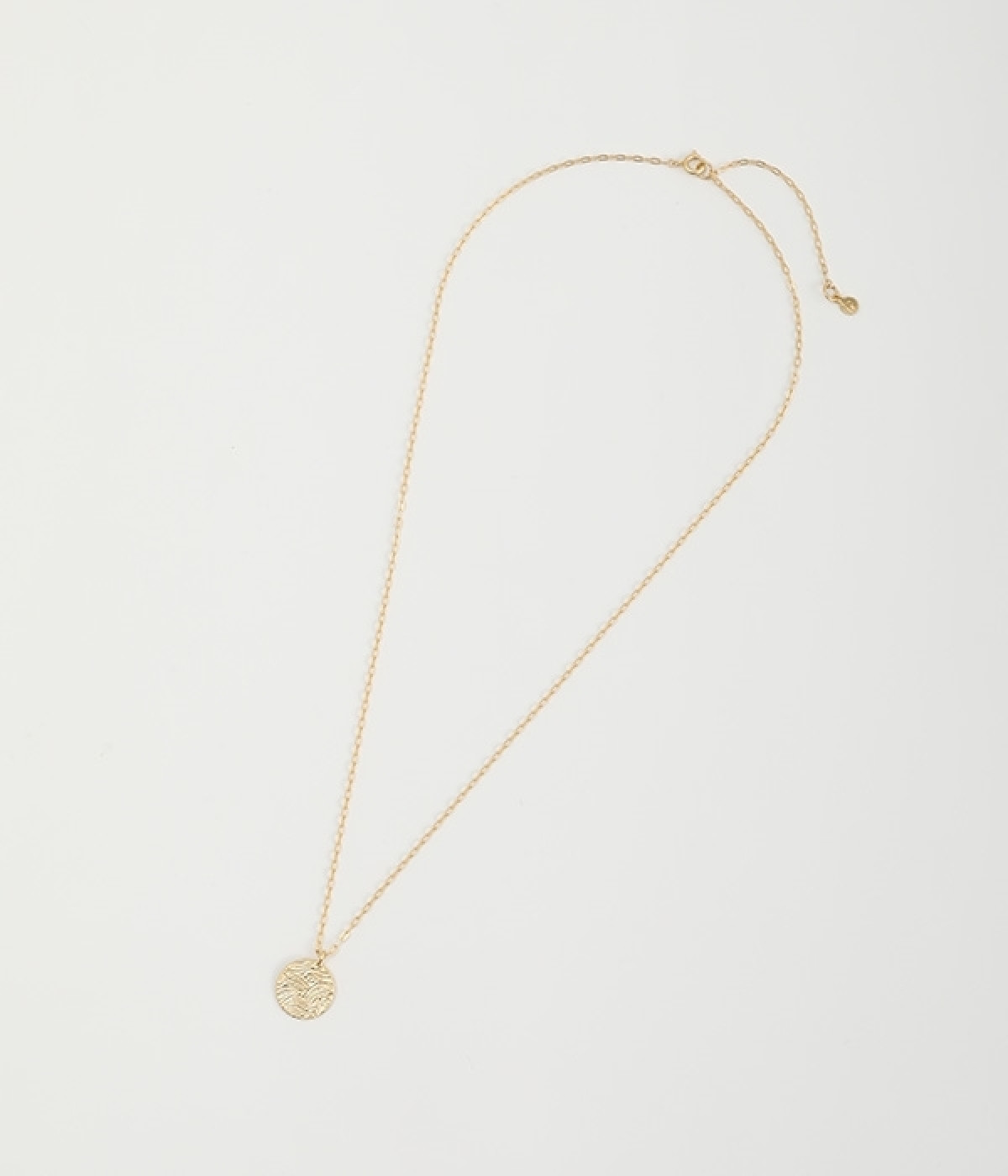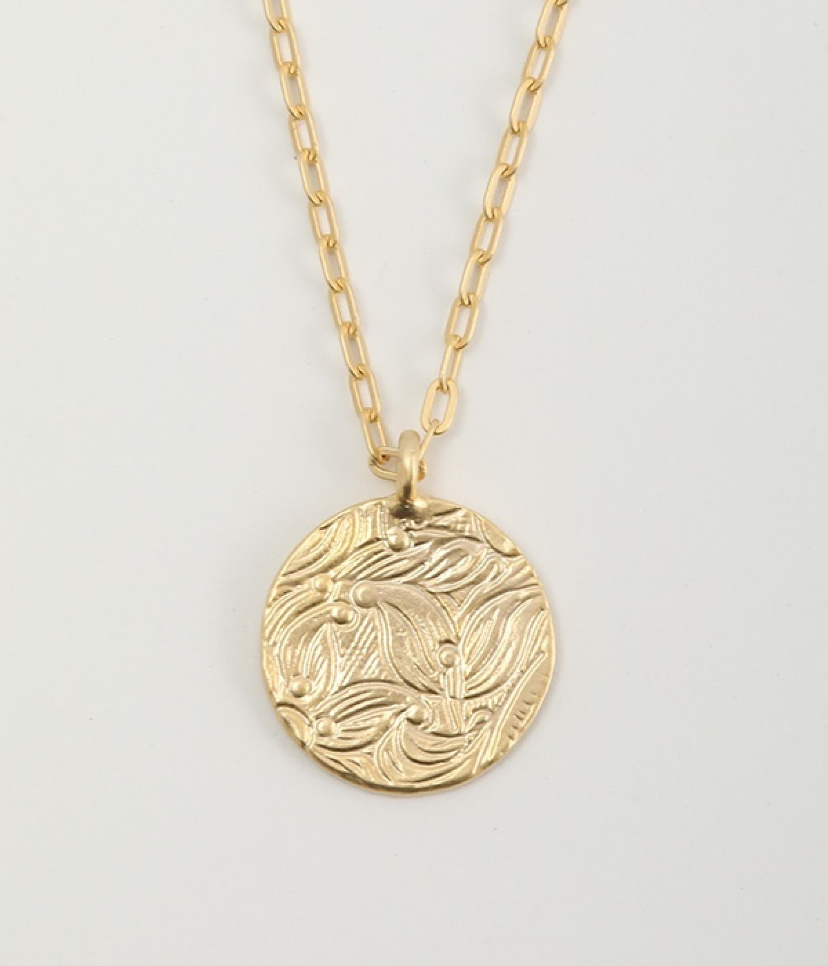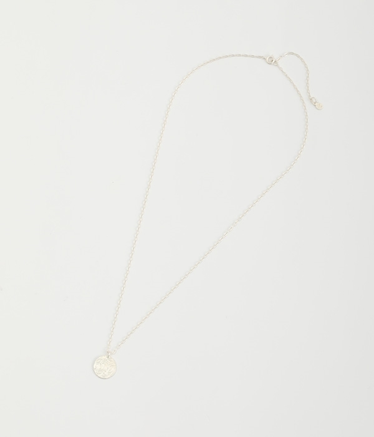 ヴィンテージ感のあるボタニカル文様のレリーフプレートをメダルモチーフに仕上げた、セミロングタイプのネックレスです。両面で異なるレリーフ文様が楽しめるリバーシブル仕様がポイントで、胸元にさりげないアクセントを添えてくれます。マットな色合いの真鍮と、抜け感あるチェーンとの組み合わせも魅力です。アジャスターによって5cm調節も可能。