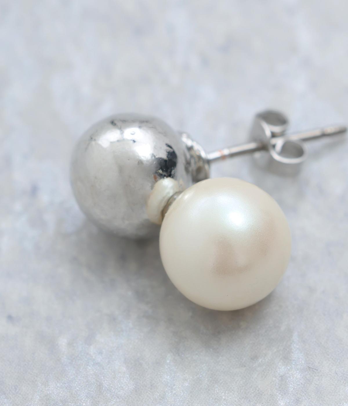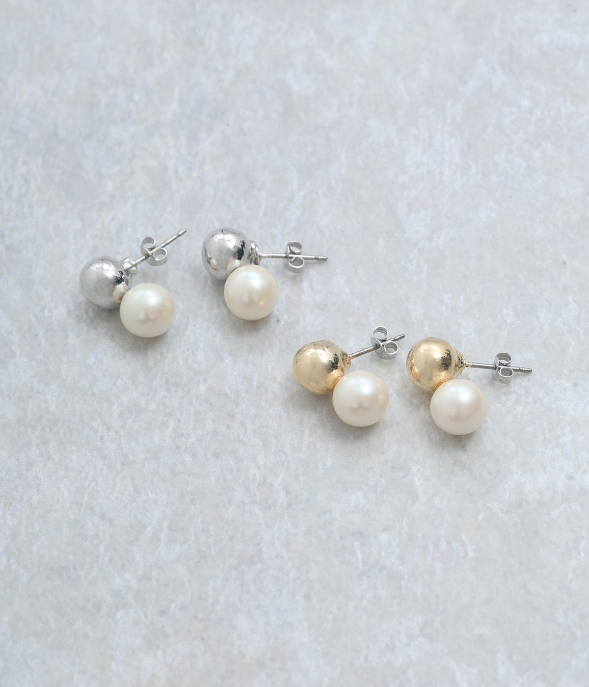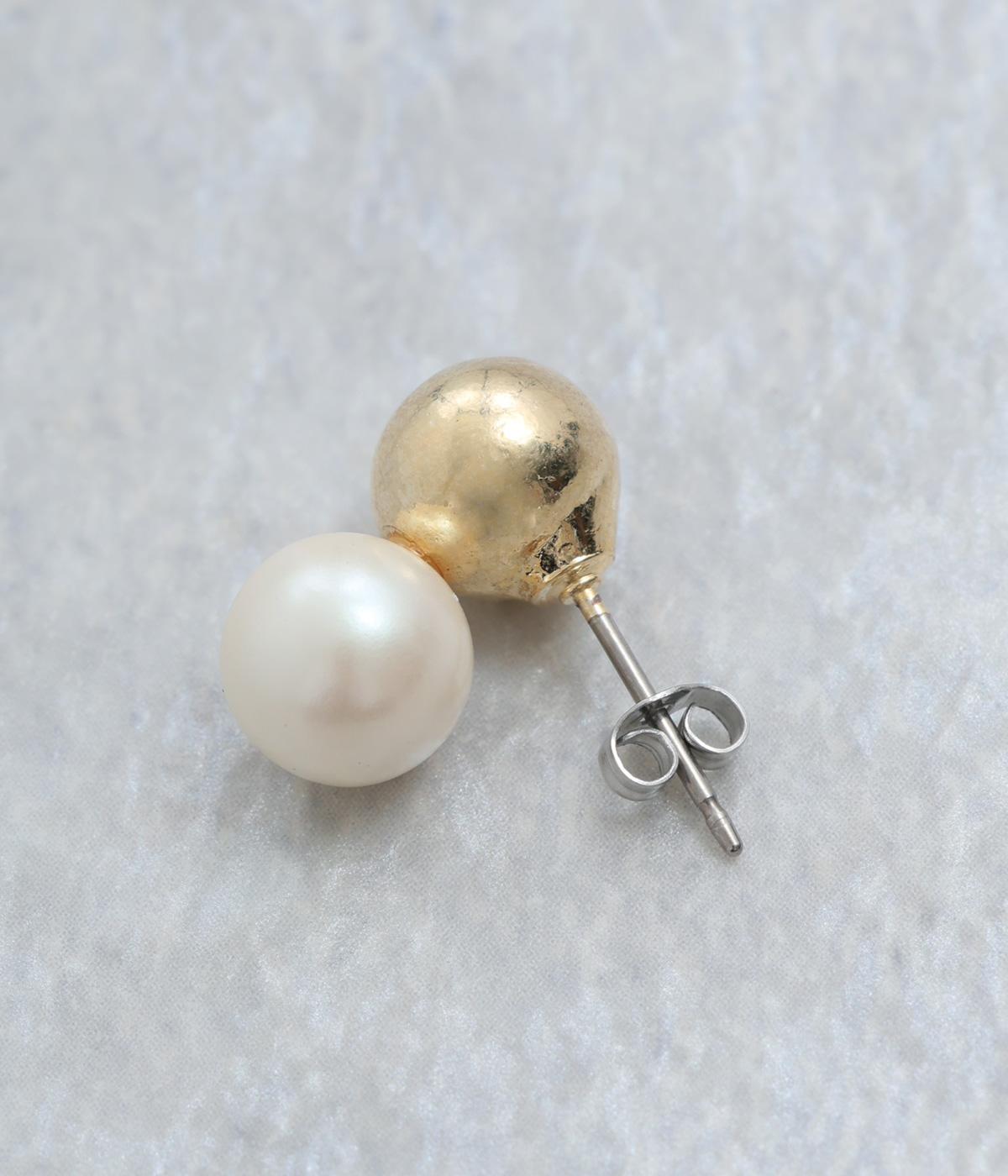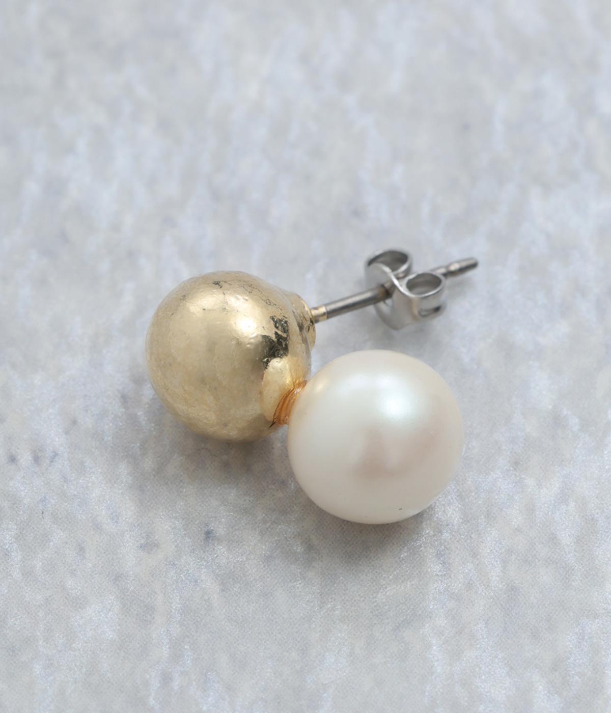 合金とプラパールの組み合わせがシンプルながらも華やかさを演出するピアスです。大きすぎないサイズ感なので主張しずぎず、様々なシーンで重宝します。