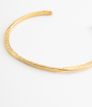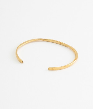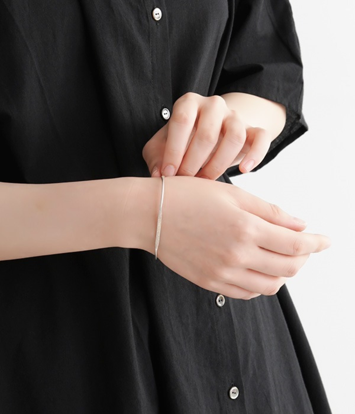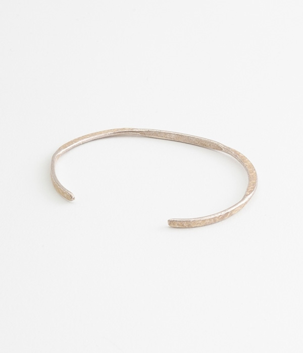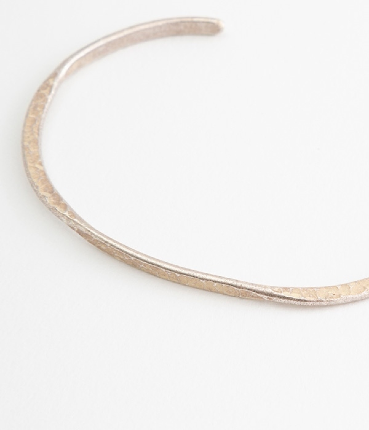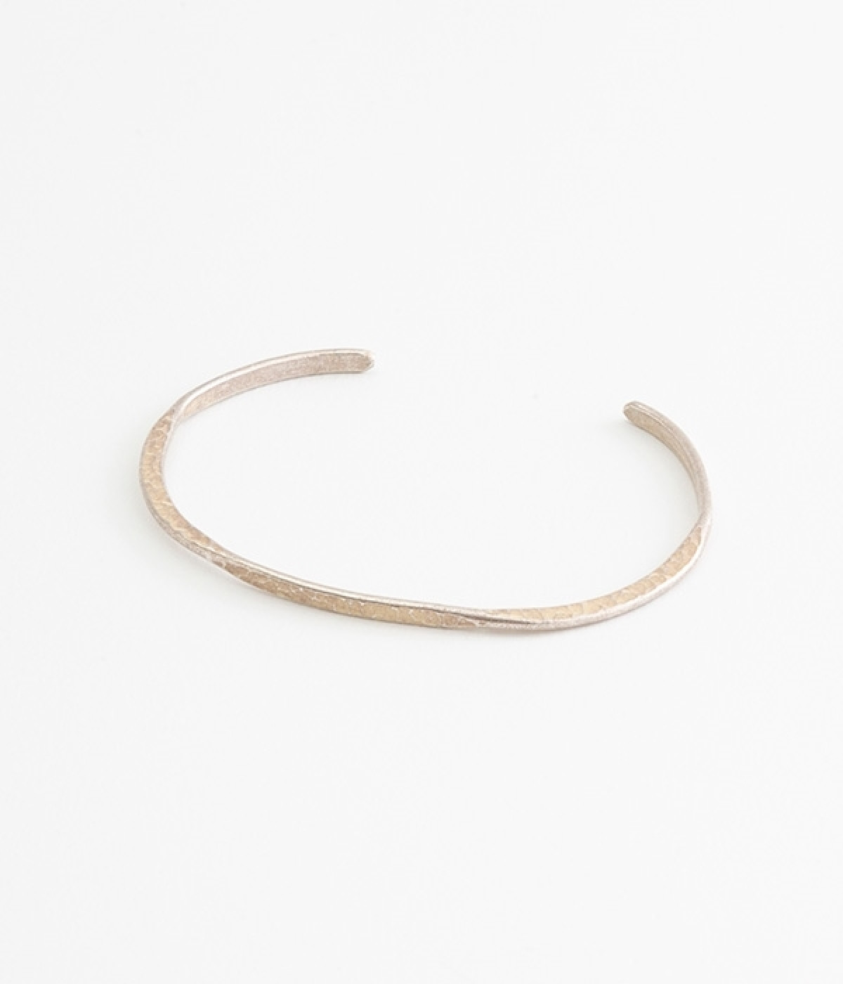 金槌を表面に打ちつけて槌の跡を残す、鎚目加工によって作られたバングルです。真鍮に上面・側面から鎚目加工を施し、ヒネリを加えたような有機的な線を表現。さりげない個性や温かみを感じさせるデザインに仕上がりました。普段のカジュアルな着こなしにも、きれいめな着こなしにもぴったり。手元を女性らしく、エレガントに見せてくれます。