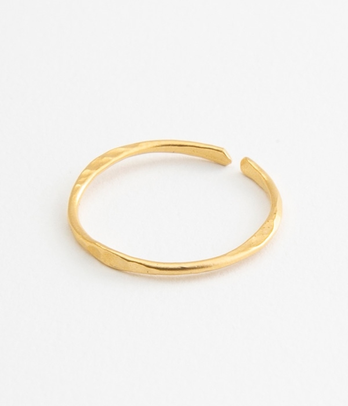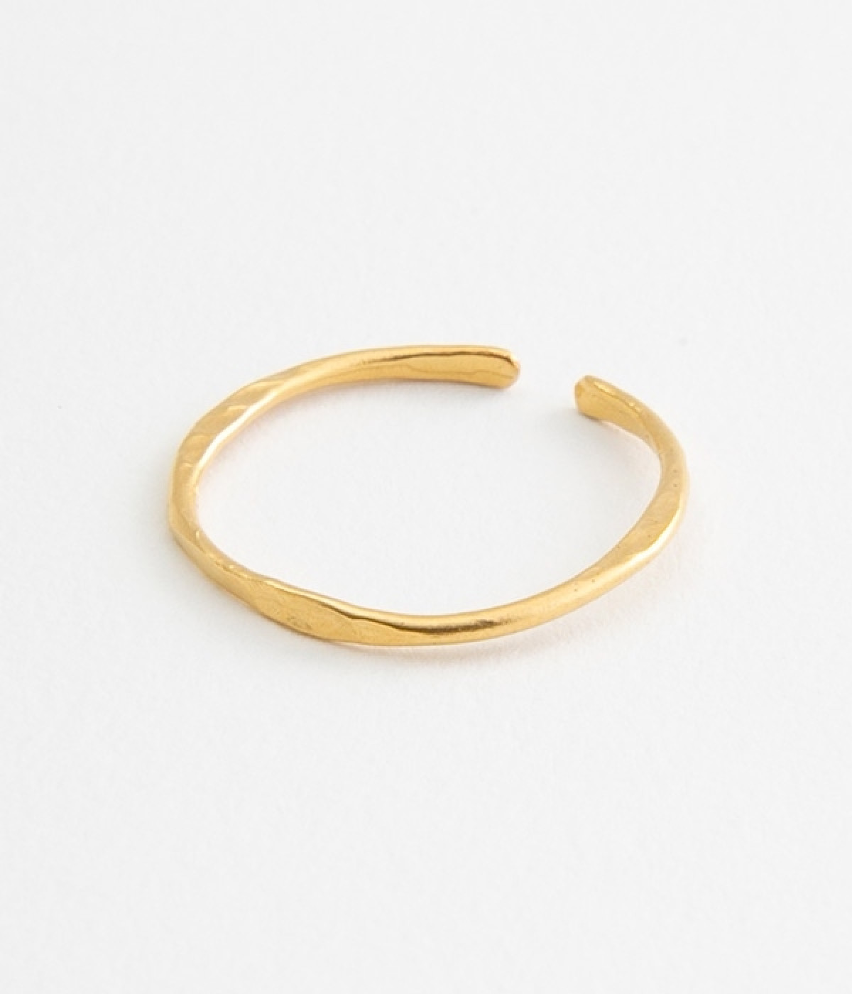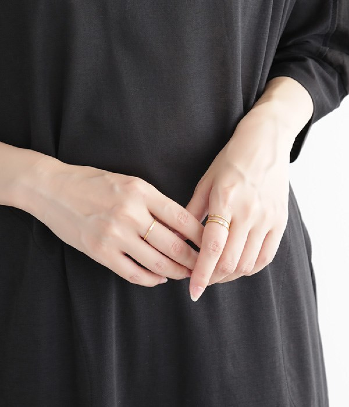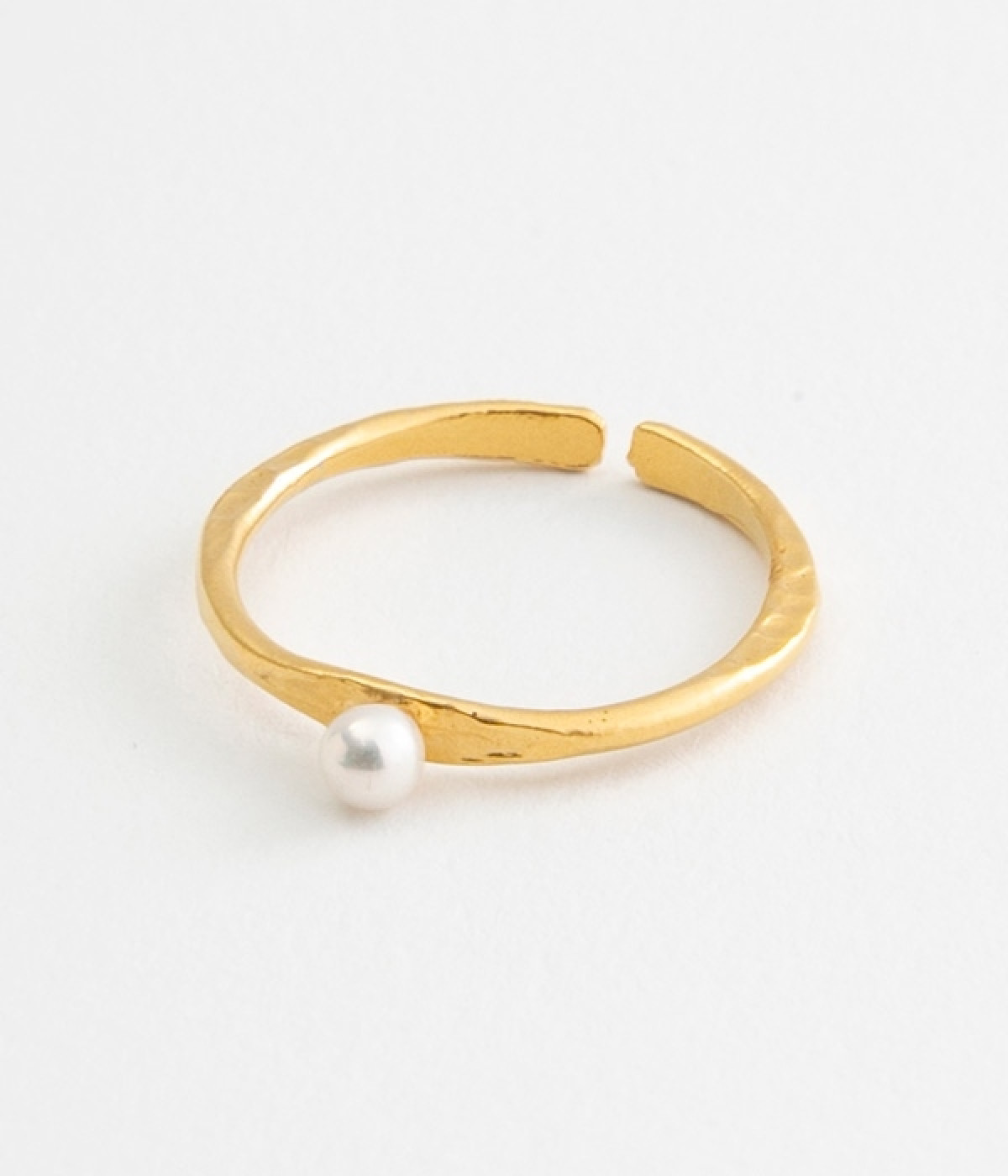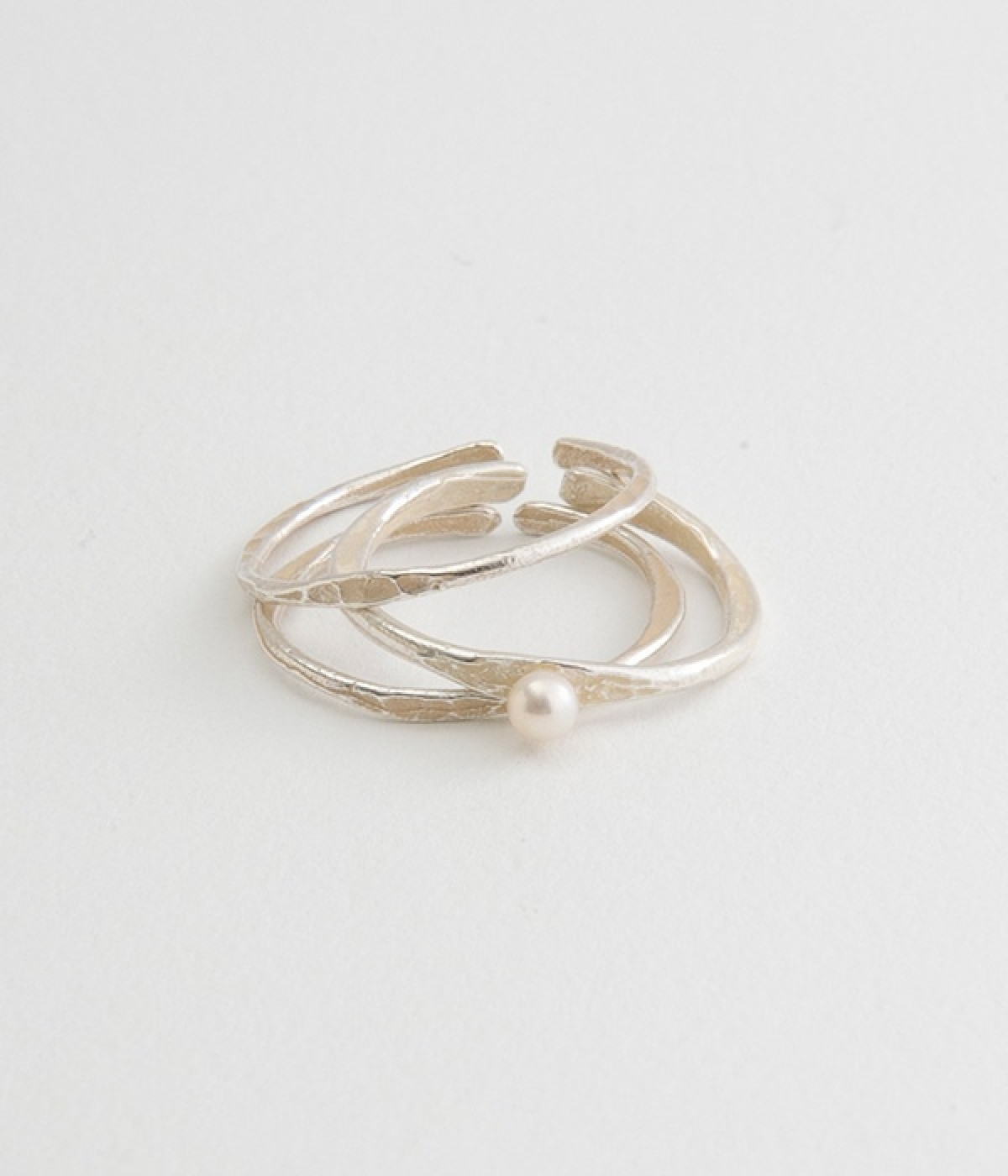 金槌を表面に打ちつけて槌の跡を残す、鎚目加工によるリングの3点セットです。真鍮に上面・側面から鎚目加工を施し、ヒネリを加えたような有機的な線を表現。さりげない個性や温かみを感じさせるデザインに仕上がりました。装飾なしのシンプルなタイプが2点に、貝パールをあしらったタイプが1点。重ねづけはもちろん、単品でつけたり、他のアイテムと組み合わせたり、さまざまなアレンジが楽しめるのも魅力です。
