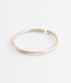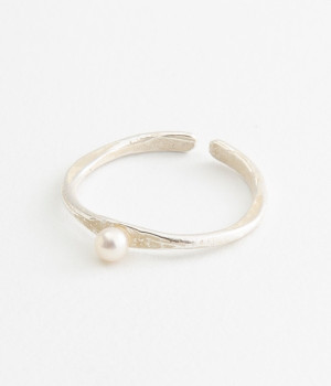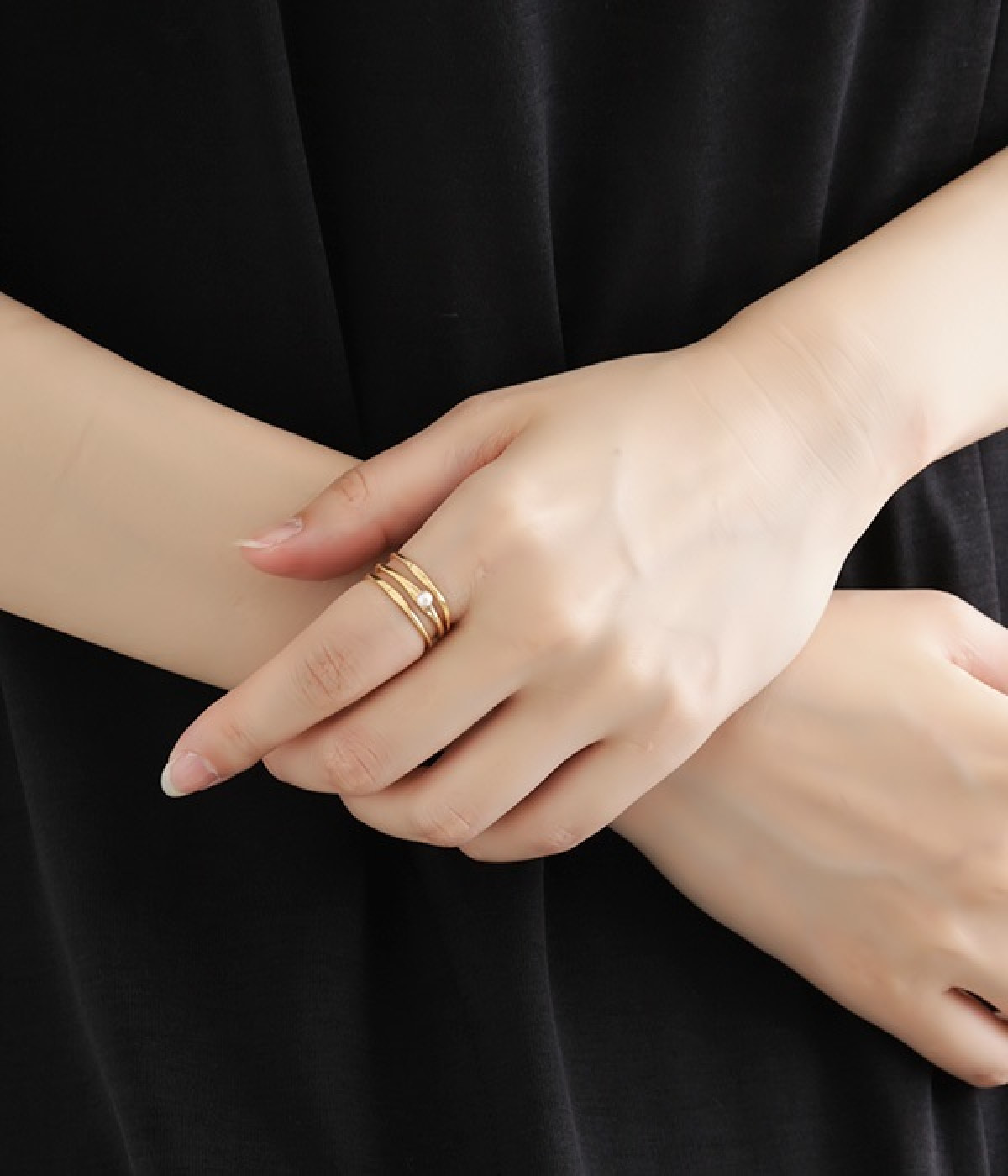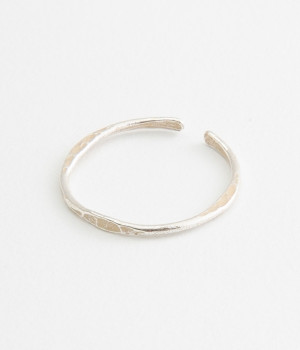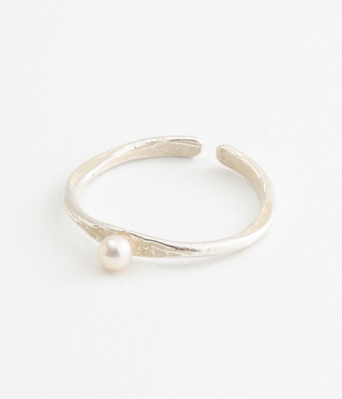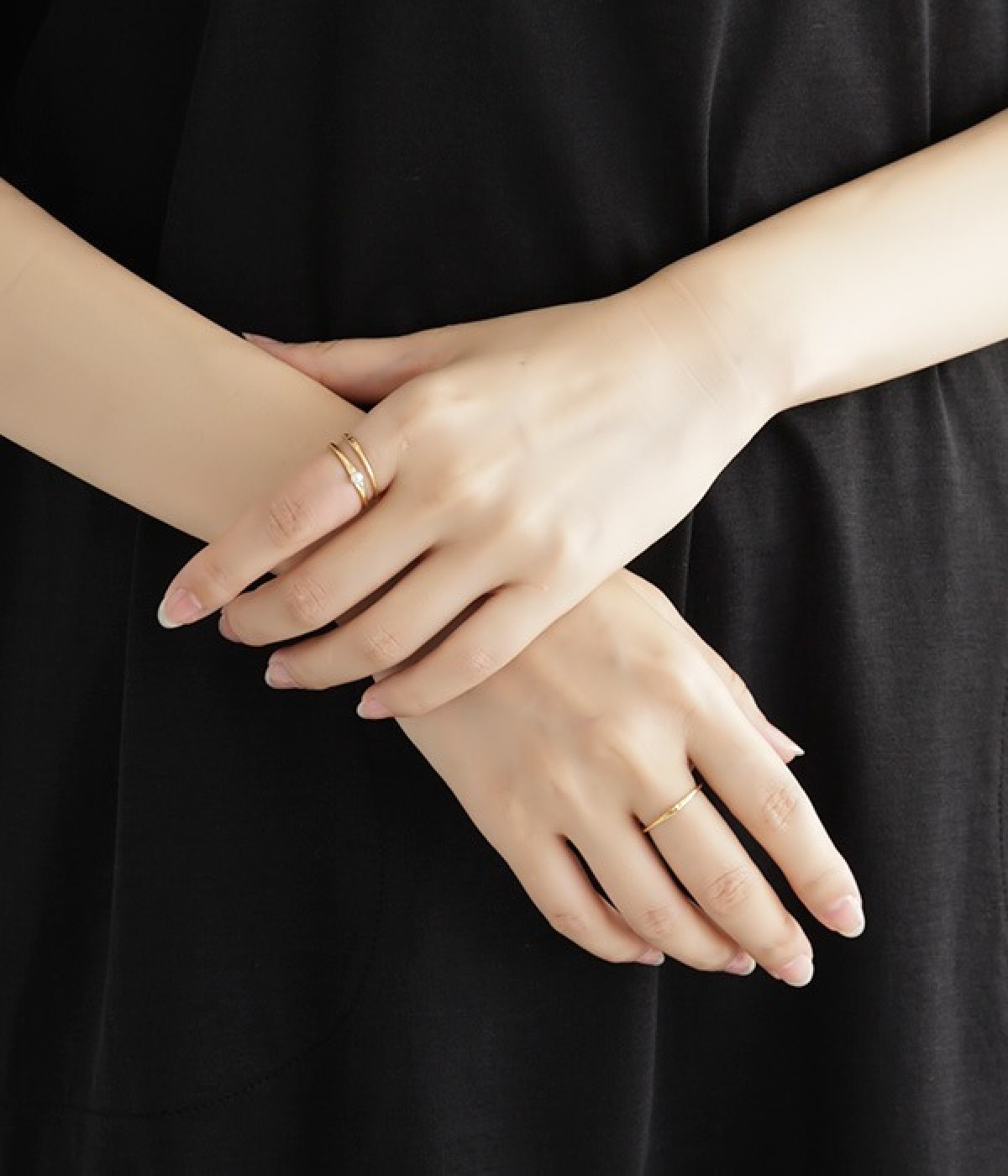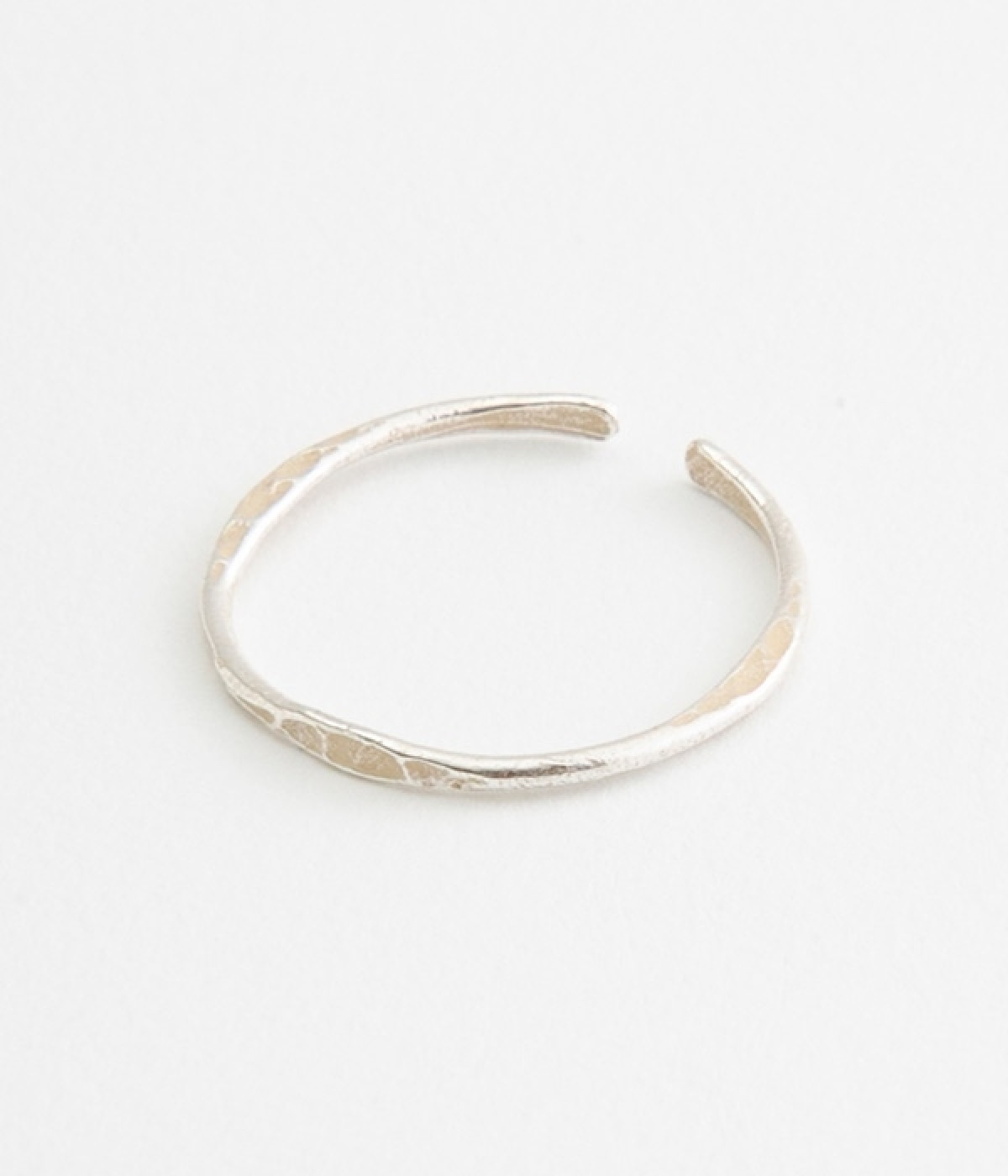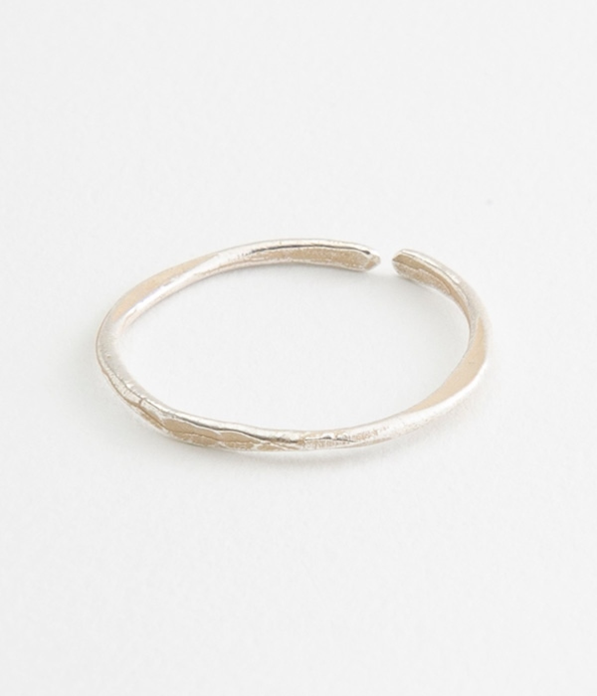 金槌を表面に打ちつけて槌の跡を残す、鎚目加工によるリングの3点セットです。真鍮に上面・側面から鎚目加工を施し、ヒネリを加えたような有機的な線を表現。さりげない個性や温かみを感じさせるデザインに仕上がりました。装飾なしのシンプルなタイプが2点に、貝パールをあしらったタイプが1点。重ねづけはもちろん、単品でつけたり、他のアイテムと組み合わせたり、さまざまなアレンジが楽しめるのも魅力です。