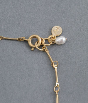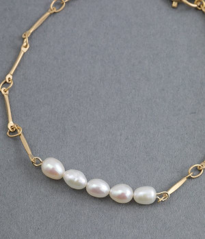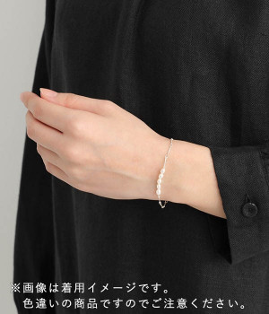 プレス加工を施したコマを繋いだチェーンとライス型淡水パールを組み合わせたブレスレットです。淡水パールの柔和なニュアンスとチェーンのシャープな素材をミックスした、シンプルでモダンなデザイン。寂しくなりがちな手もとに、上品なニュアンスを添えてくれます。お呼ばれなどの華やかなシーンにも、普段使いにもおすすめ。