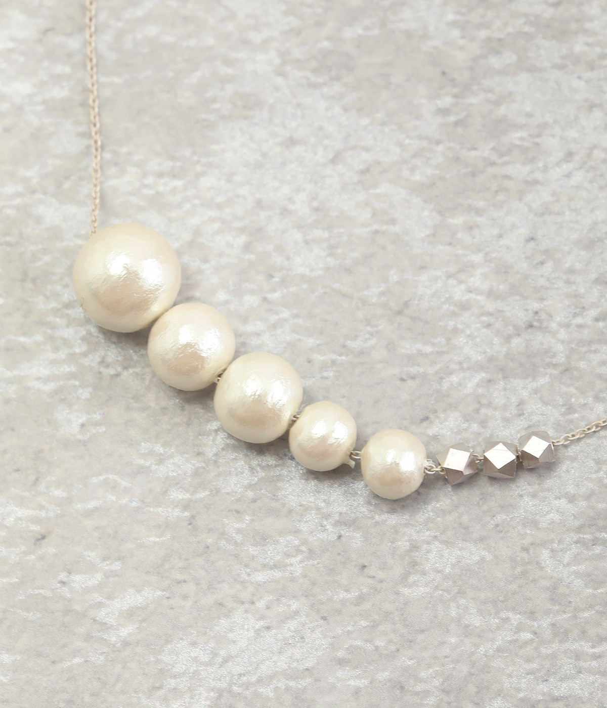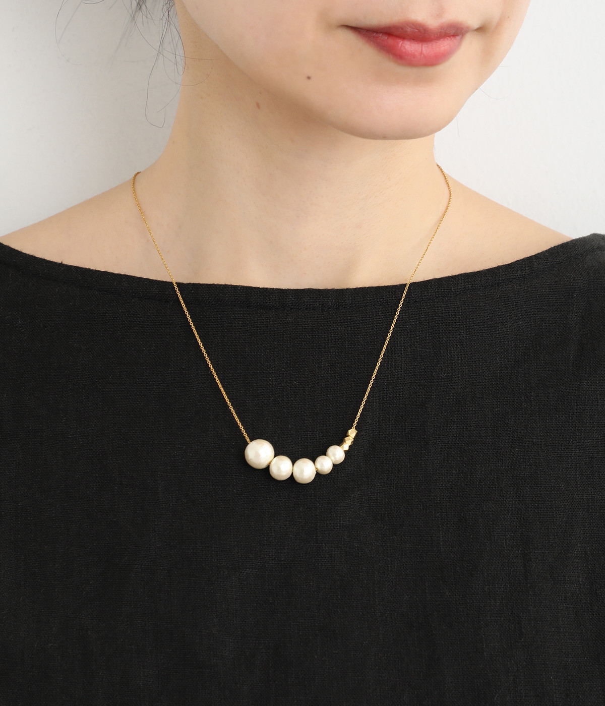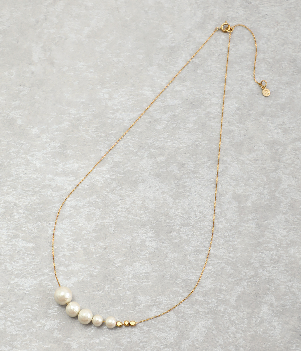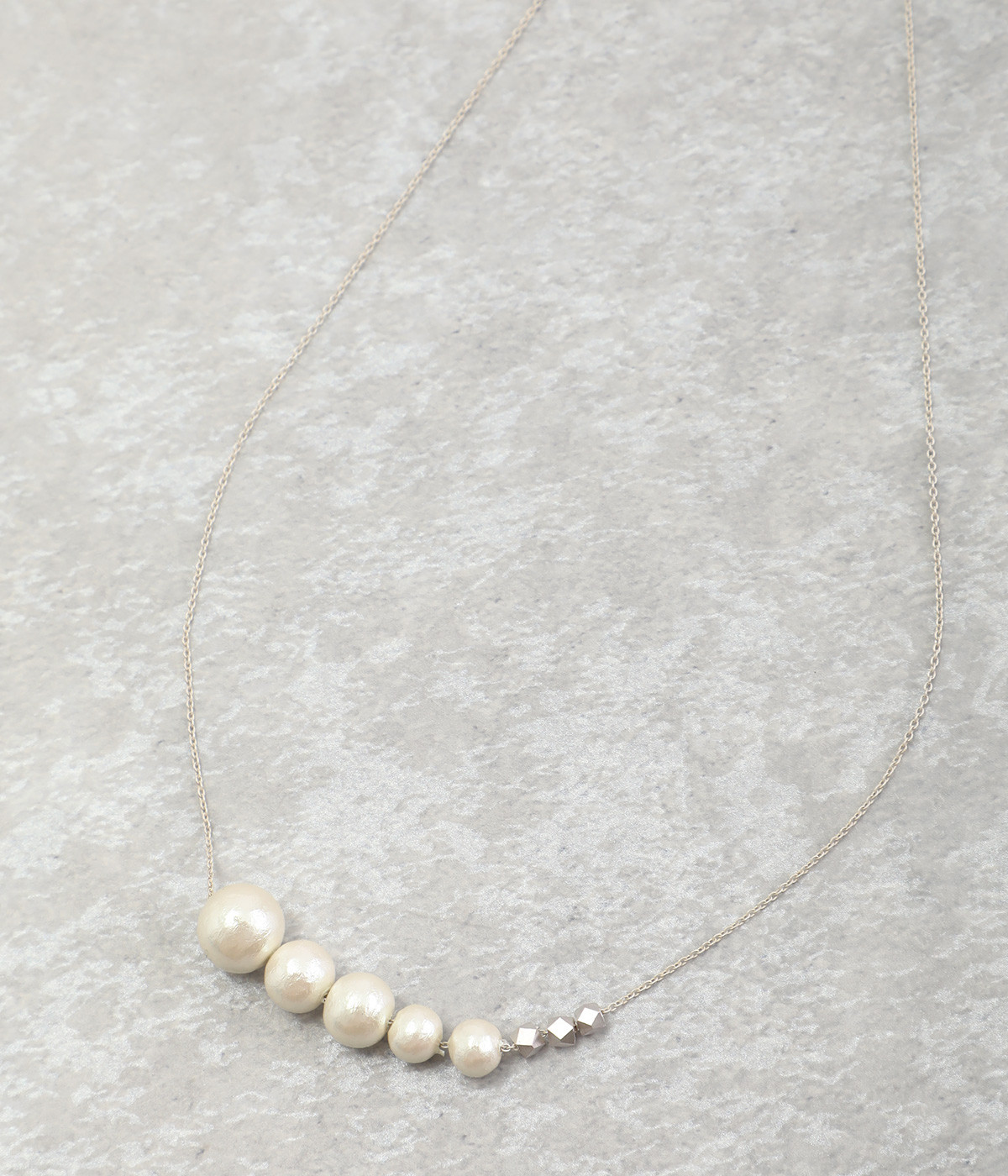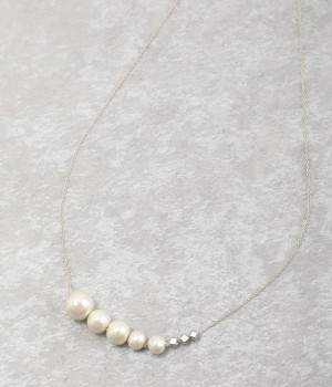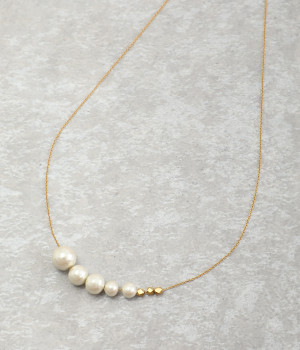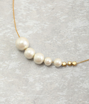 サイズの異なるコットンパールをグラデーションのように連ねたセミロングタイプのネックレス。装いのバランスに合わせて、45cmと50cmの2段階で長さ調節が可能です。