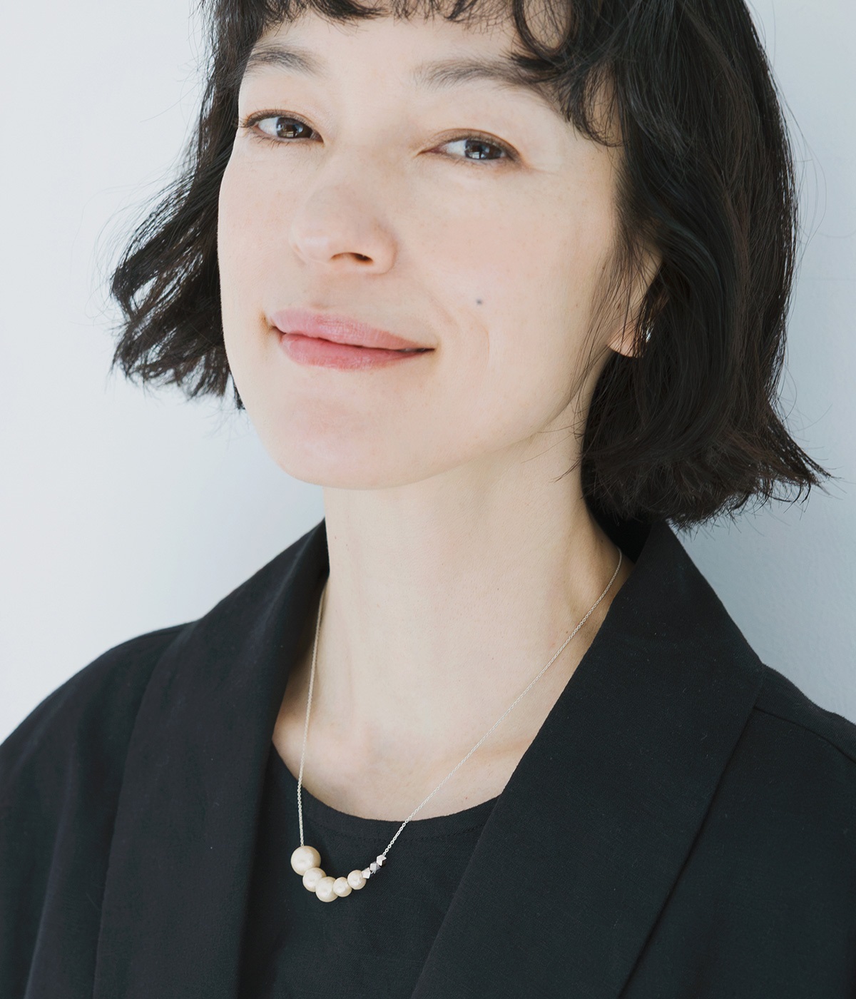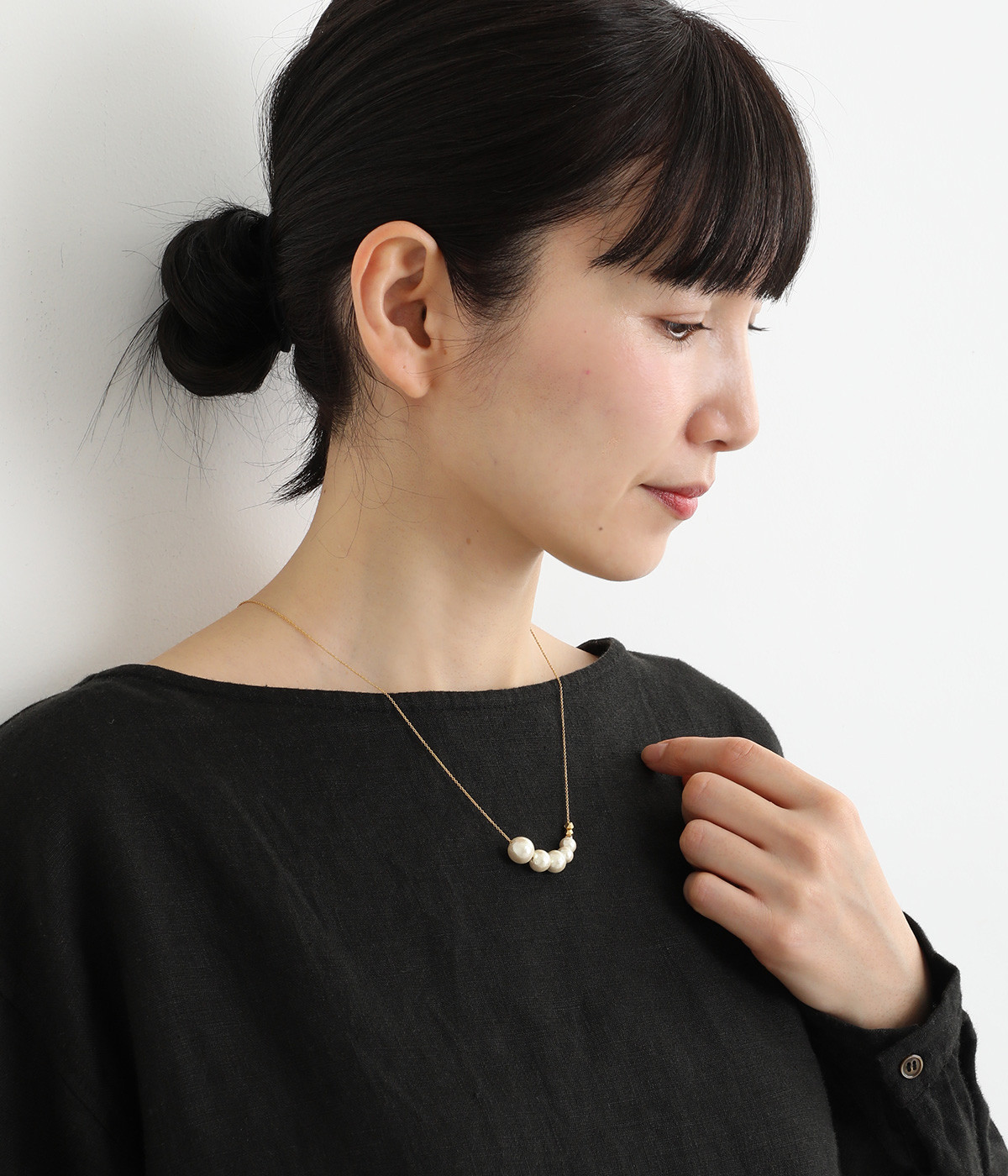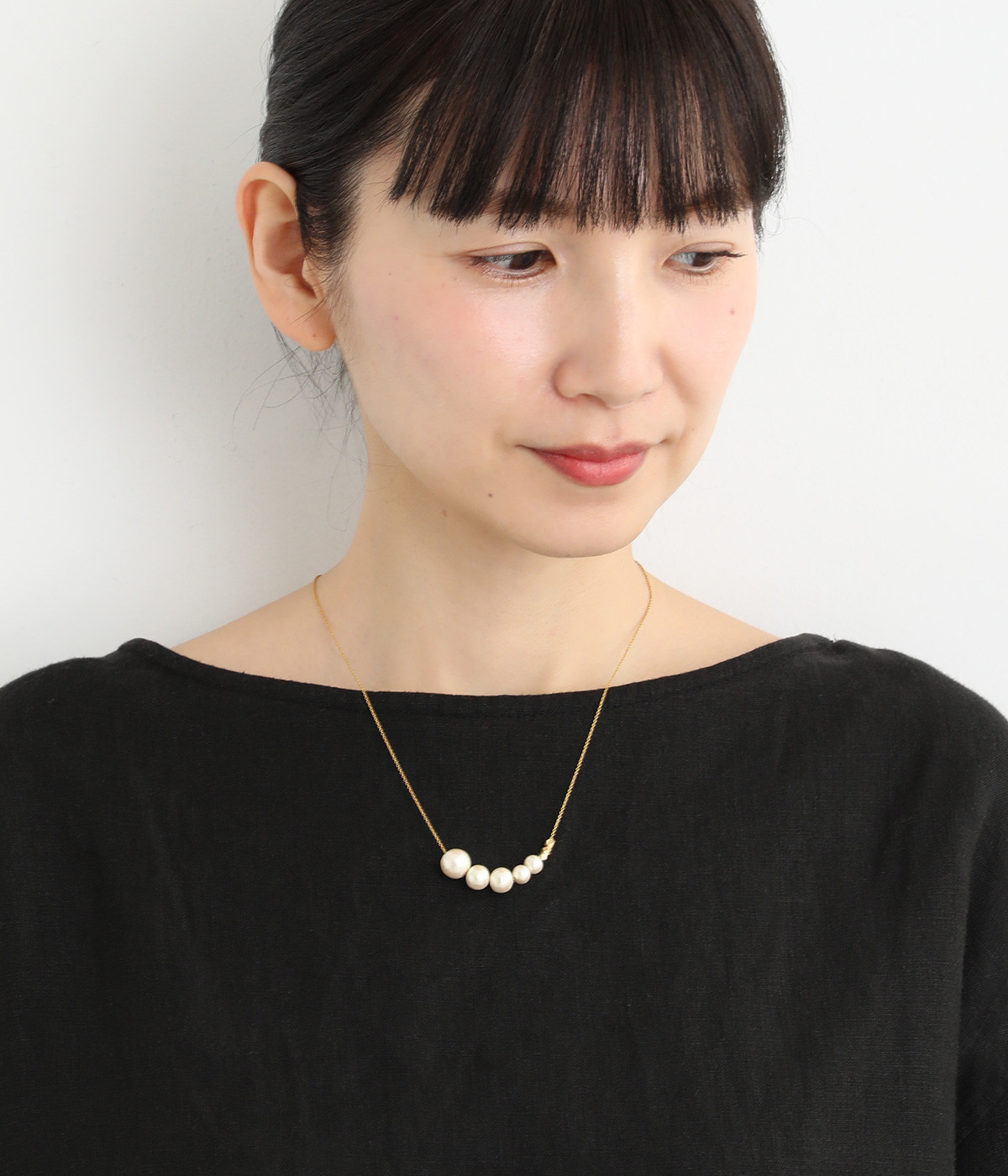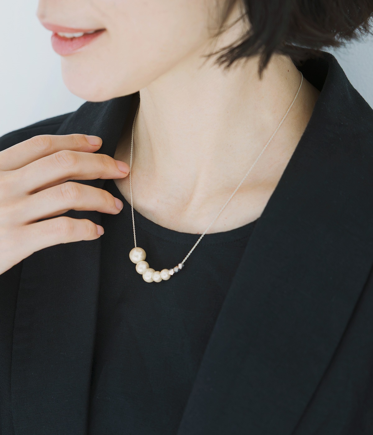 サイズの異なるコットンパールをグラデーションのように連ねたセミロングタイプのネックレス。装いのバランスに合わせて、45cmと50cmの2段階で長さ調節が可能です。