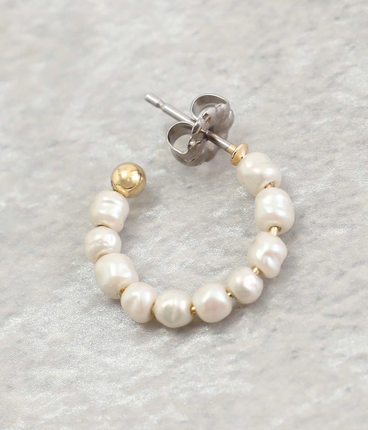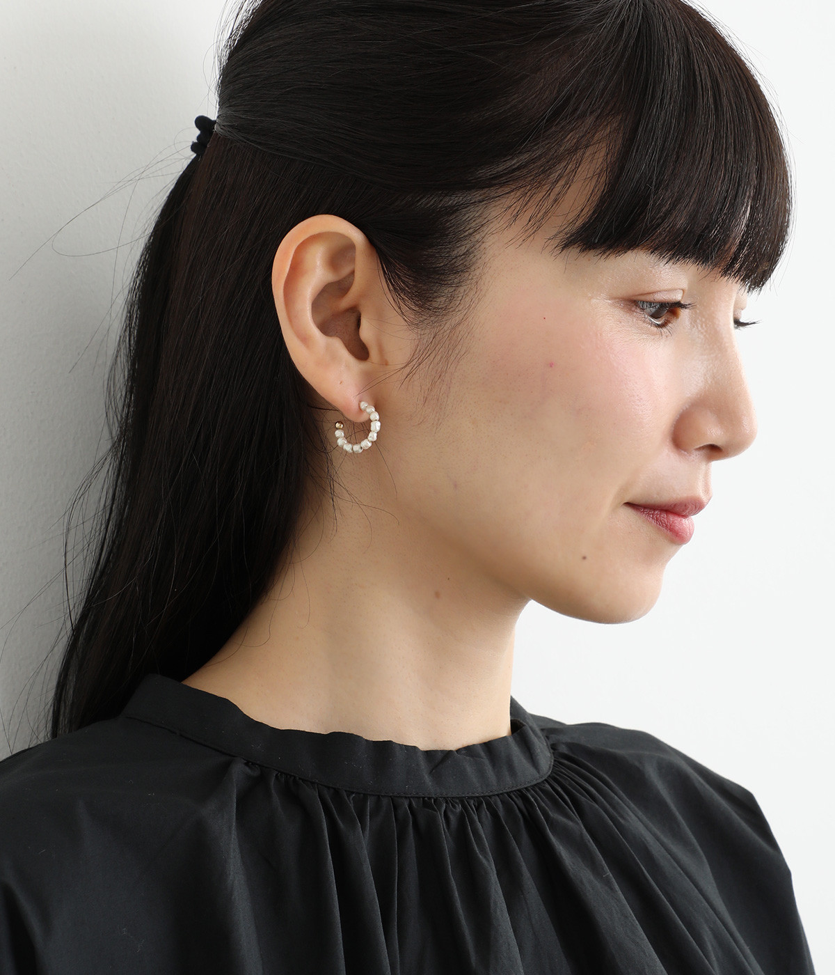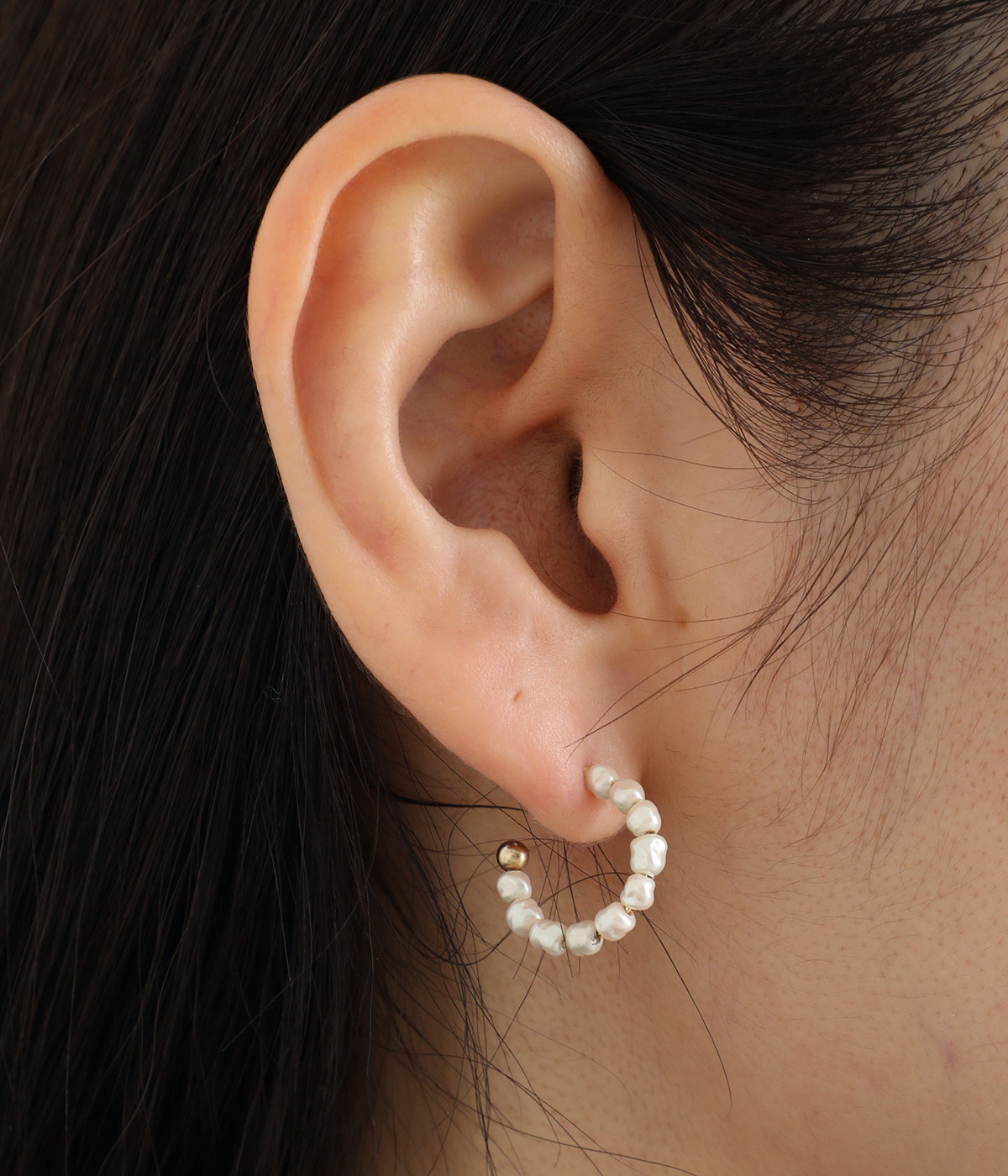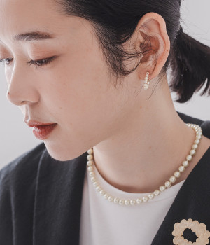 小さなガラスパールが並んだ美しいフープピアス。パールのネックレスと組み合わせれば、まとまりのあるスタイリングが完成。