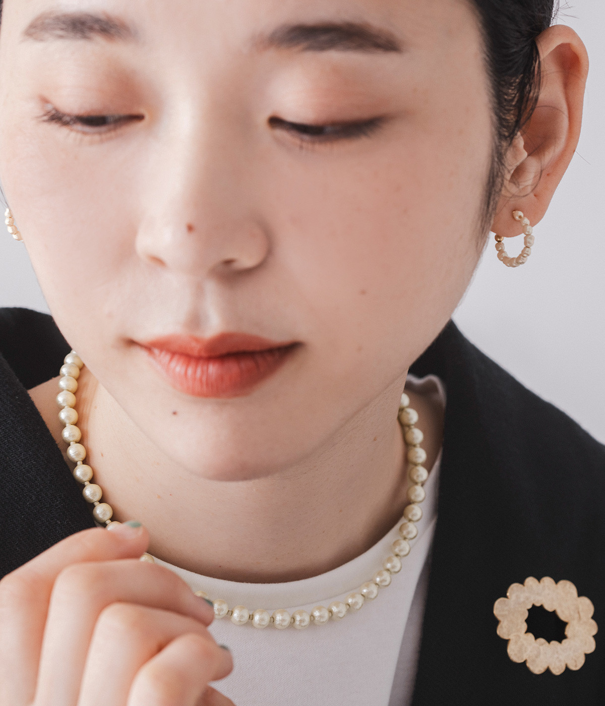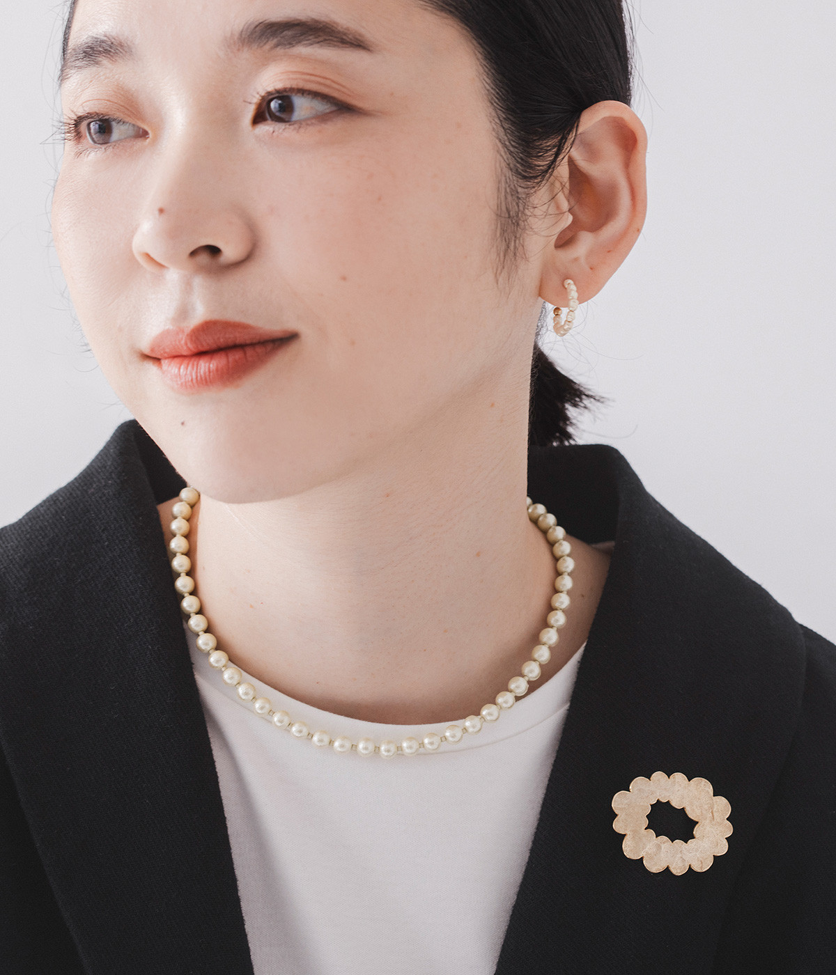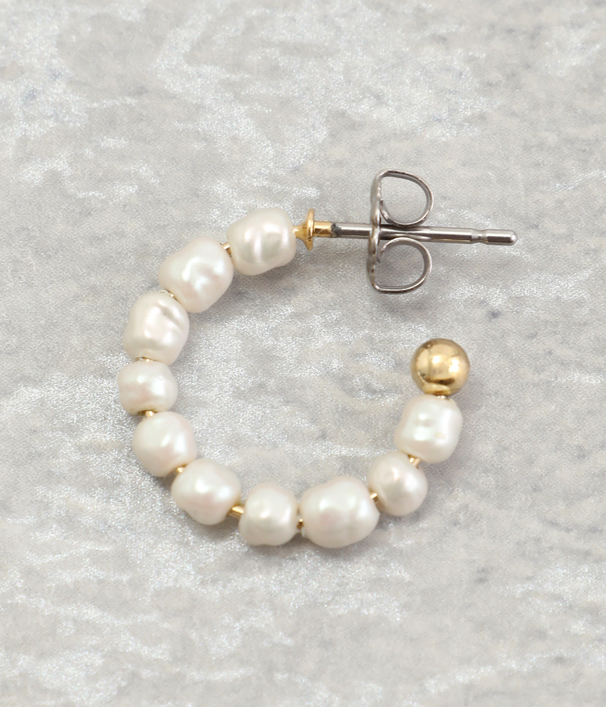 小さなガラスパールが並んだ美しいフープピアス。パールのネックレスと組み合わせれば、まとまりのあるスタイリングが完成。