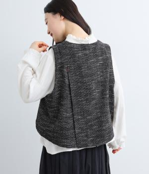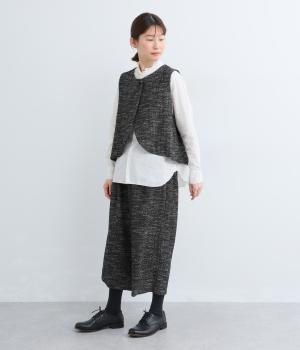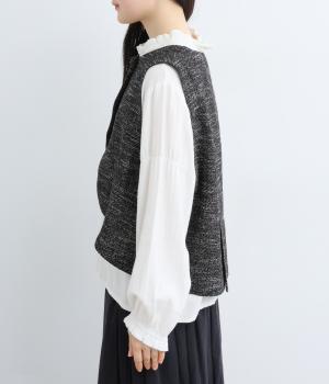 短く仕立てた前立ての曲線と、うしろの重ねた生地が立体的なシルエットを織りなすベストです。かわいらしい雰囲気を上品なツイード風の生地が中和し、きちんと感を演出します。重ねるだけでスタイリングにさりげない個性を添えるアイテムです。