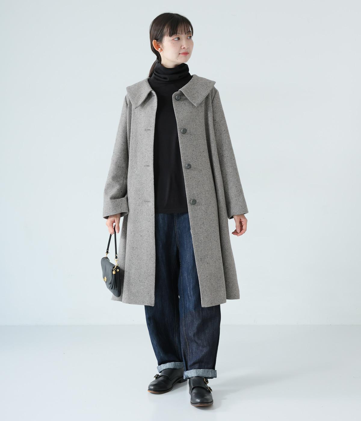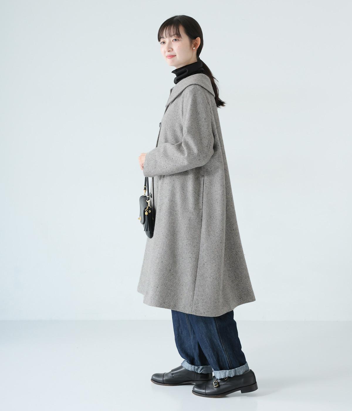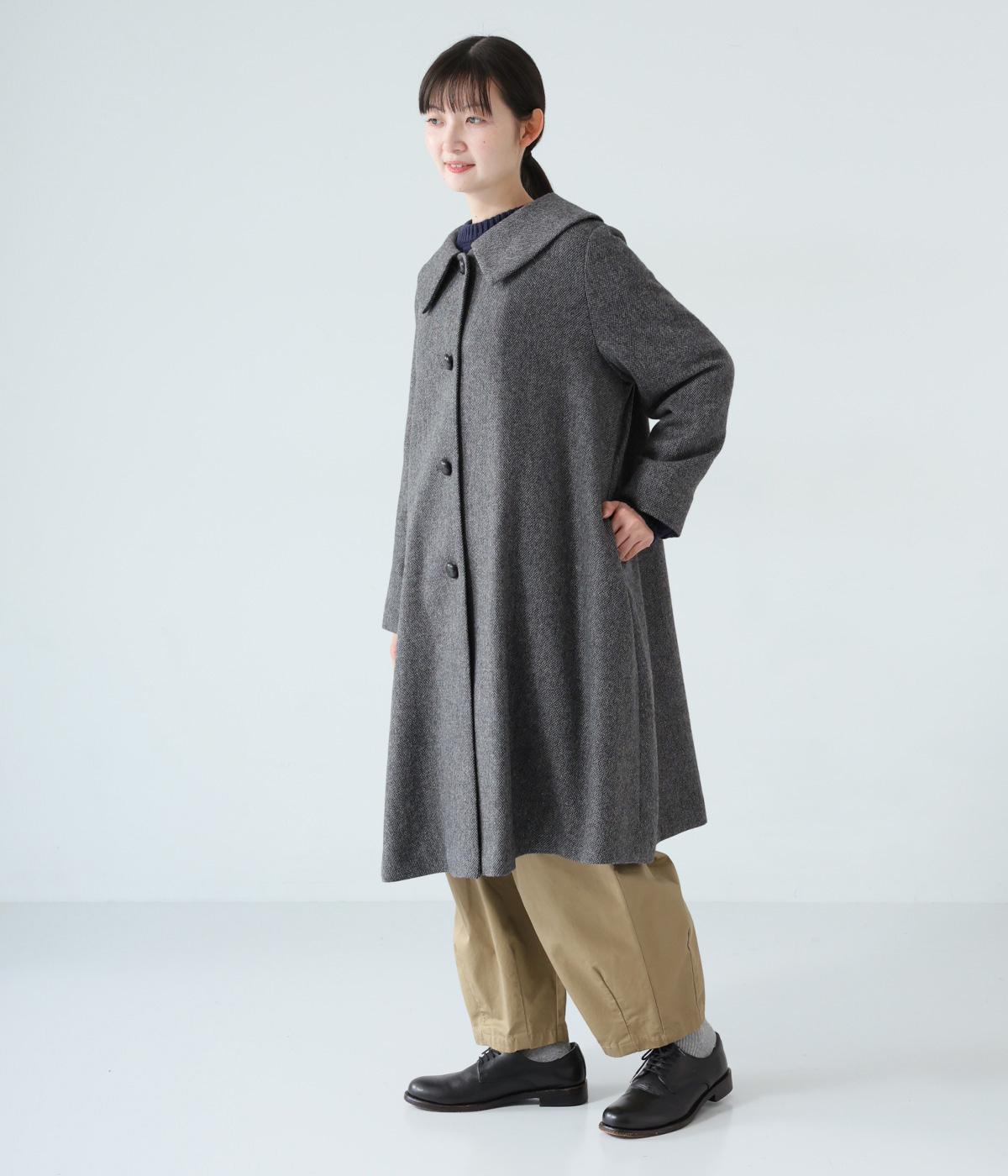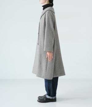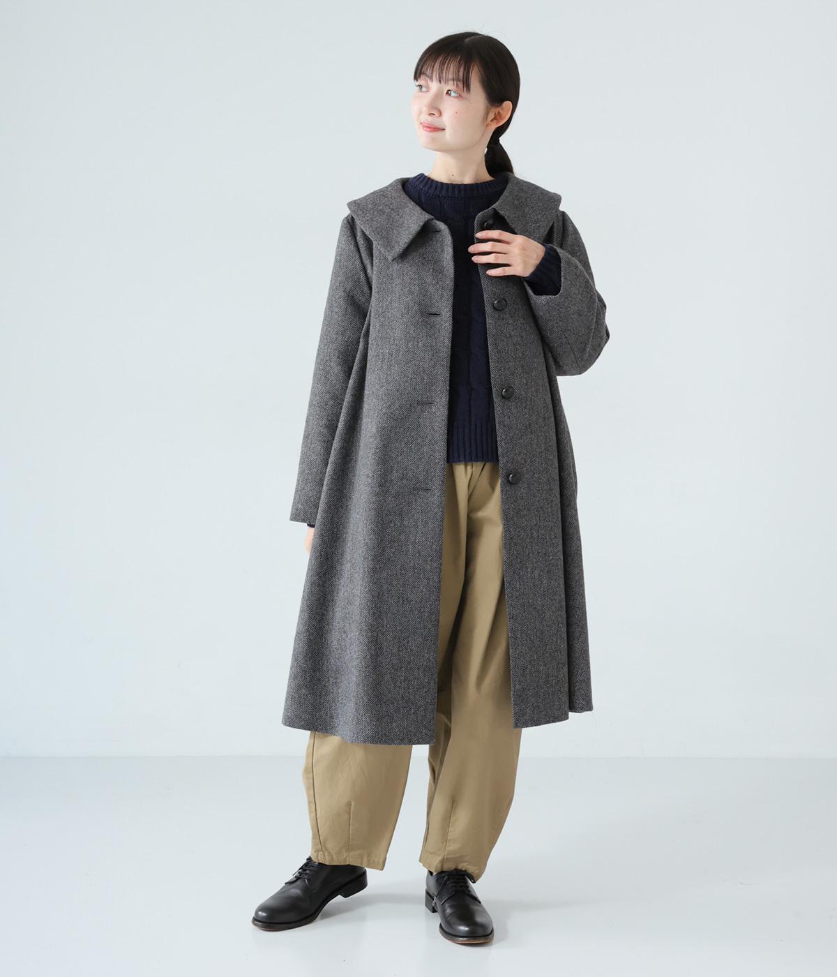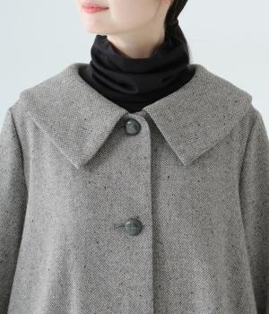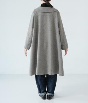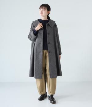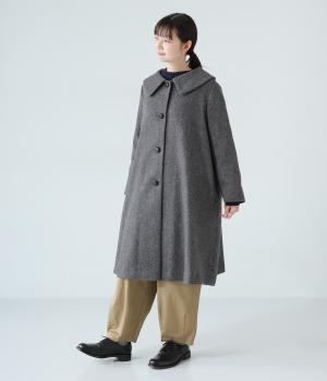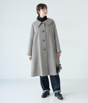 曲線を描く大きな襟がクラシカルなムードを運ぶコート。ドレープを描きながら裾に向かって広がるフレアシルエットが女性らしさをアップさせます。大きめのボタンを腰から上のみに配置して好バランスに。カジュアルにもきれいめにも羽織れる一着です。