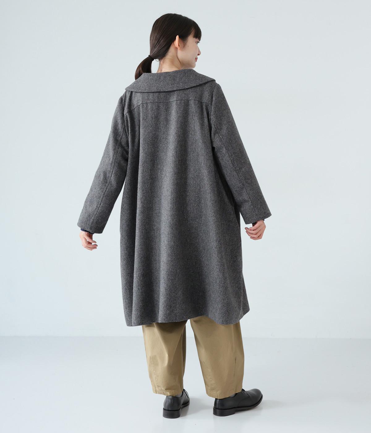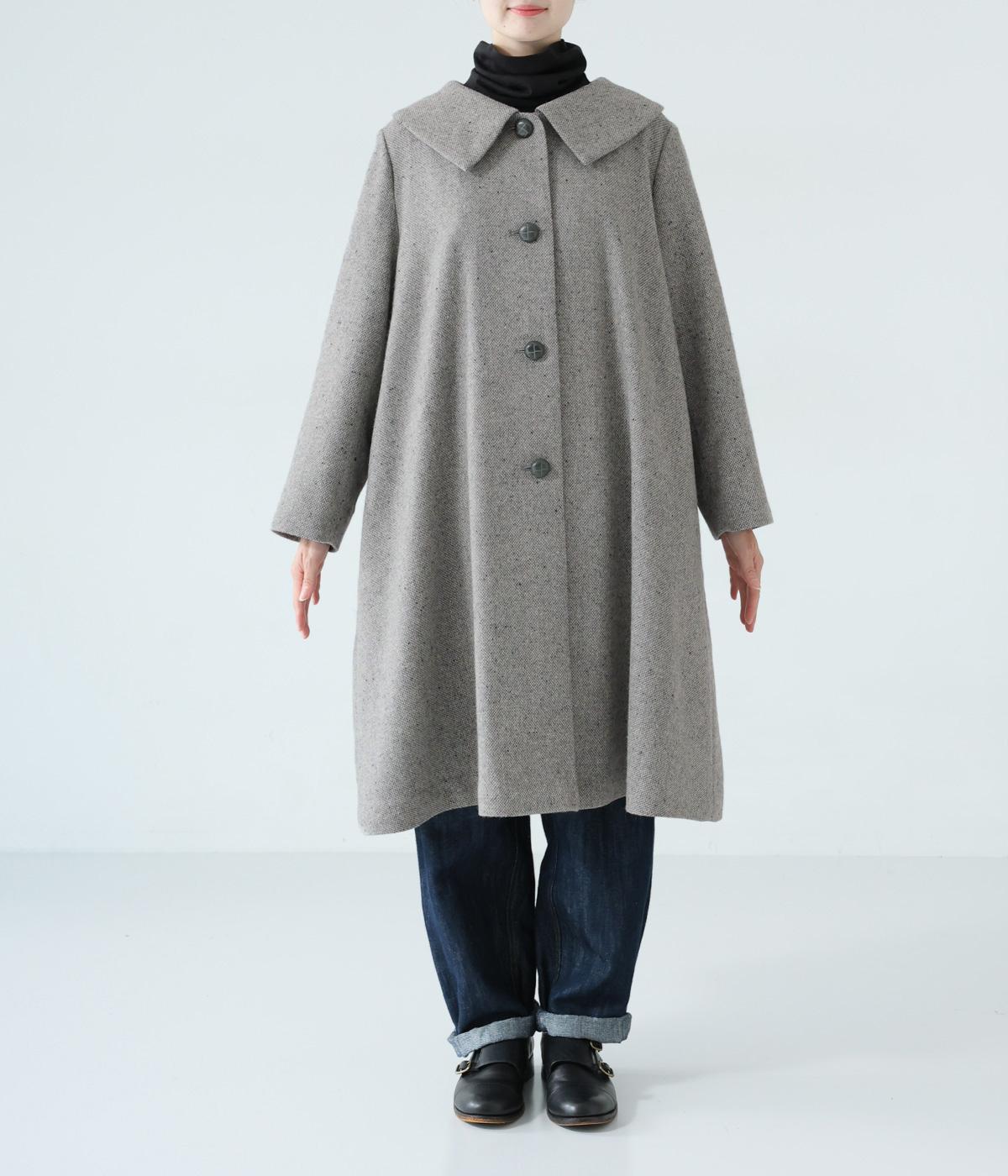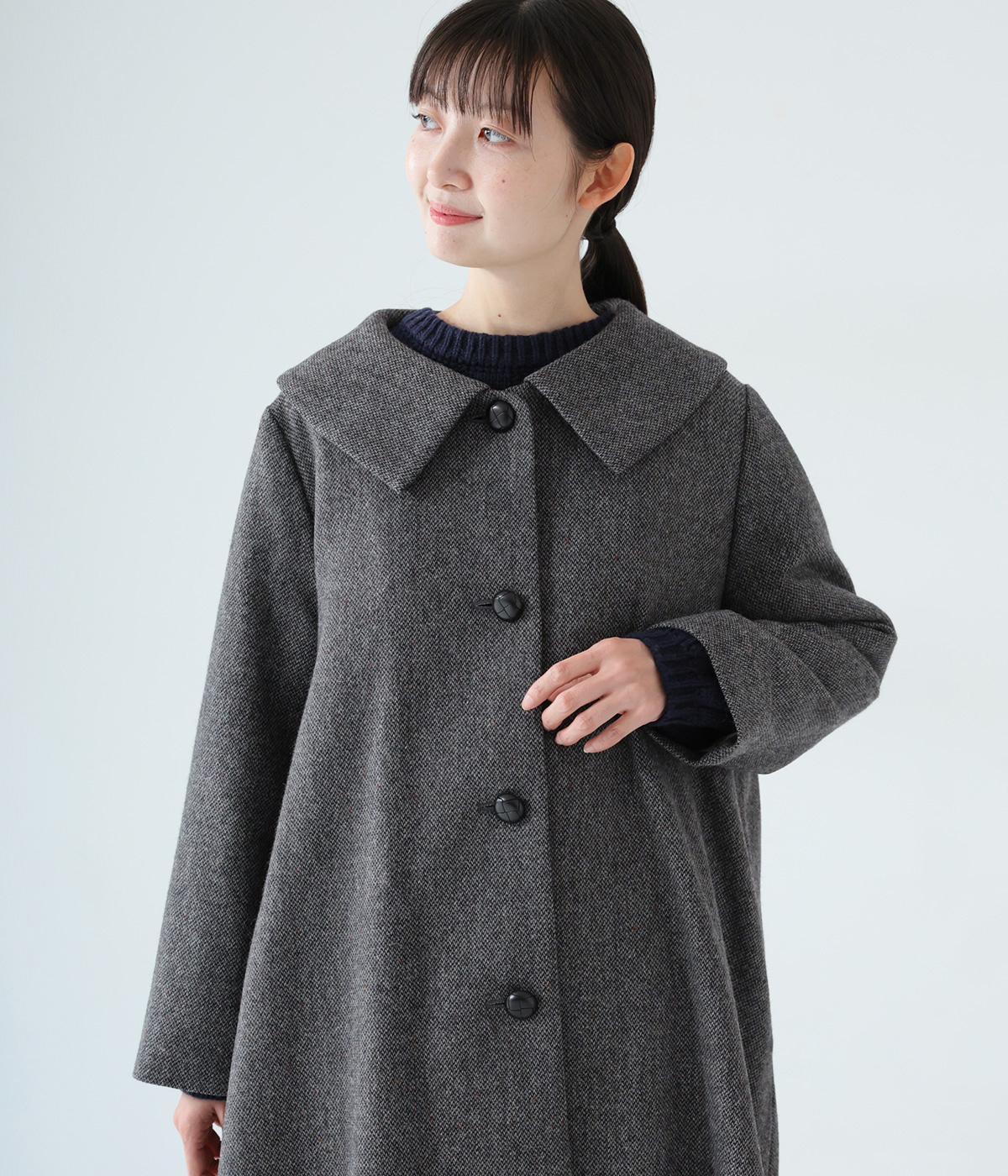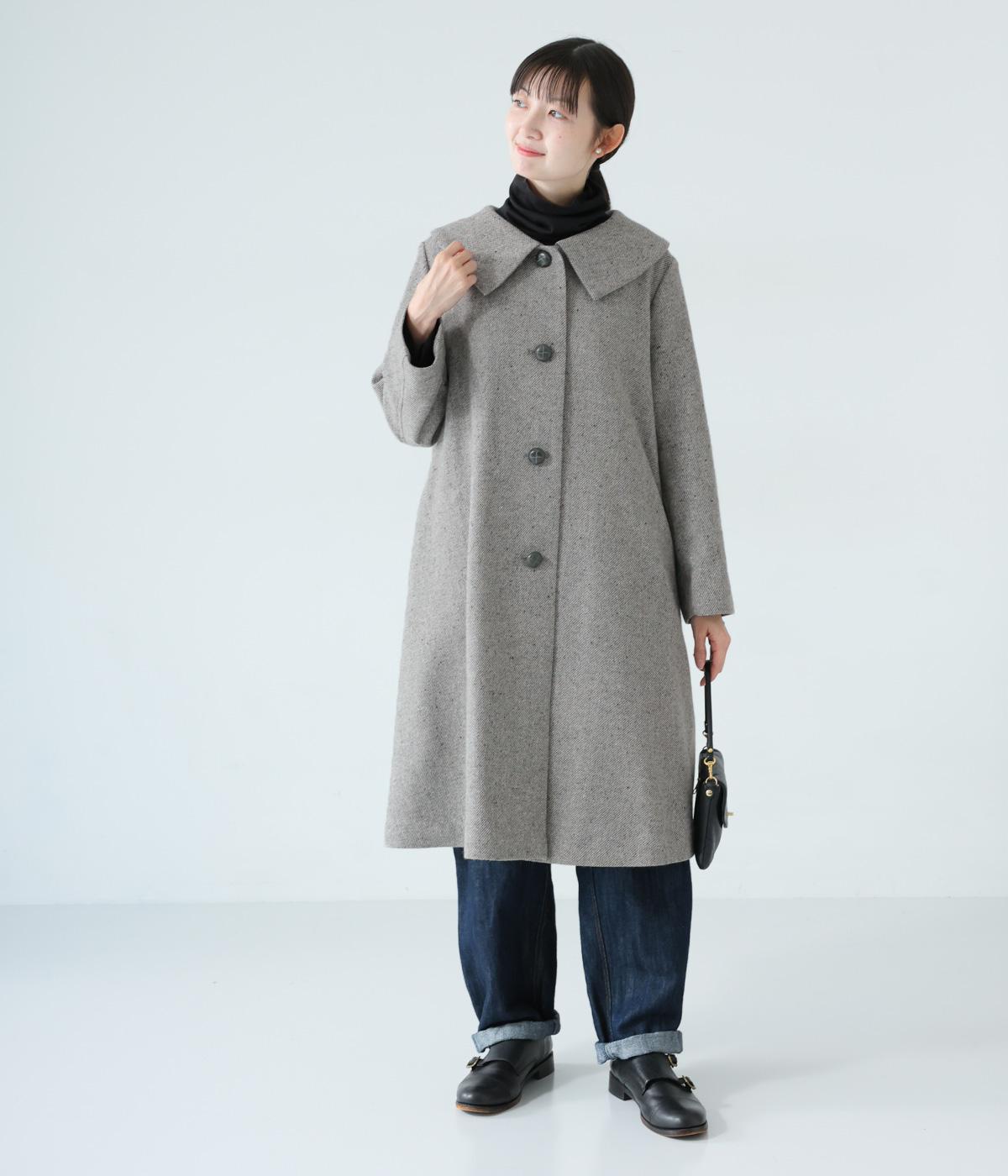 曲線を描く大きな襟がクラシカルなムードを運ぶコート。ドレープを描きながら裾に向かって広がるフレアシルエットが女性らしさをアップさせます。大きめのボタンを腰から上のみに配置して好バランスに。カジュアルにもきれいめにも羽織れる一着です。