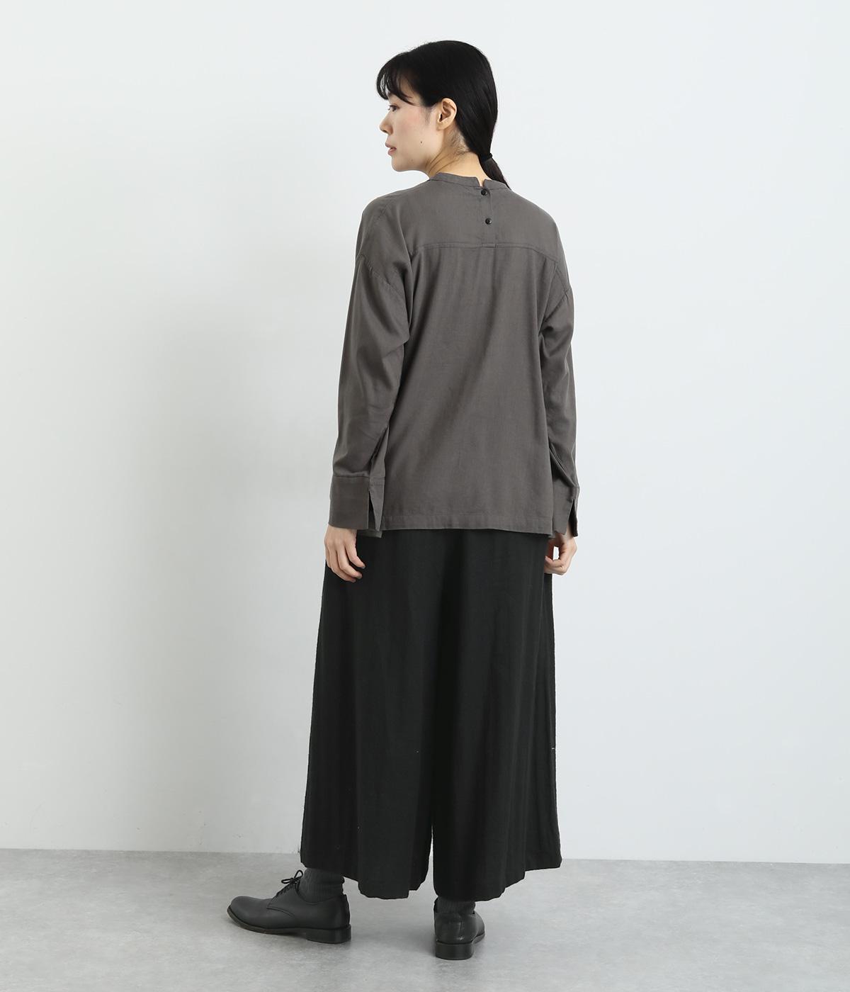 リネンのナチュラル感を活かしつつ、ウールをすこし混ぜてあたたかみをプラスしました。縫製後の製品洗いによる自然なシワ感や洗いざらしのような風合いがたのしめる生地です。