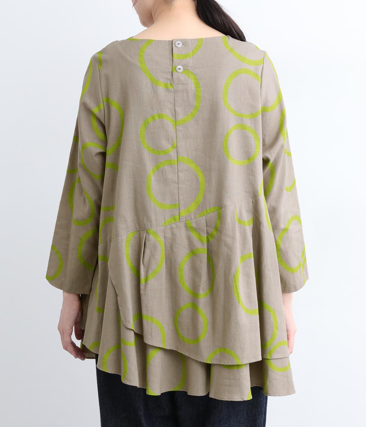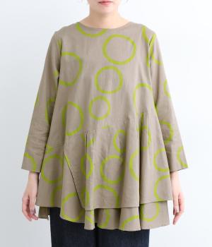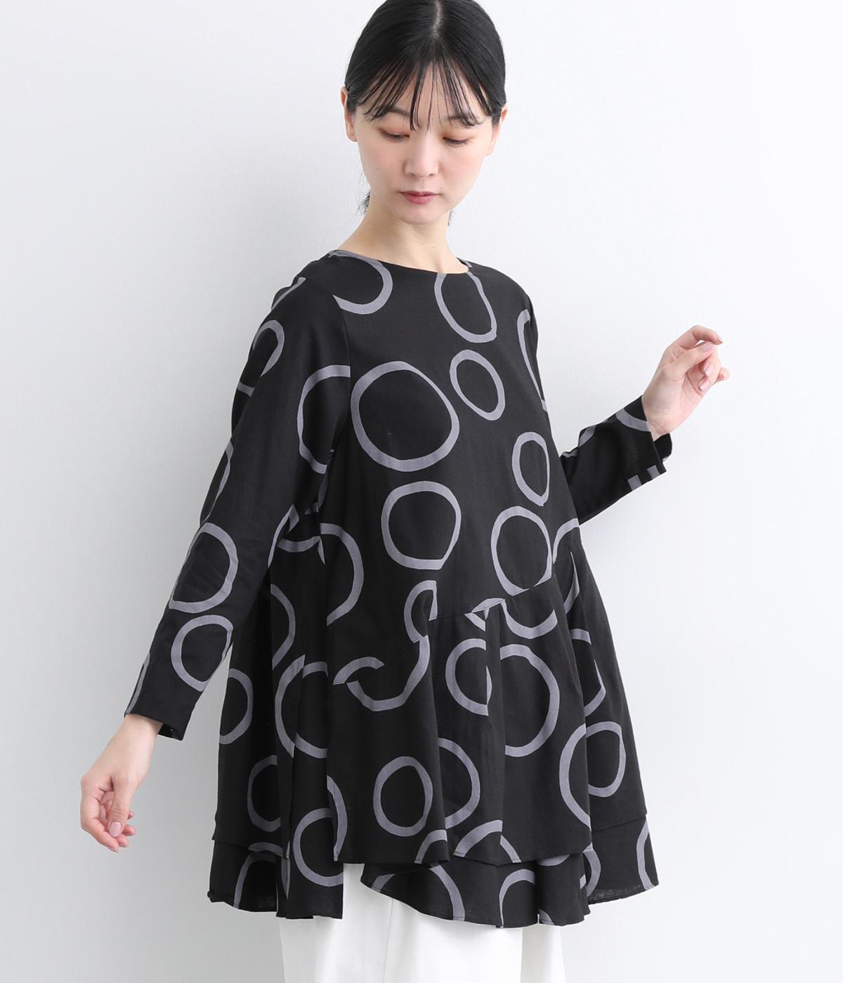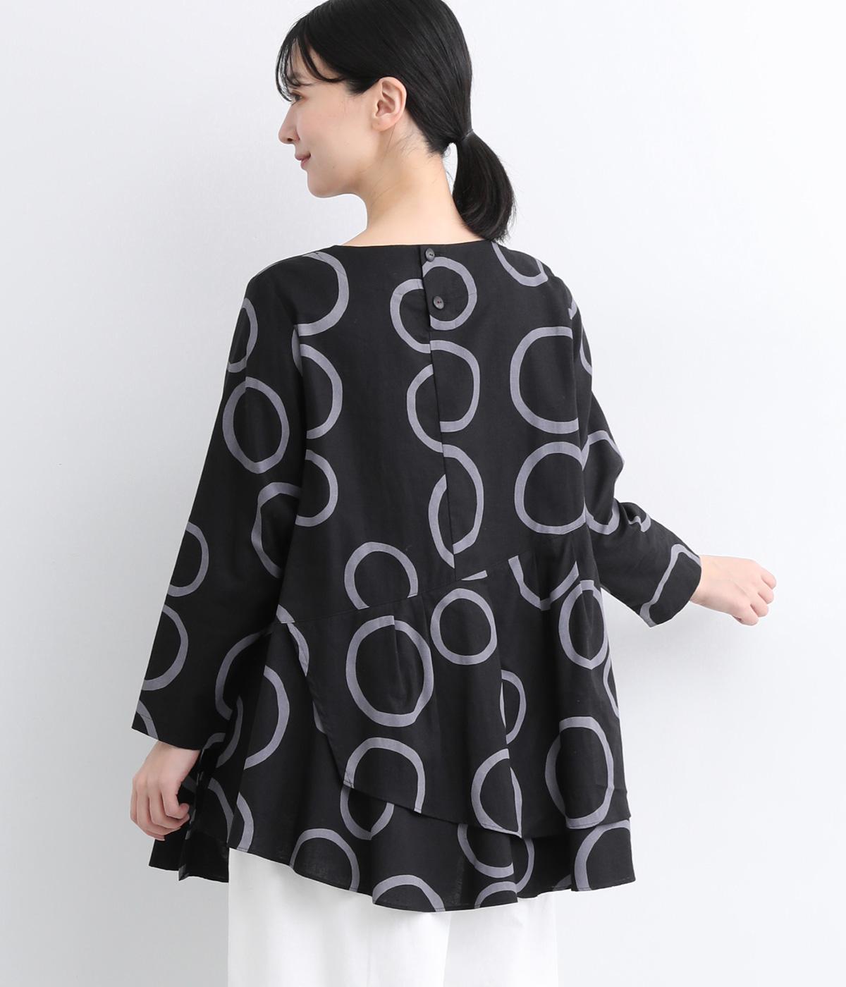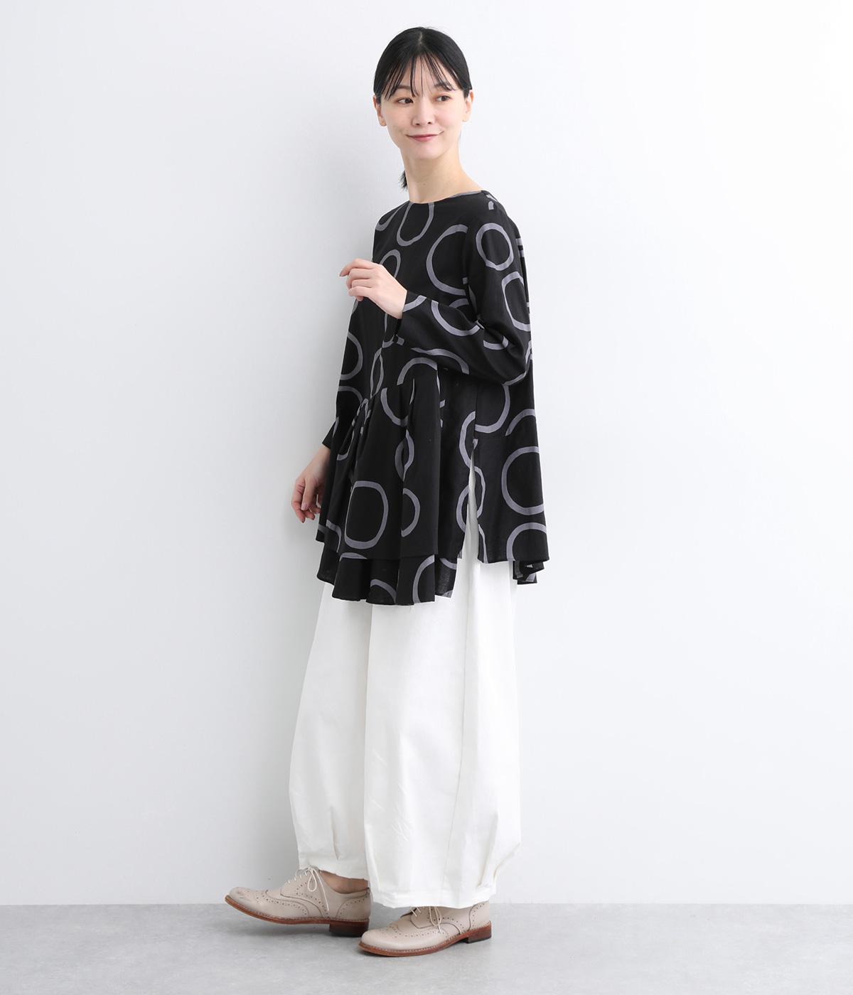 切り替えを斜めに入れて、生地を重ねたボリューミーなフレアシルエットが大人かわいい装いを演出するブラウスです。サイドにスリットを入れることで抜け感をプラス。配色のバブル柄がスタイリングの主役に。