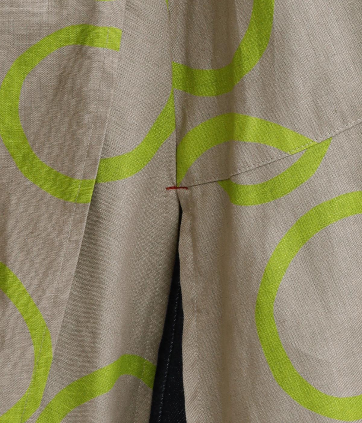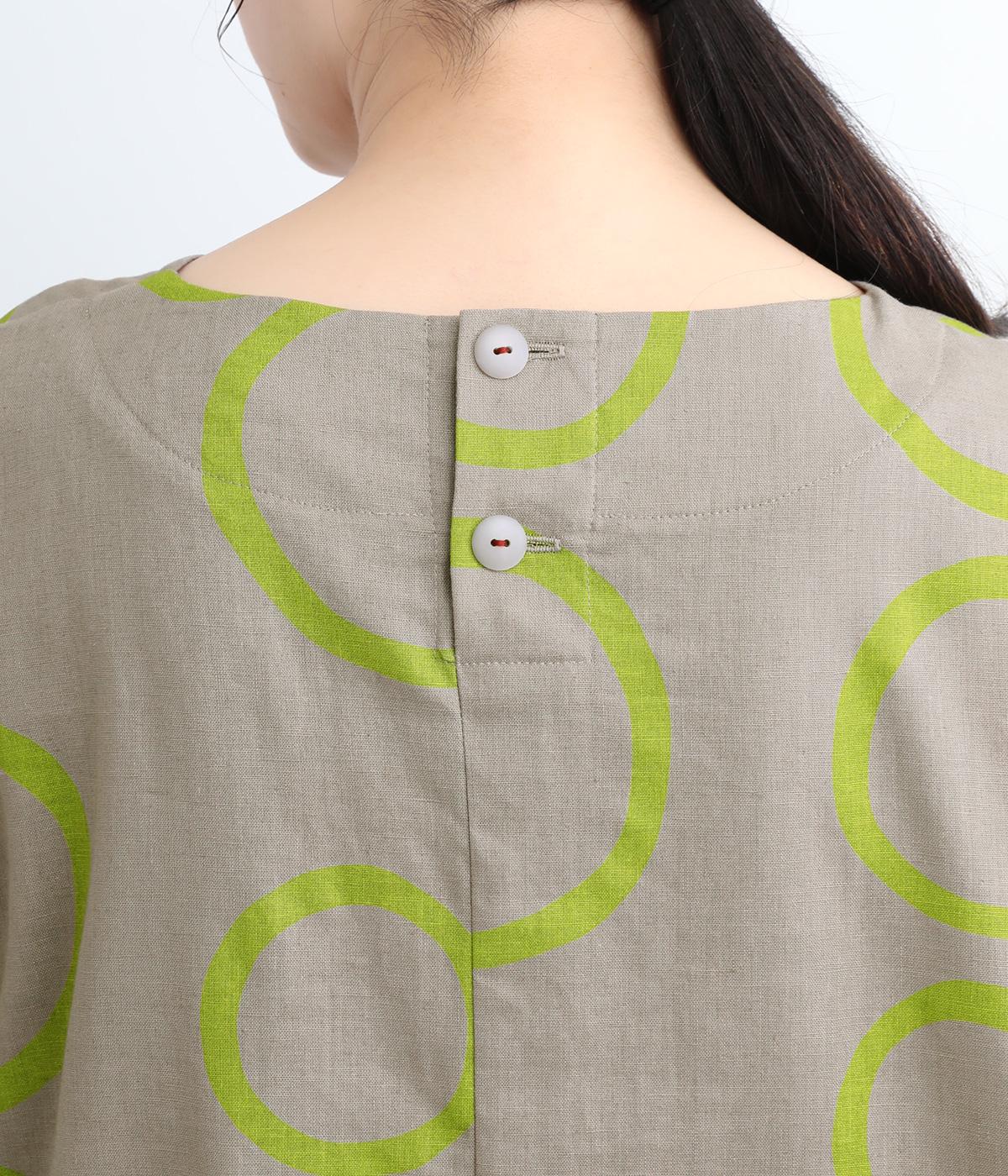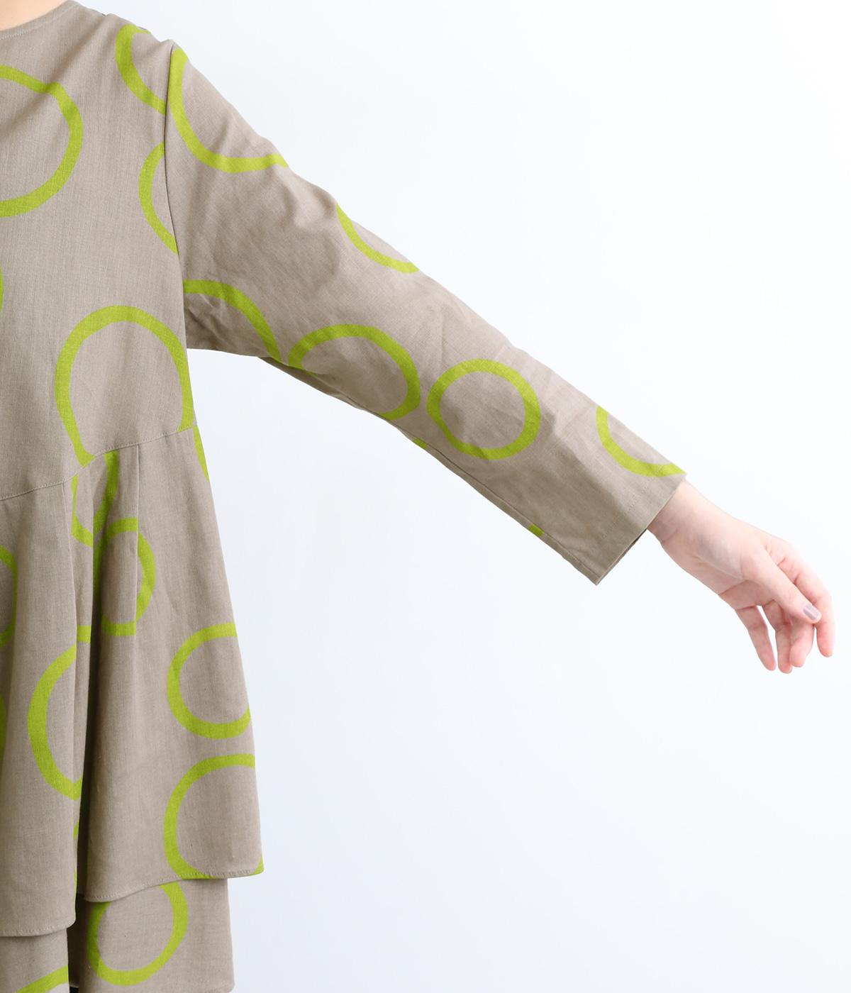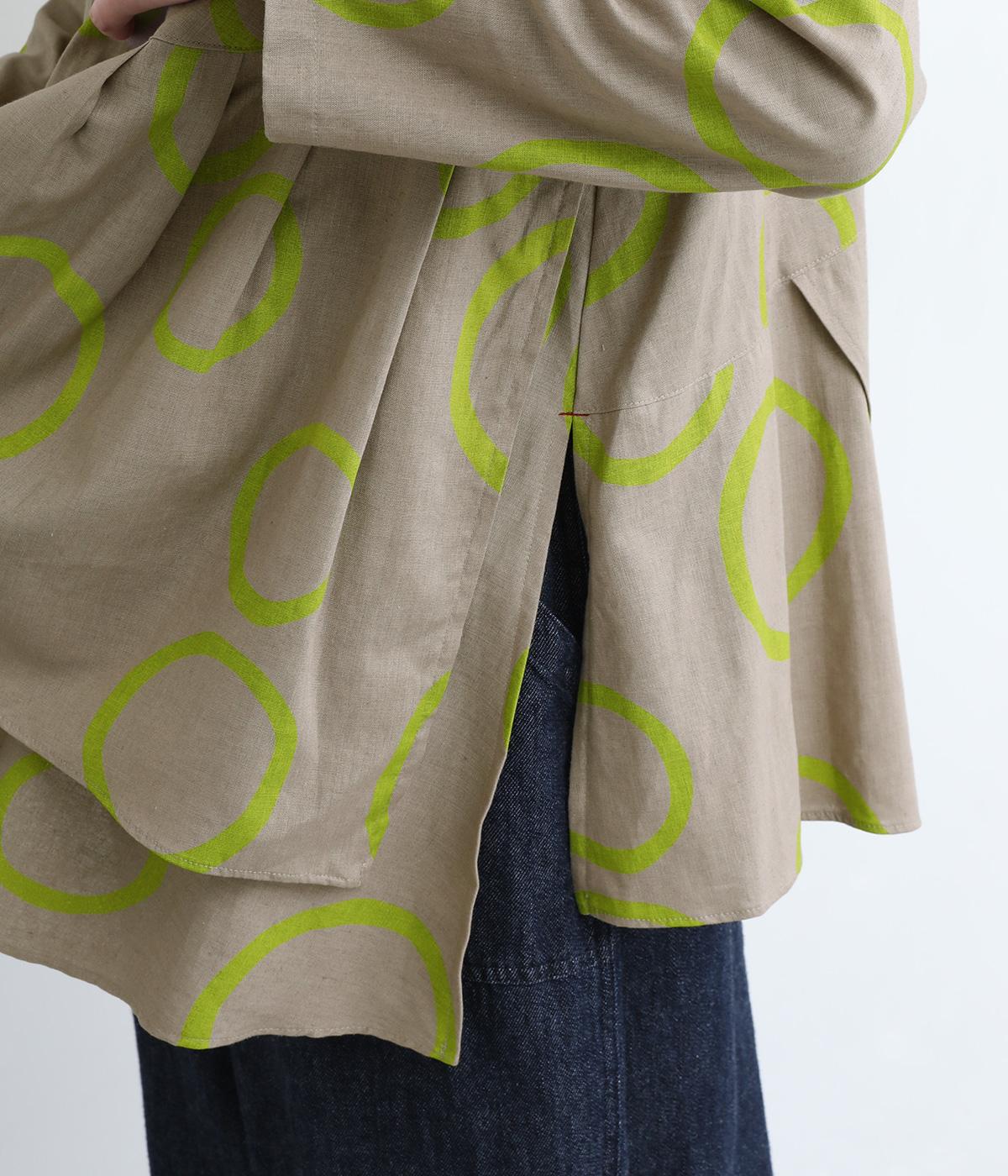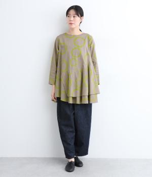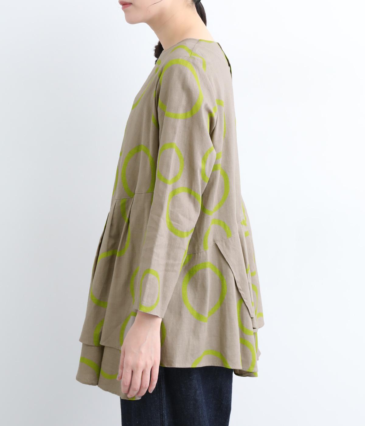 切り替えを斜めに入れて、生地を重ねたボリューミーなフレアシルエットが大人かわいい装いを演出するブラウスです。サイドにスリットを入れることで抜け感をプラス。配色のバブル柄がスタイリングの主役に。