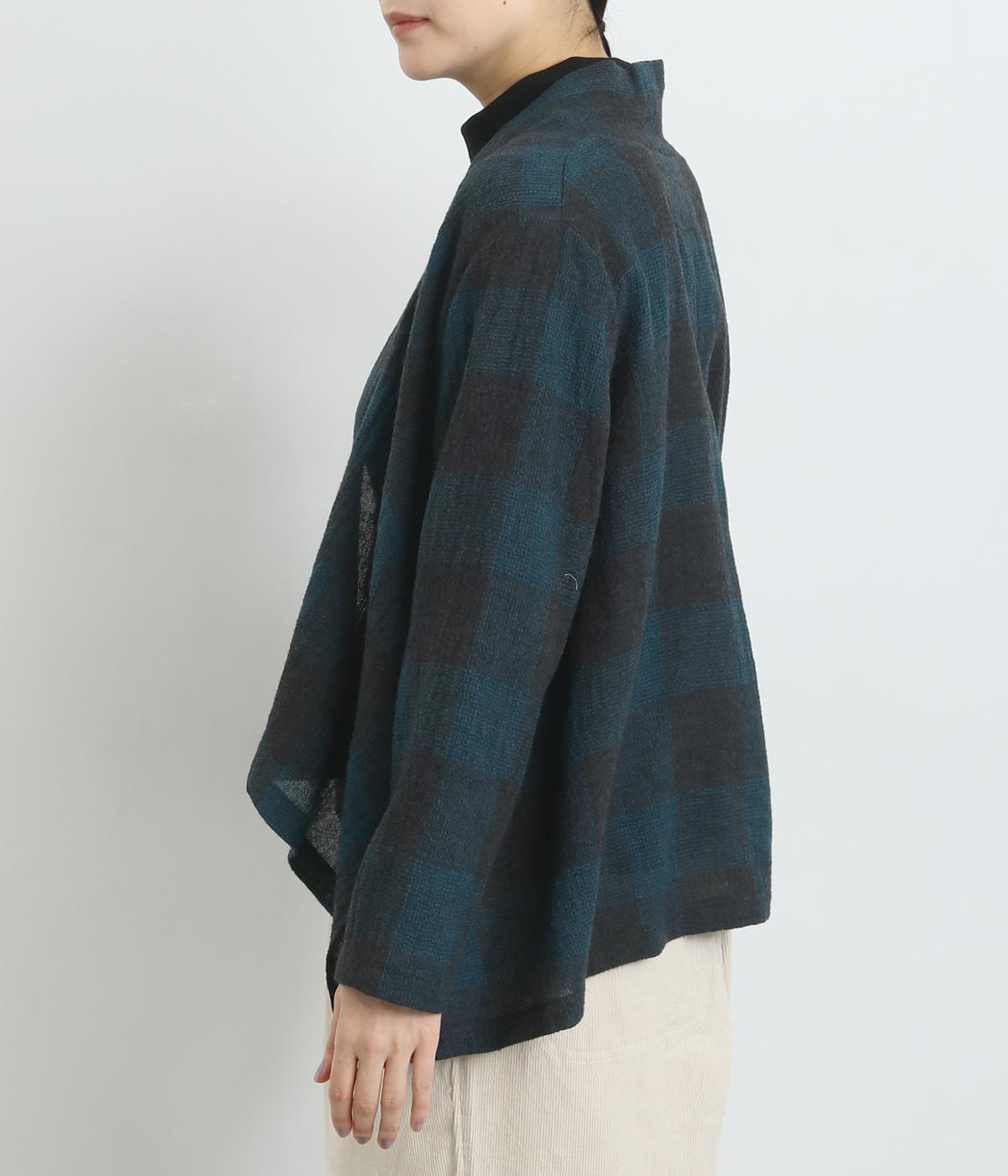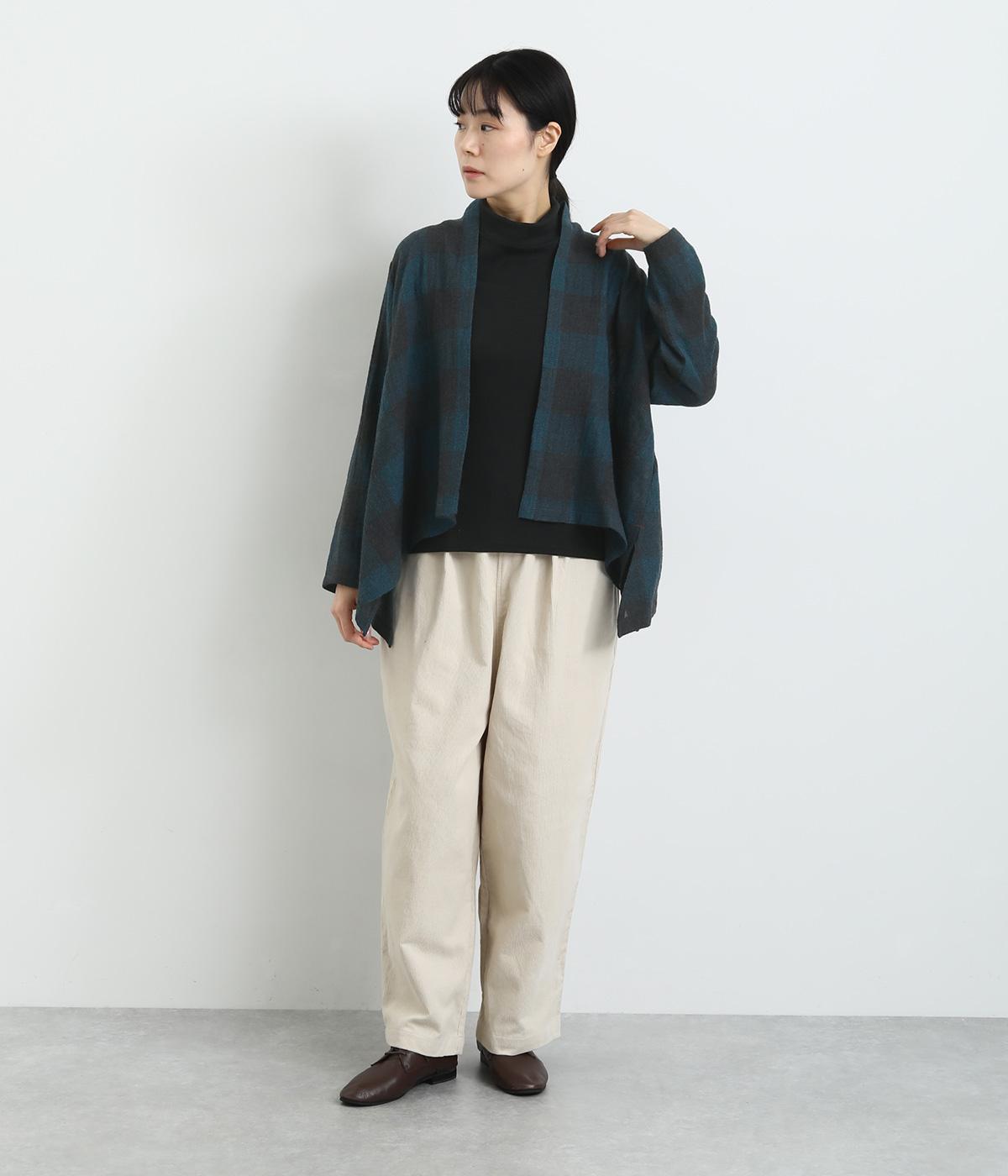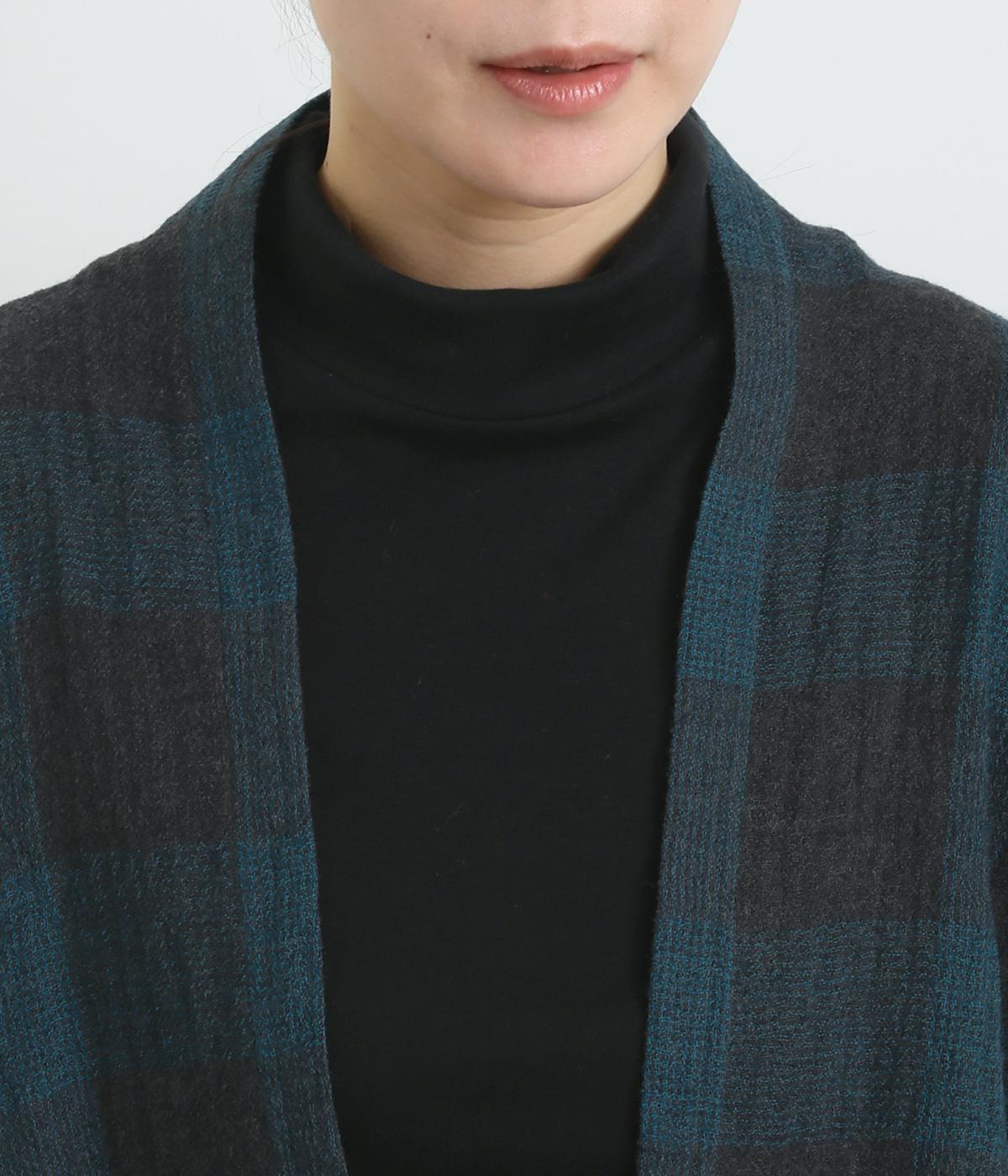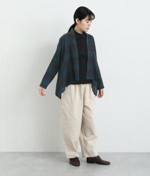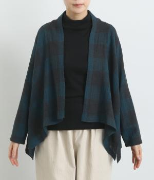 ラフに羽織れる留め具のないタイプのカーディガンです。サイドが垂れたシルエットでヘムラインに自然な動きが出て、着こなしにニュアンスを与えてくれる一枚。落ち着いた配色のチェック柄でシックにまとめました。