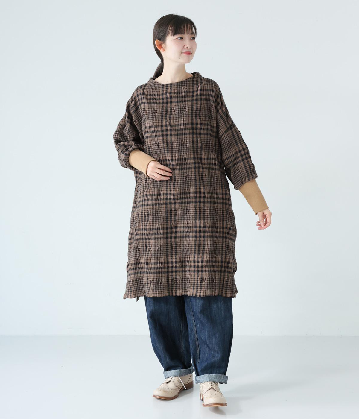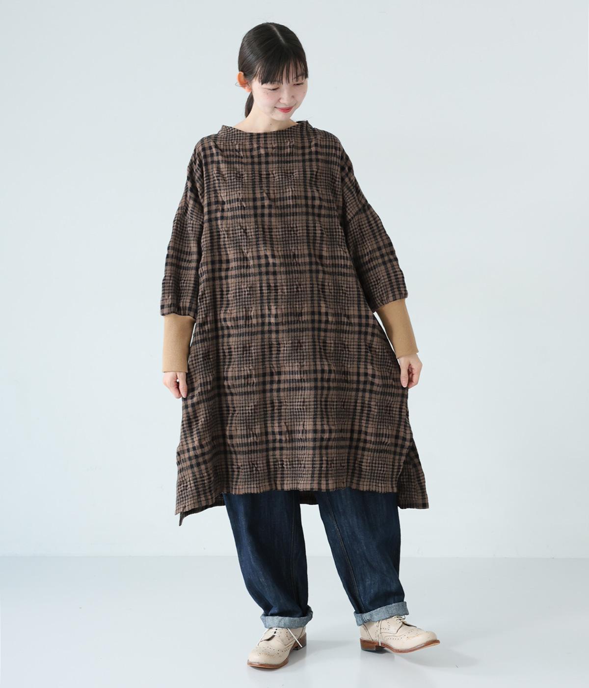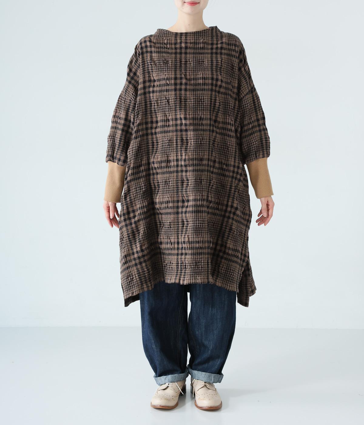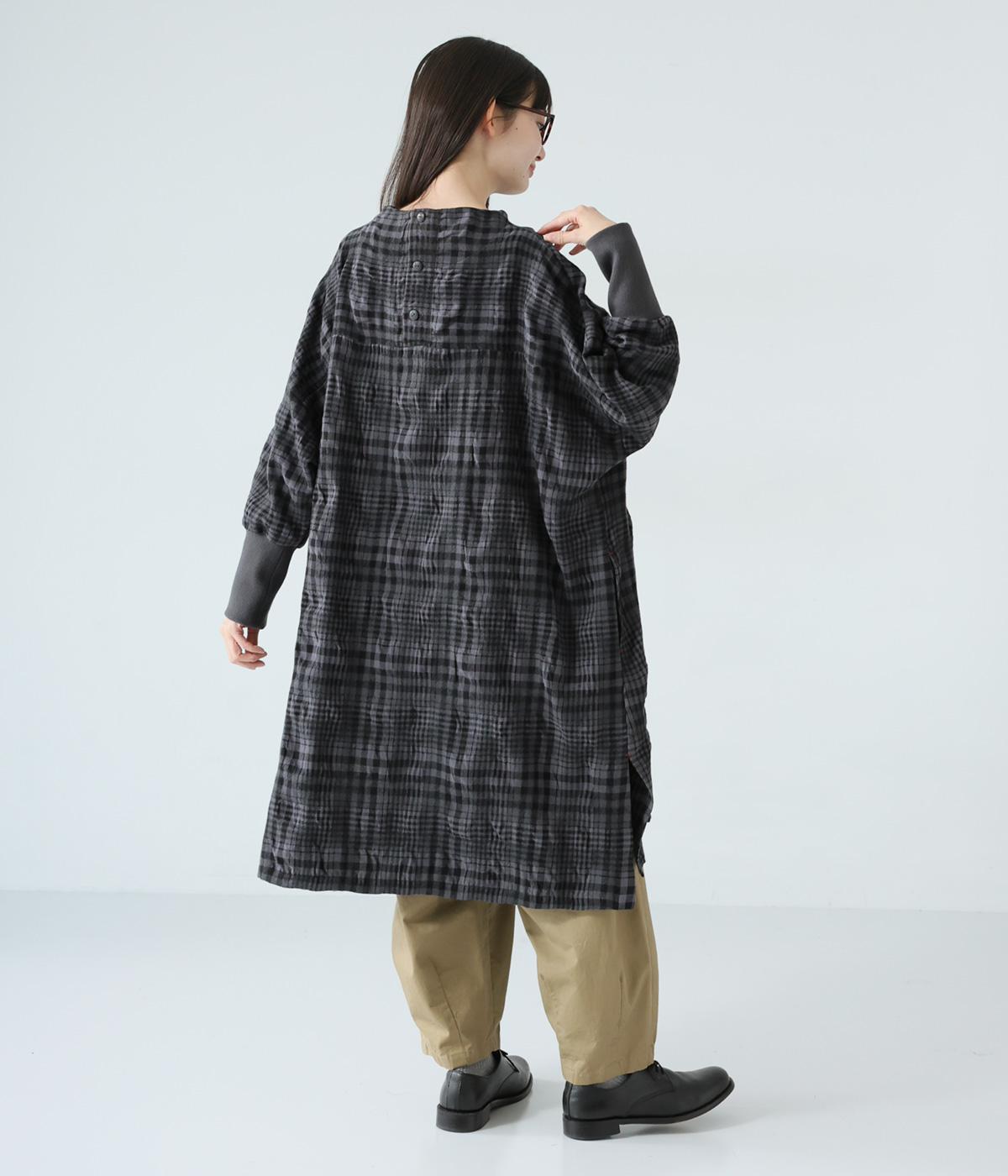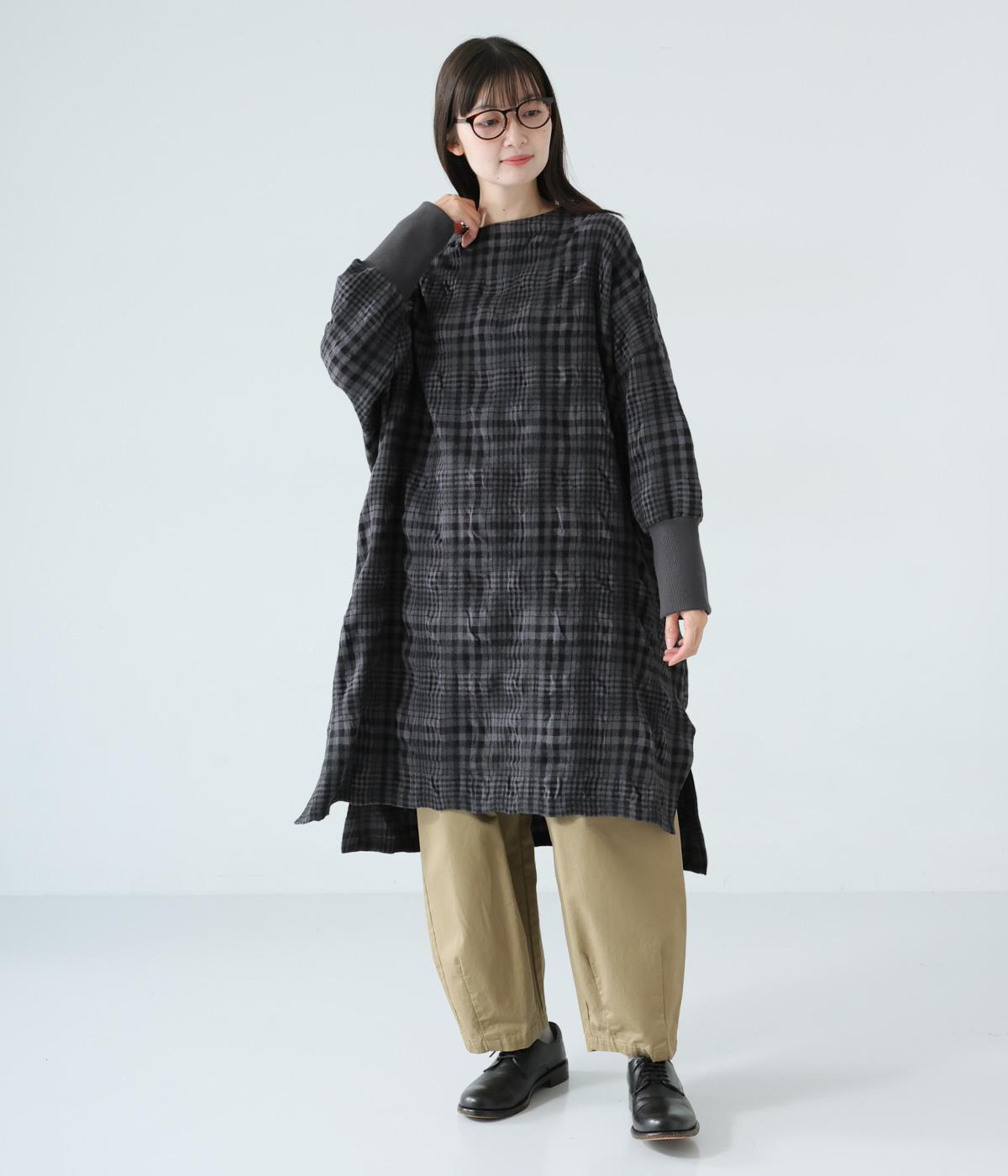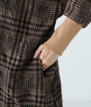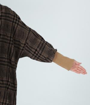 シックなチェック柄と生地の独特な表情で装いの主役になるチュニックワンピース。袖口に長めのリブをあしらってアクセントにしました。パンツとのレイヤードがバランスよく決まる、ひざ下丈が◎。裾にはサイドスリットを入れて抜け感を加えています。