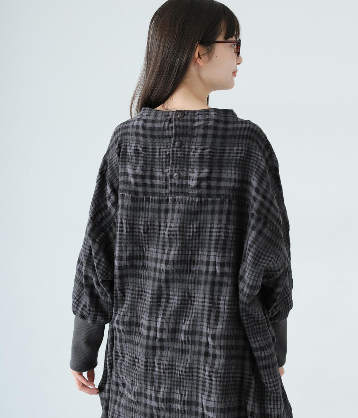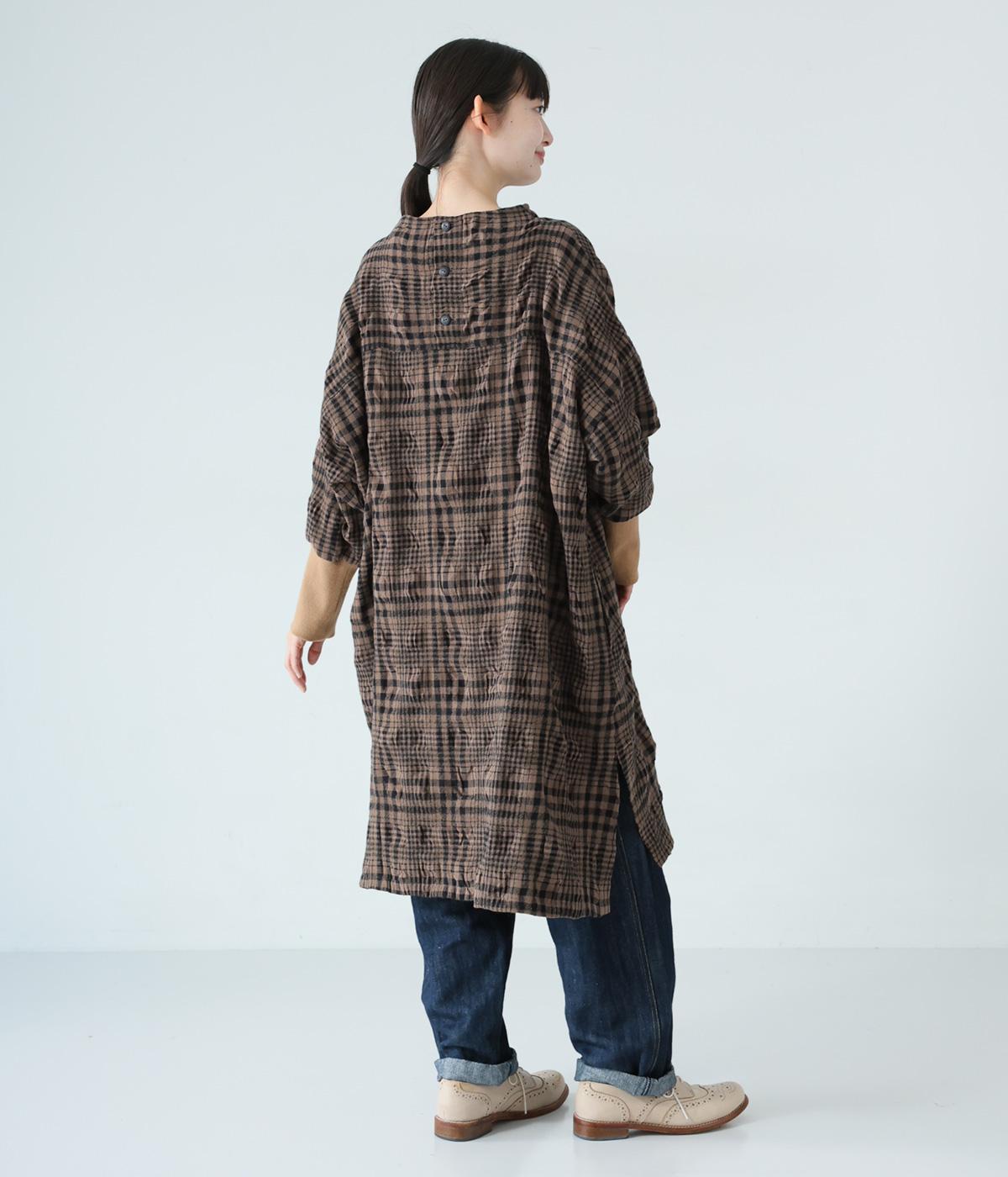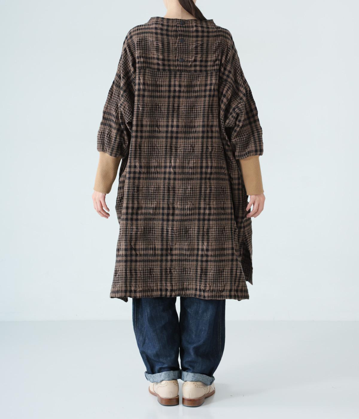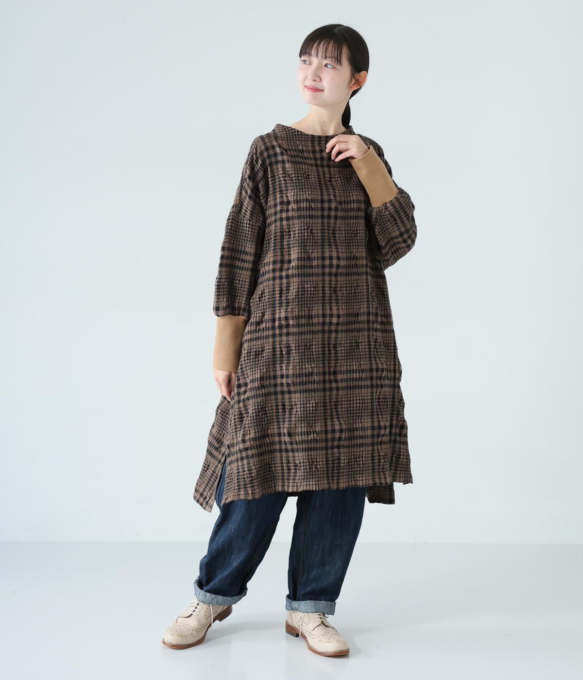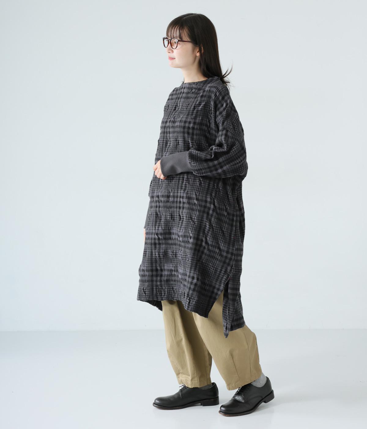 シックなチェック柄と生地の独特な表情で装いの主役になるチュニックワンピース。袖口に長めのリブをあしらってアクセントにしました。パンツとのレイヤードがバランスよく決まる、ひざ下丈が◎。裾にはサイドスリットを入れて抜け感を加えています。