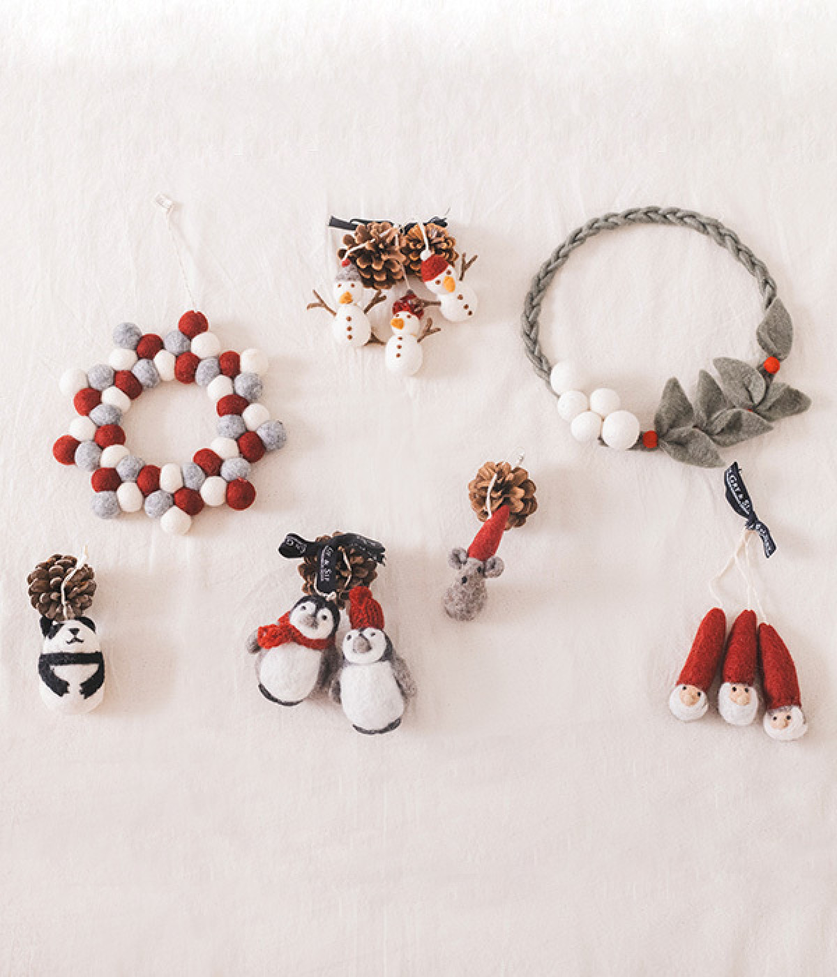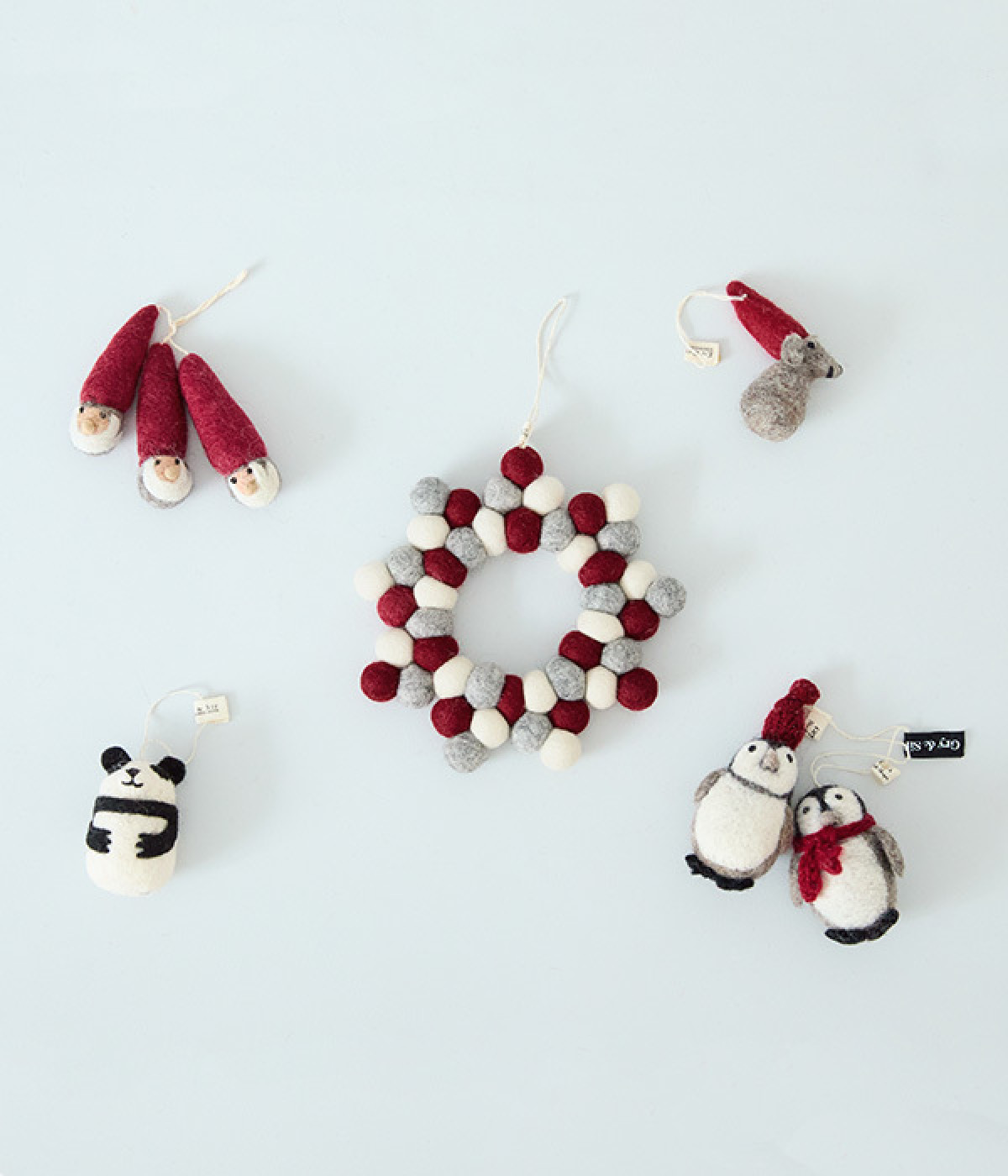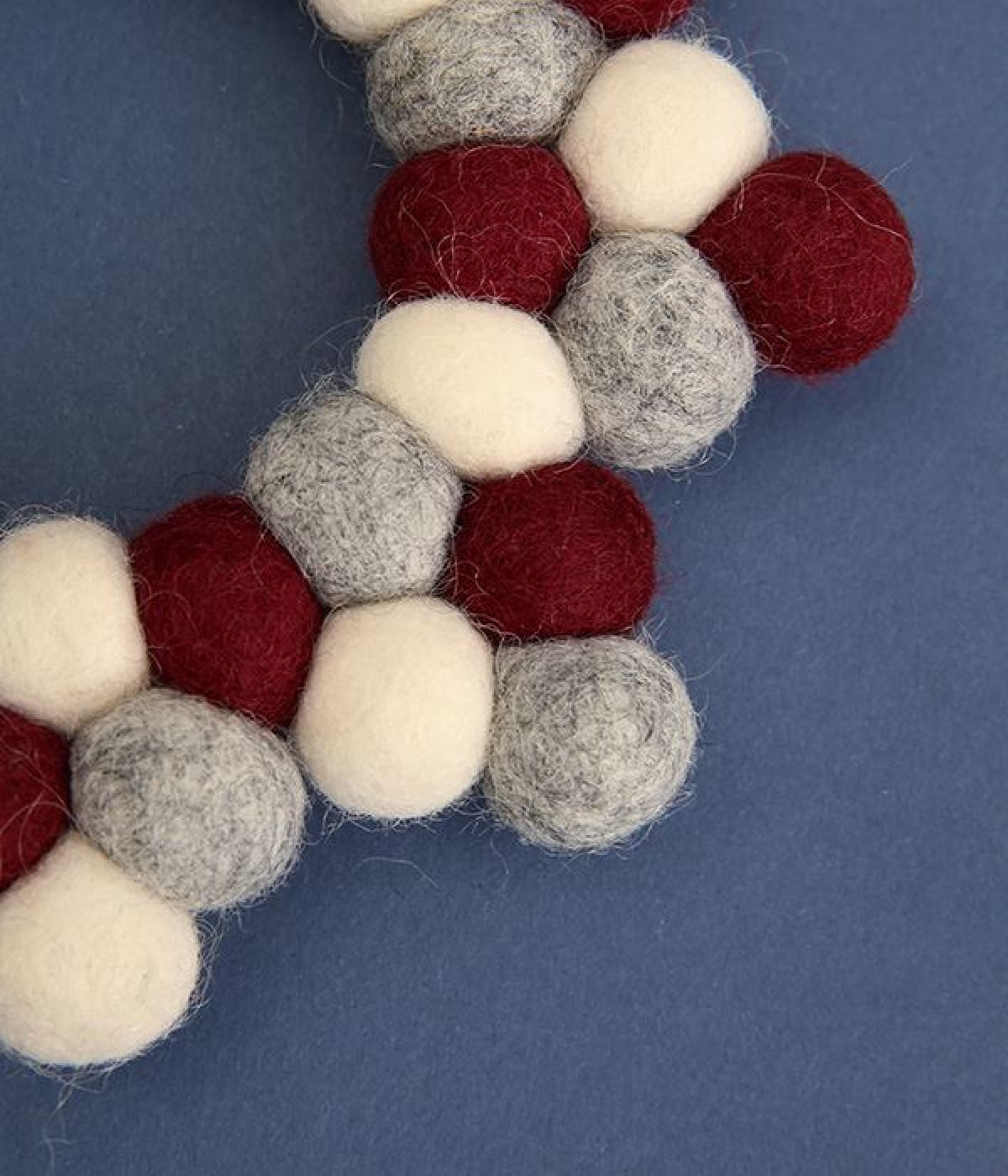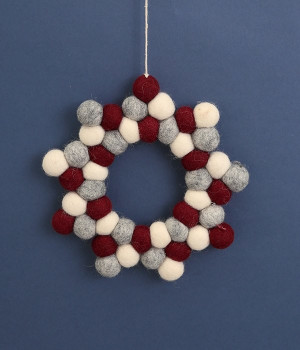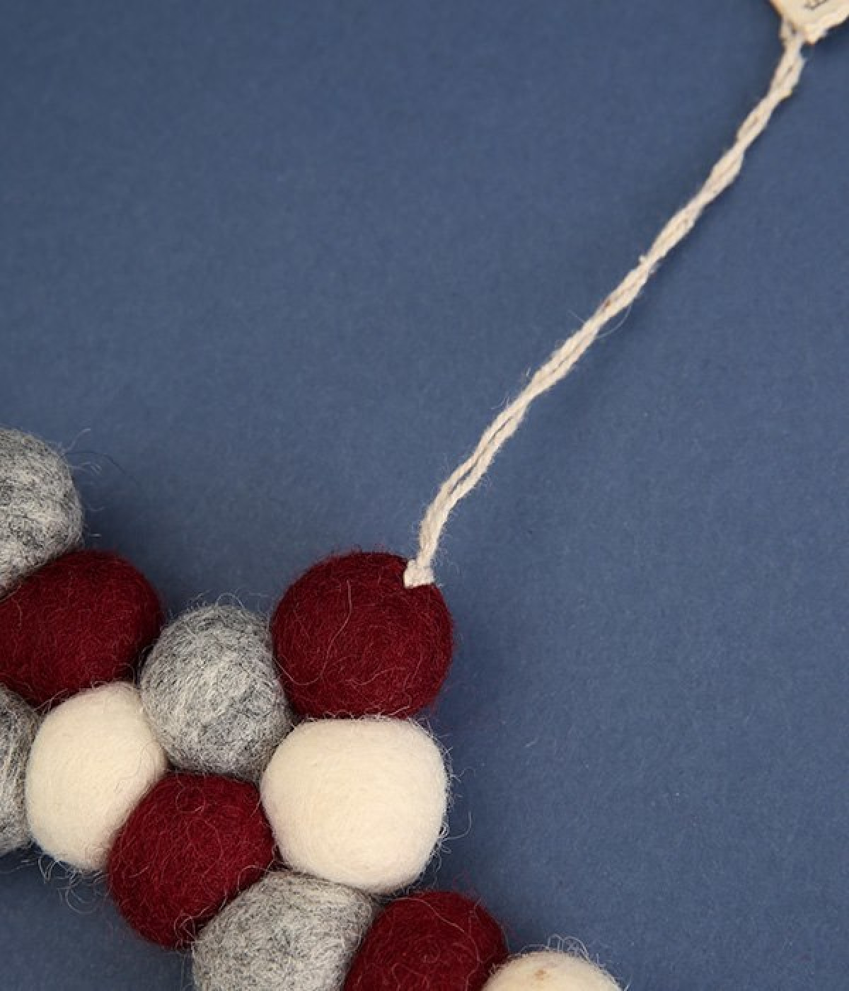 羊毛でできたカラフルなボールをリース状にしたフェルトボールスタークラシックです。赤と白のクリスマスカラーにやわらかなグレーが入ったデザインは、お部屋にもなじみやすいのが特徴。ストラップが付いているため、部屋のフックに引っ掛けて飾るのもおすすめです。