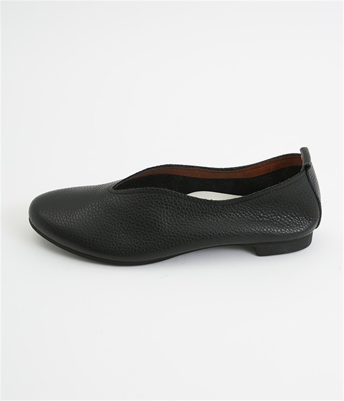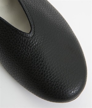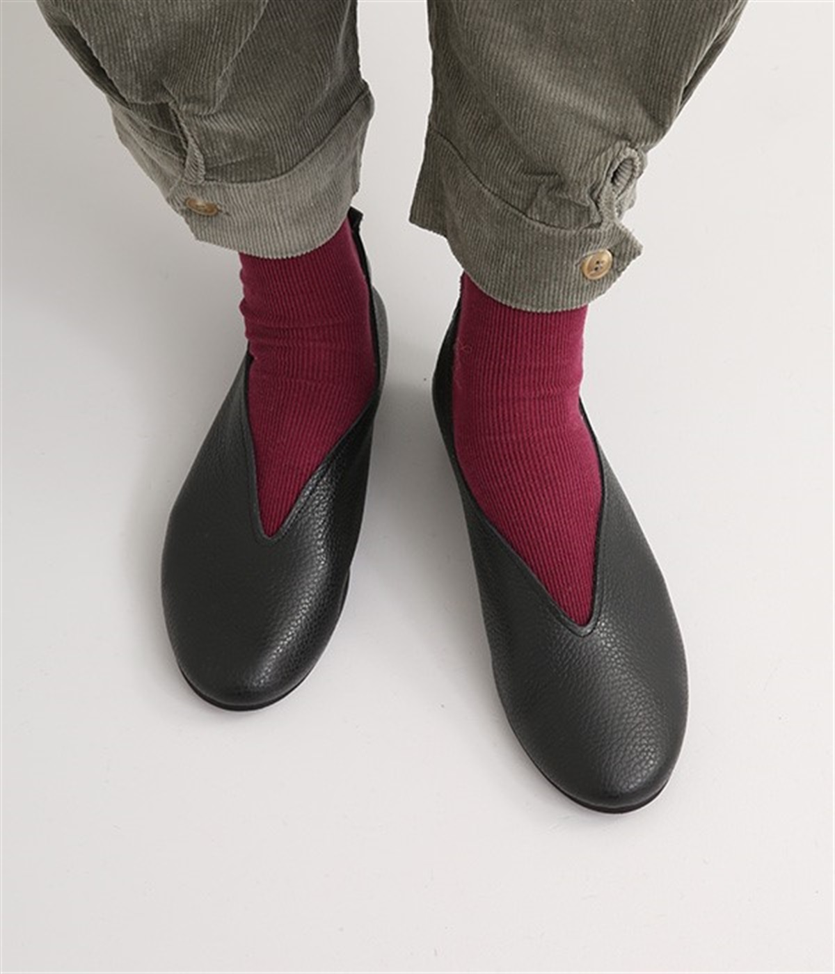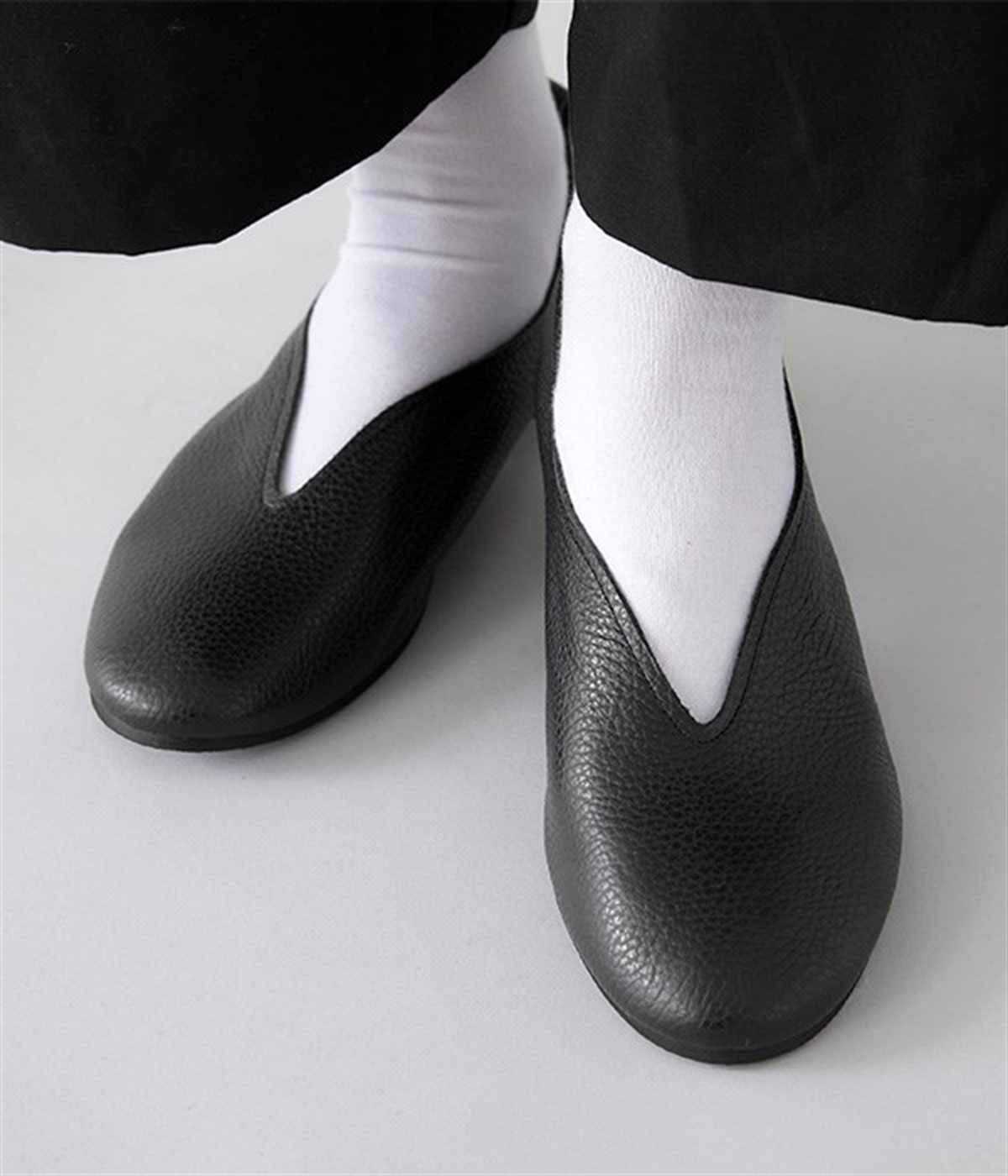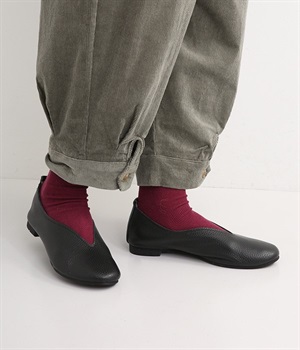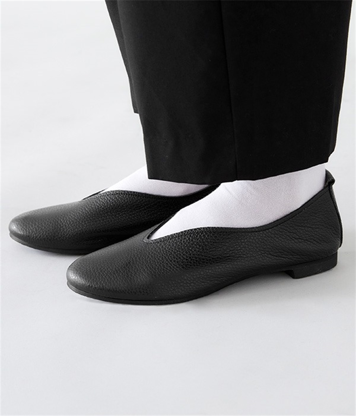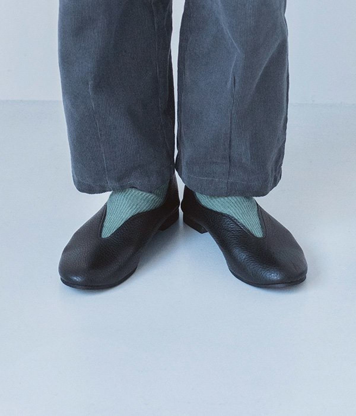 イタリアンレザーを使用したV型スリッポンです。履き口のラインは波打ったカーブにし、シルエットに変化を持たせました。インソールの土踏まずの位置からかかと部分にかけてクッション性のある低反発素材を使用しており、足への負担を軽減してくれます。柔らかく、しなやかなレザーの質感と軽い履き心地でリラックスして履くことができます。