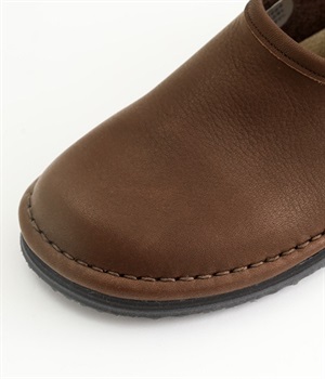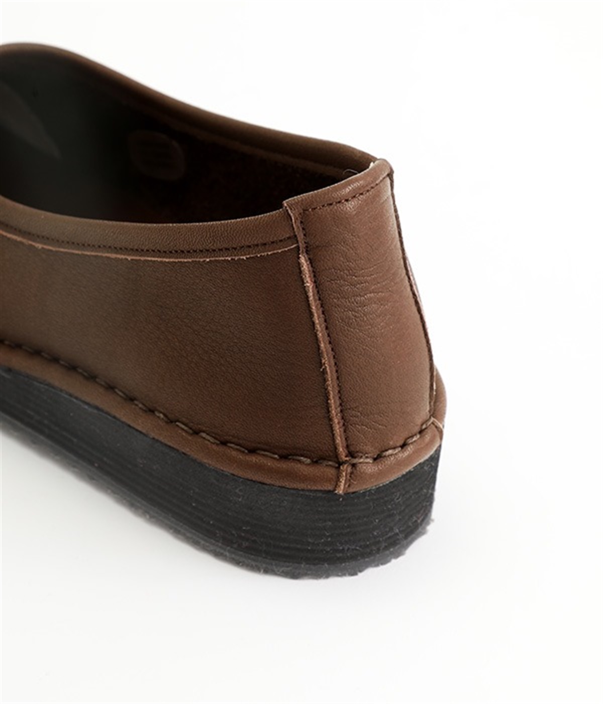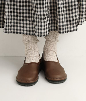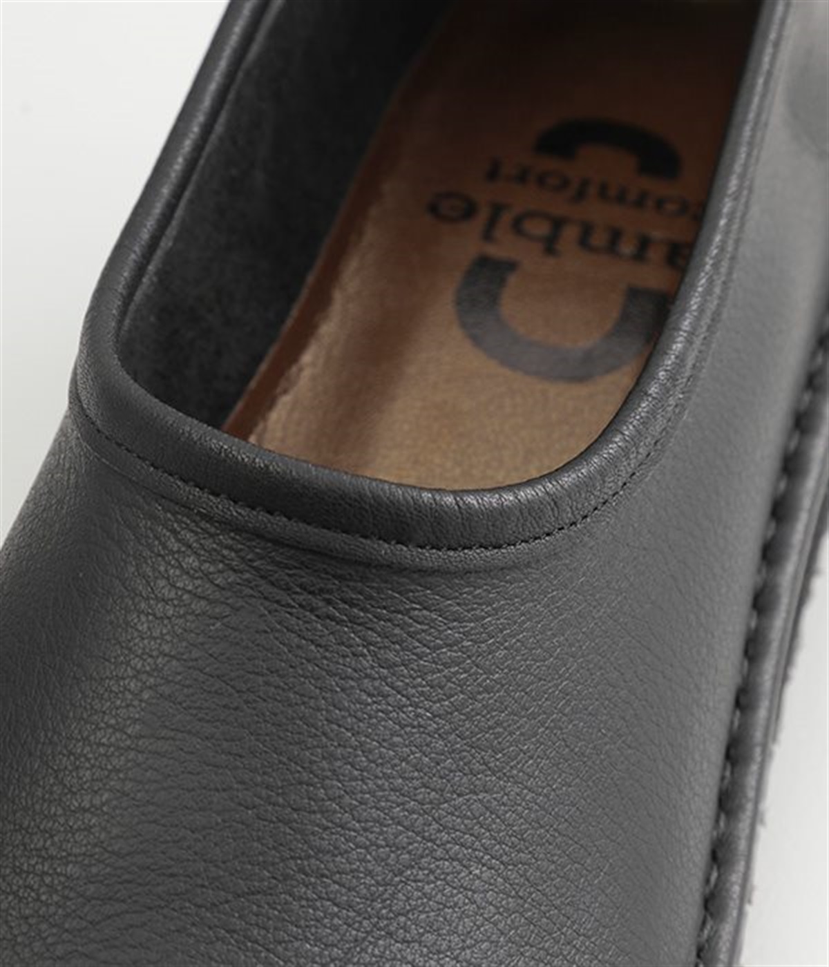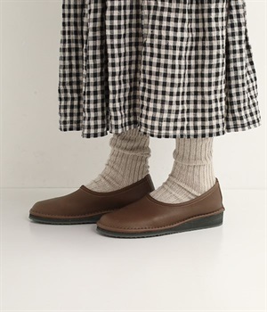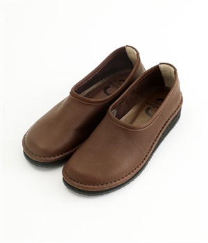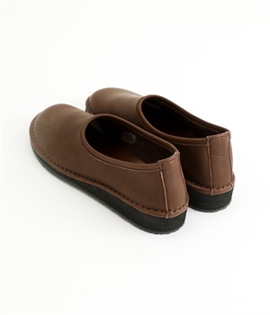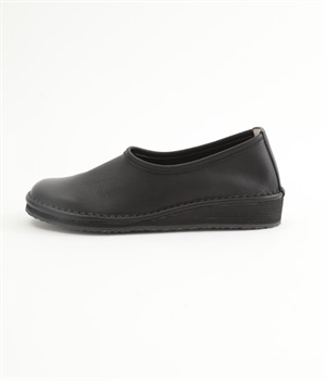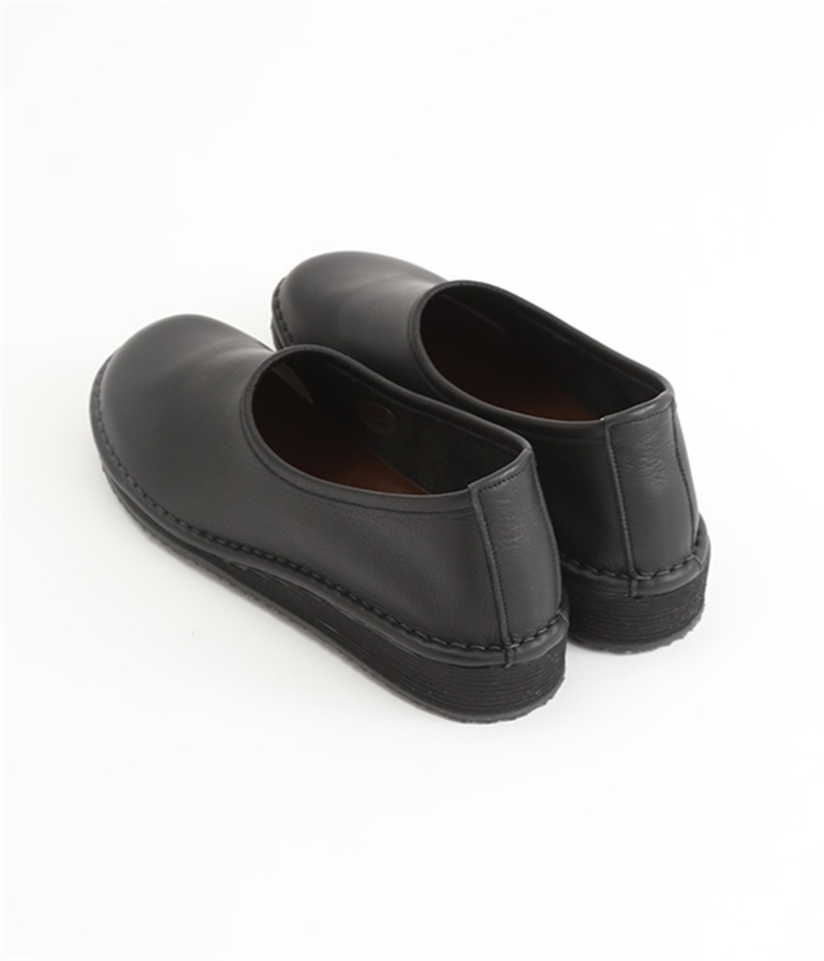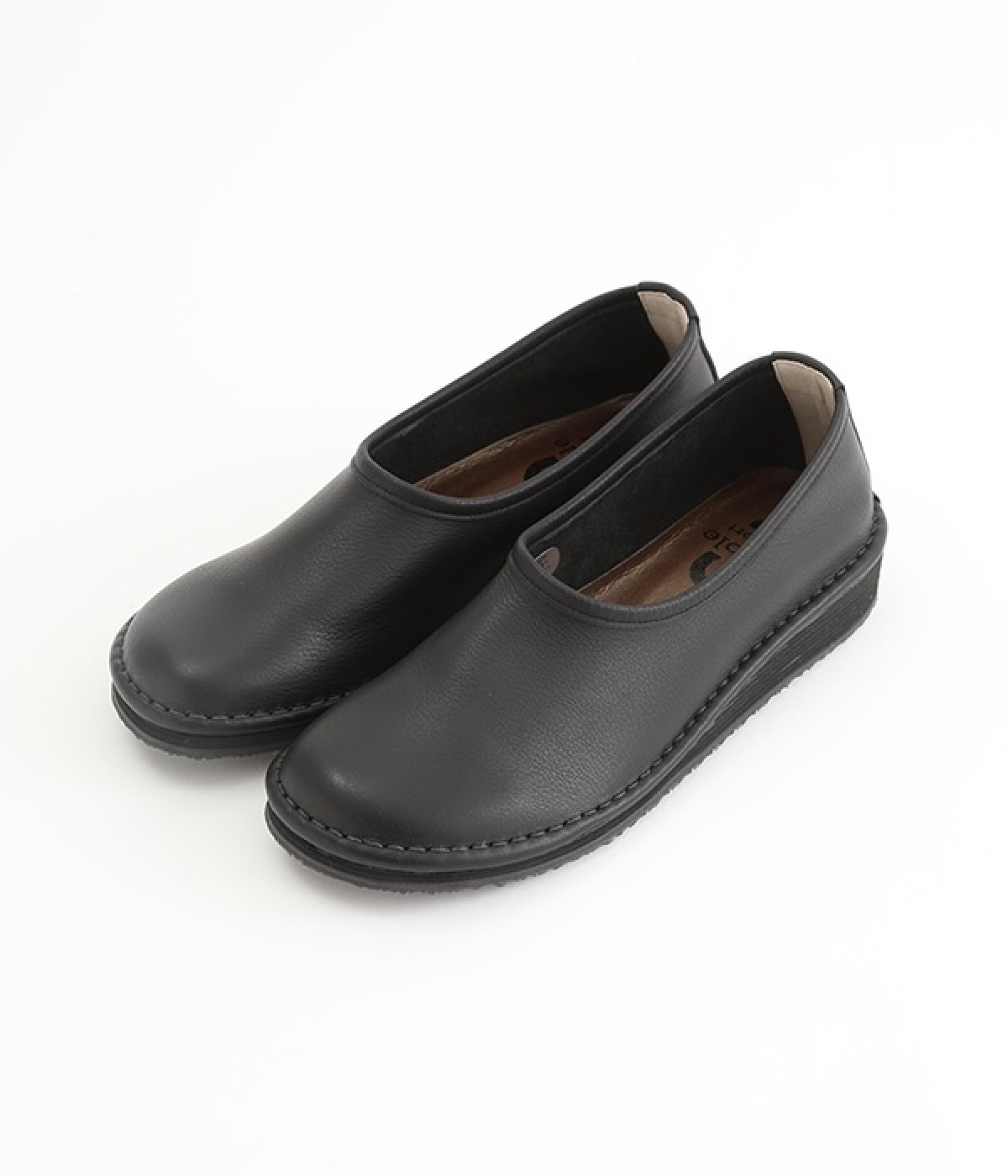 つま先がやや斜めにカットされた、緩やかなラウンドを描くオブリークトゥのスリッポンシューズです。低反発クッション内臓のインソールで、やさしく包み込まれるようなはき心地を実現しました。4Eのゆったりとした幅で、つま先を圧迫しにくいコンフォータブルな一足です。アッパーには上品なツヤを持つオイルシュリンクレザーを使用。一枚革でパーツの縫い合わせをへらしたシームレスなデザインで、革の豊かな表情をより楽しむことができます。荷重バランスがとりやすく足の運びをスムーズにサポートする、ほどよいヒールの高さもポイント。
