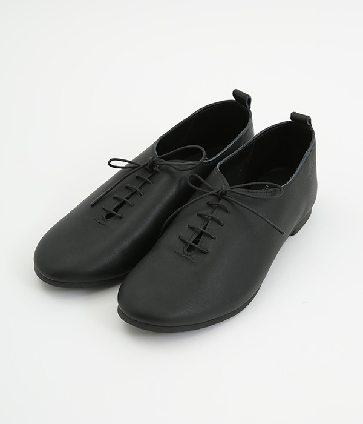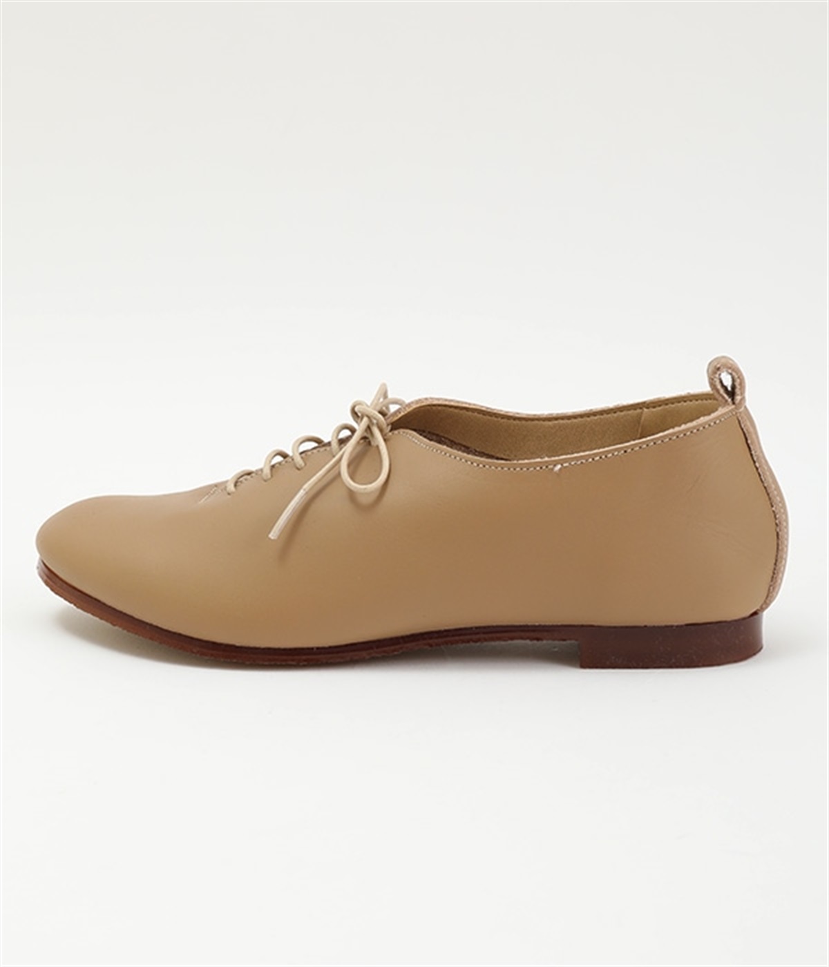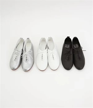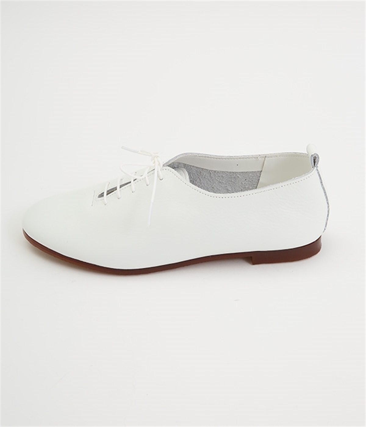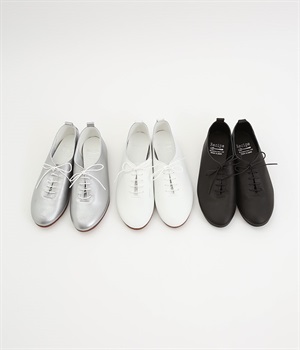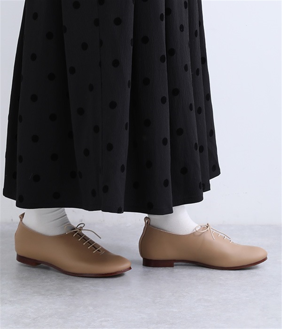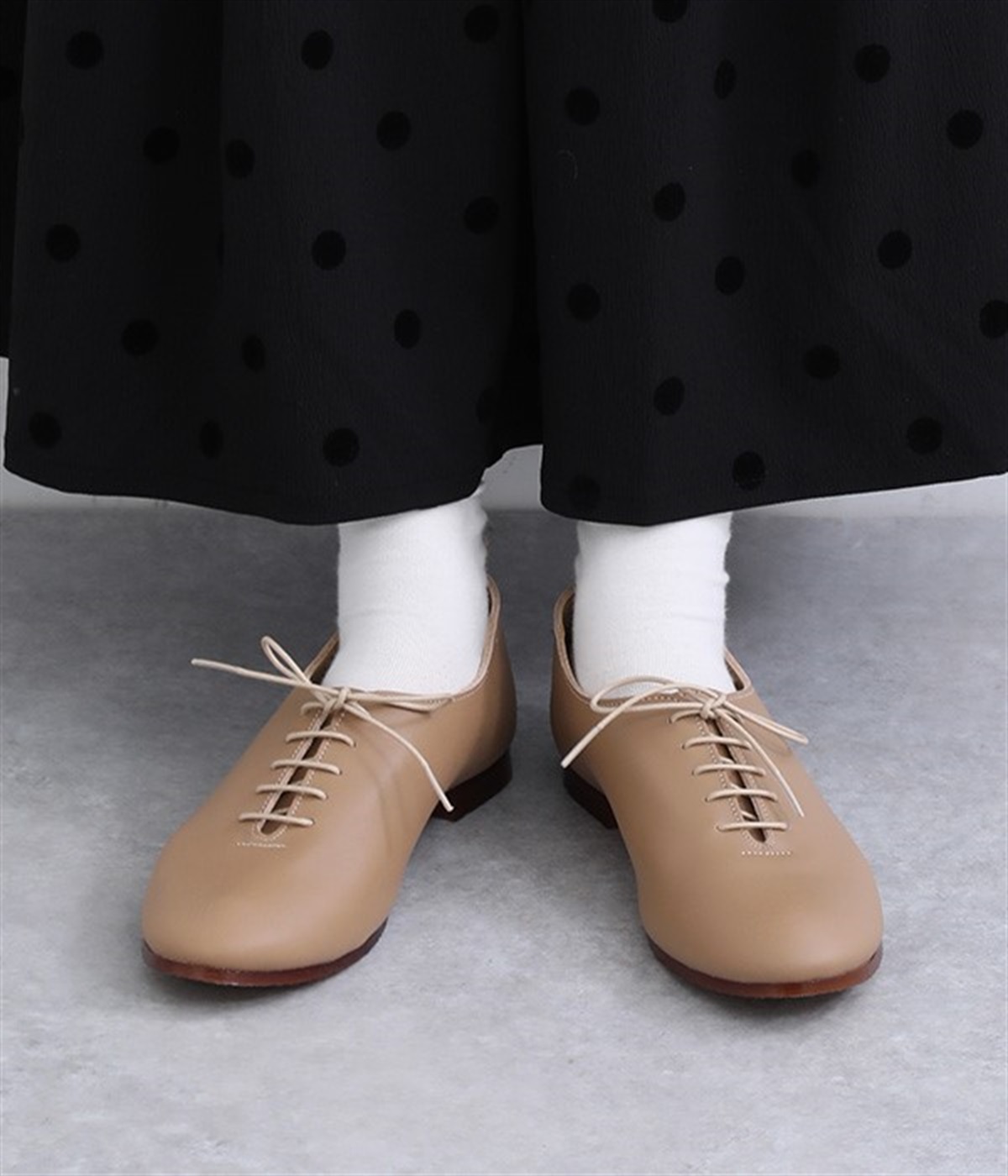 革一枚仕立てのフラットなデザインが魅力のレースアップシューズです。コーディネートを引き立てるベーシックなデザイン&色がポイント。季節を問わず使いやすく、足元が品よく決まります。靴紐は細めのものをセレクトして女性らしい華奢な印象に。中敷きはふかふかと厚さもあり、歩きやすさも抜群。丈夫で軽い日本製の部品を使用しています。
