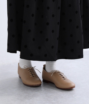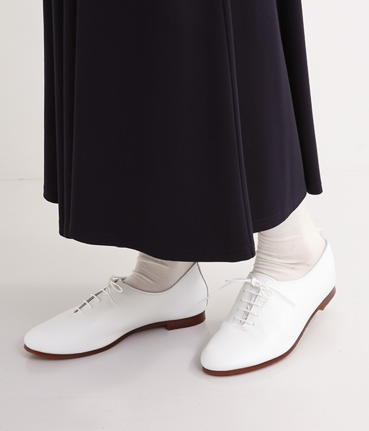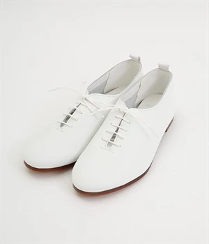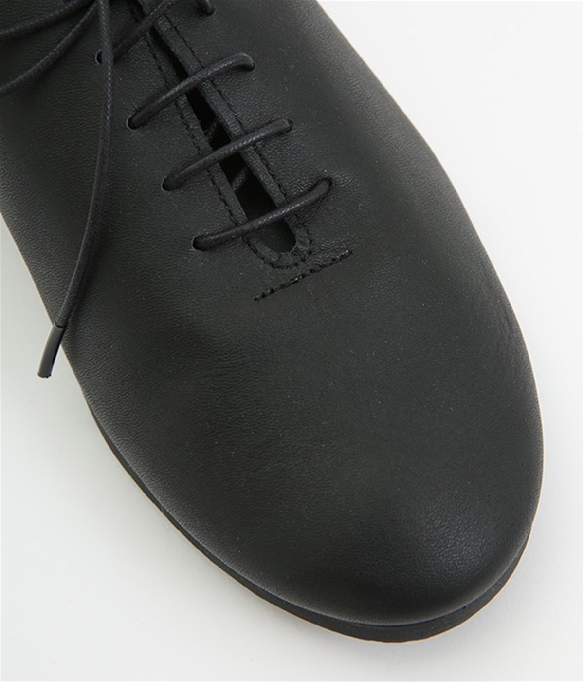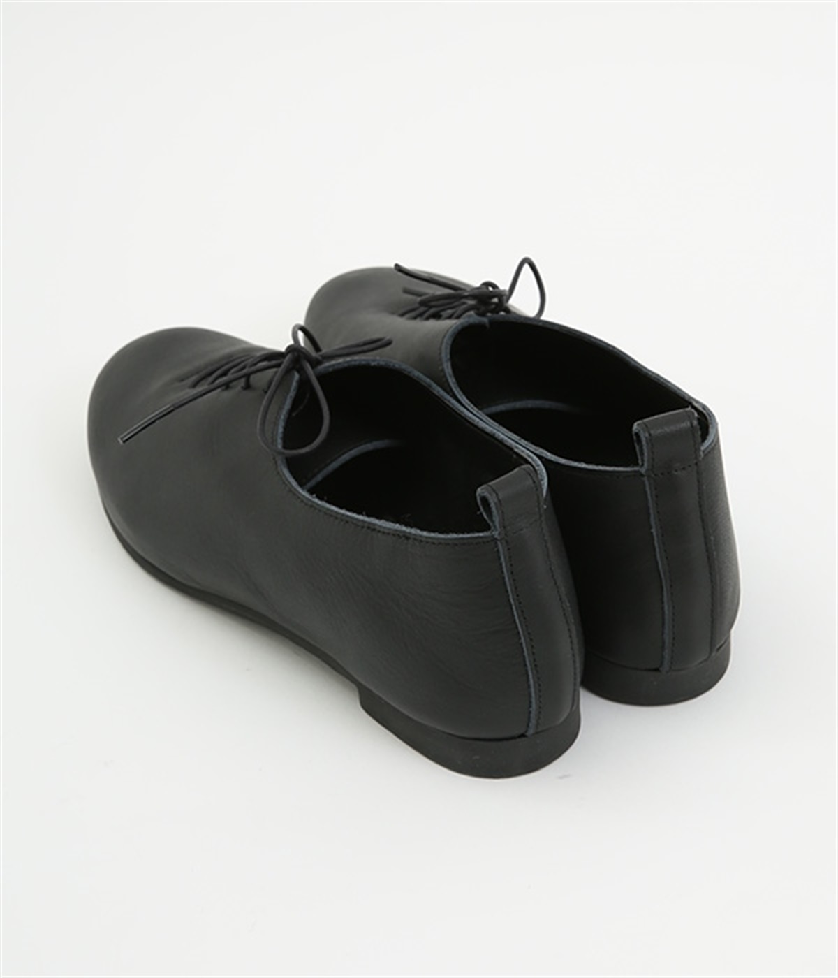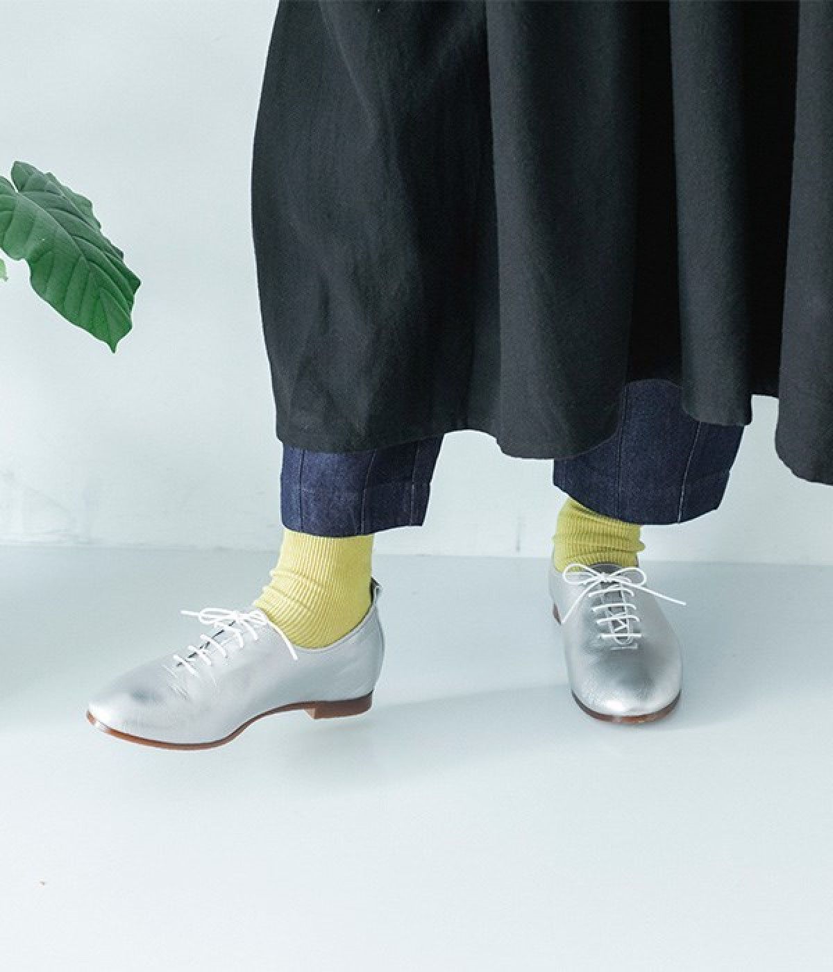 革一枚仕立てのフラットなデザインが魅力のレースアップシューズです。コーディネートを引き立てるベーシックなデザイン&色がポイント。季節を問わず使いやすく、足元が品よく決まります。靴紐は細めのものをセレクトして女性らしい華奢な印象に。中敷きはふかふかと厚さもあり、歩きやすさも抜群。丈夫で軽い日本製の部品を使用しています。