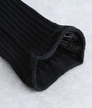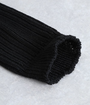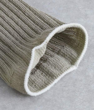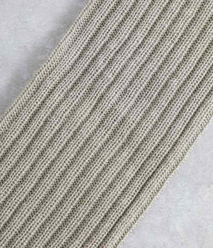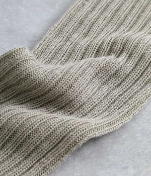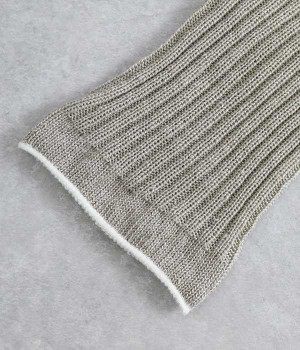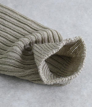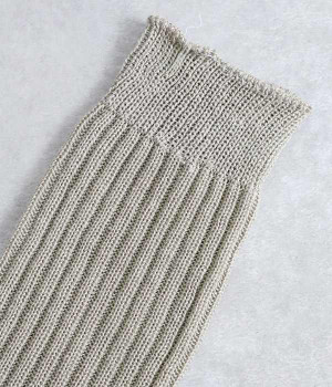 畝の凹凸がよく見える、足元に素朴な雰囲気をただよわせるチューブ。通気性にすぐれたリネンをミックスして編み上げているため、不快なムレを防いでくれるのが自慢です。日よけ対策用のアームカバーとしても、冷房対策用のレッグウォーマーとしても使えるので、バッグにしのばせておくととても便利。締めつけによるストレスがないようにゆるっとやさしい編み立てにしています。ピンと伸ばしてはくのはもちろん、くしゅっとさせてニュアンスを出すのもおすすめ。