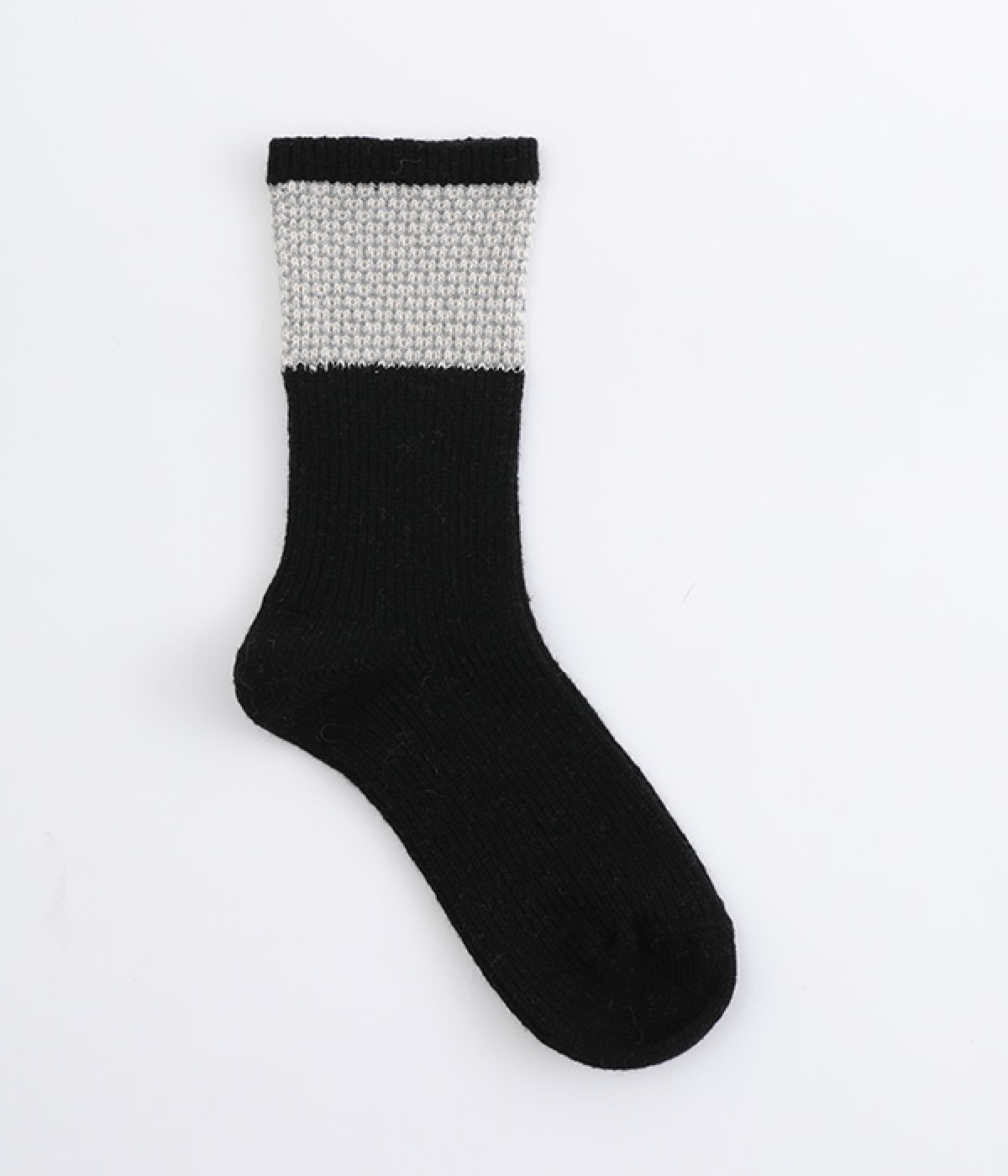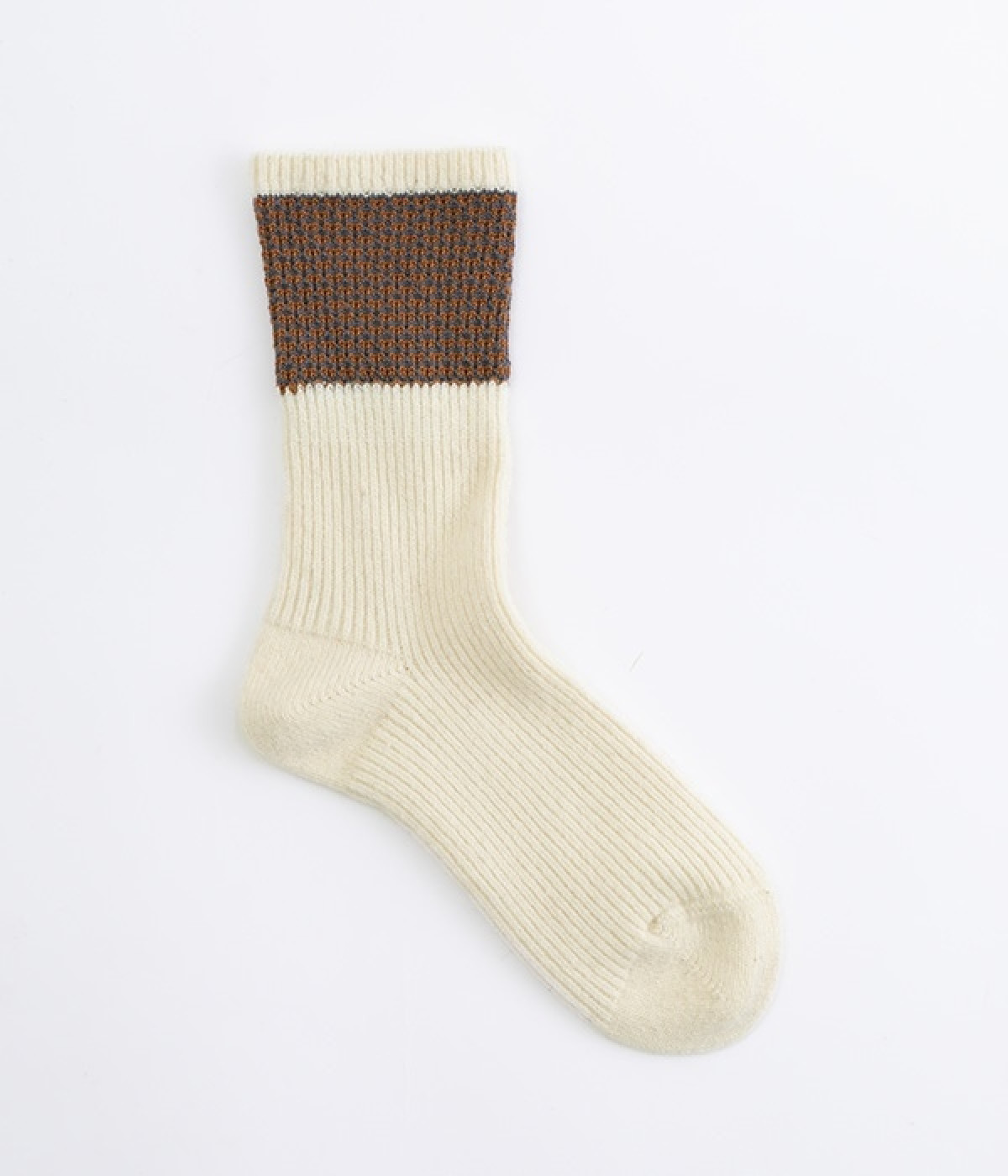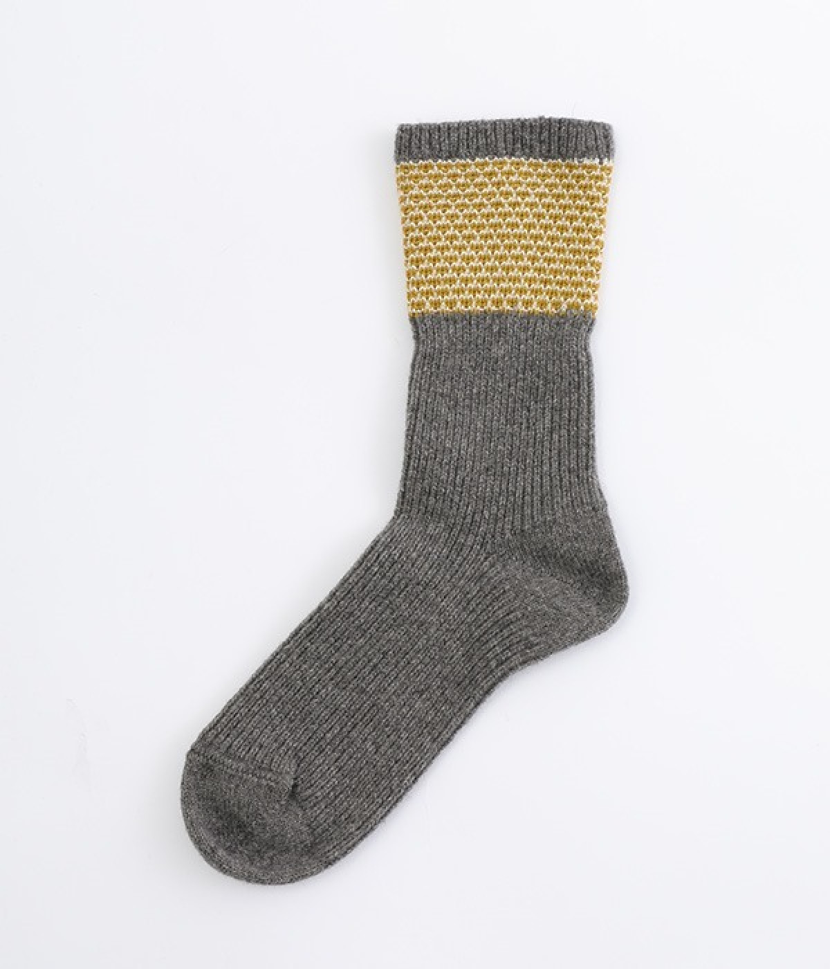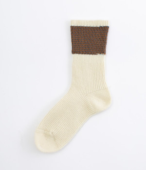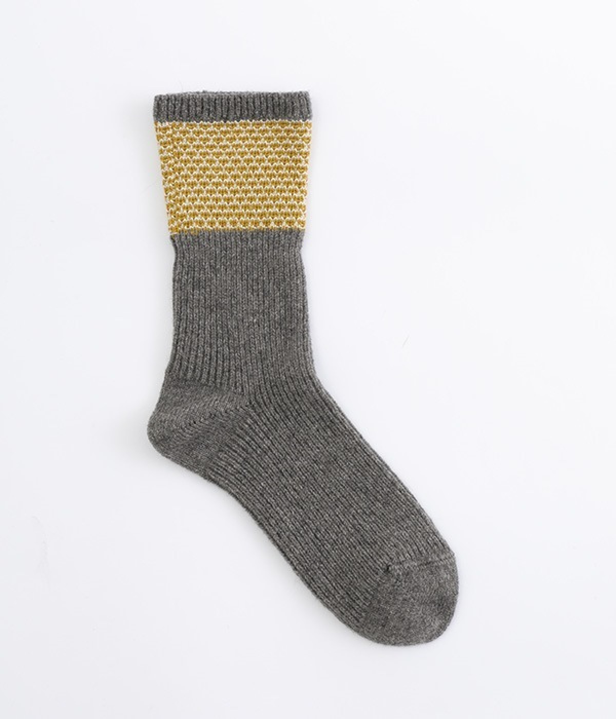 すっきりと伸ばしても、柄部分を折り返しても履くことができる2way仕様のソックスです。履き口はゴムを入れていないため締め付け感がなく、落ちてこないよう柄終わりにゴムを入れています。明るみをおさえたバイカラーが幅広いコーディネートになじみの良い一足。環境にもやさしいリサイクルウール混の糸を使用して仕立てました。