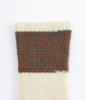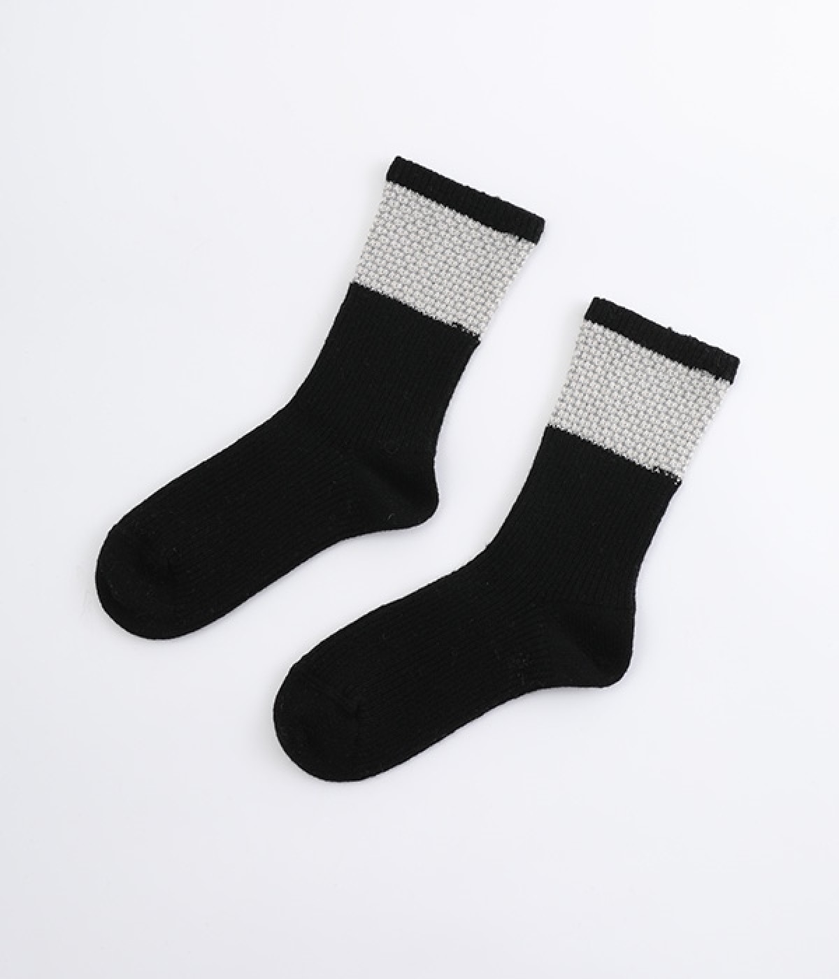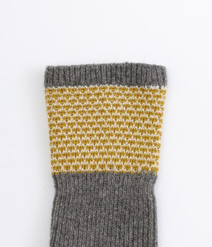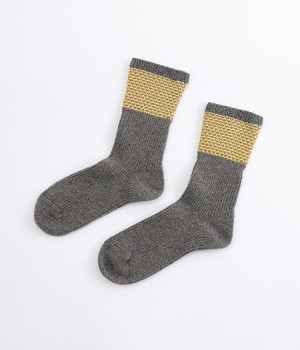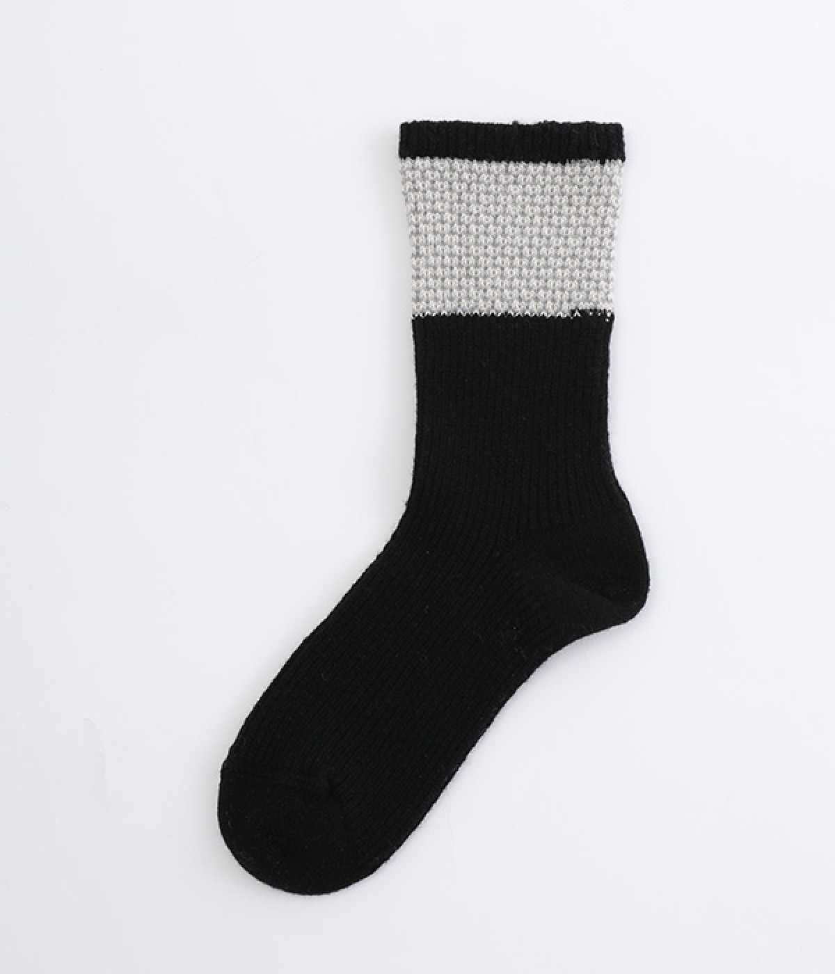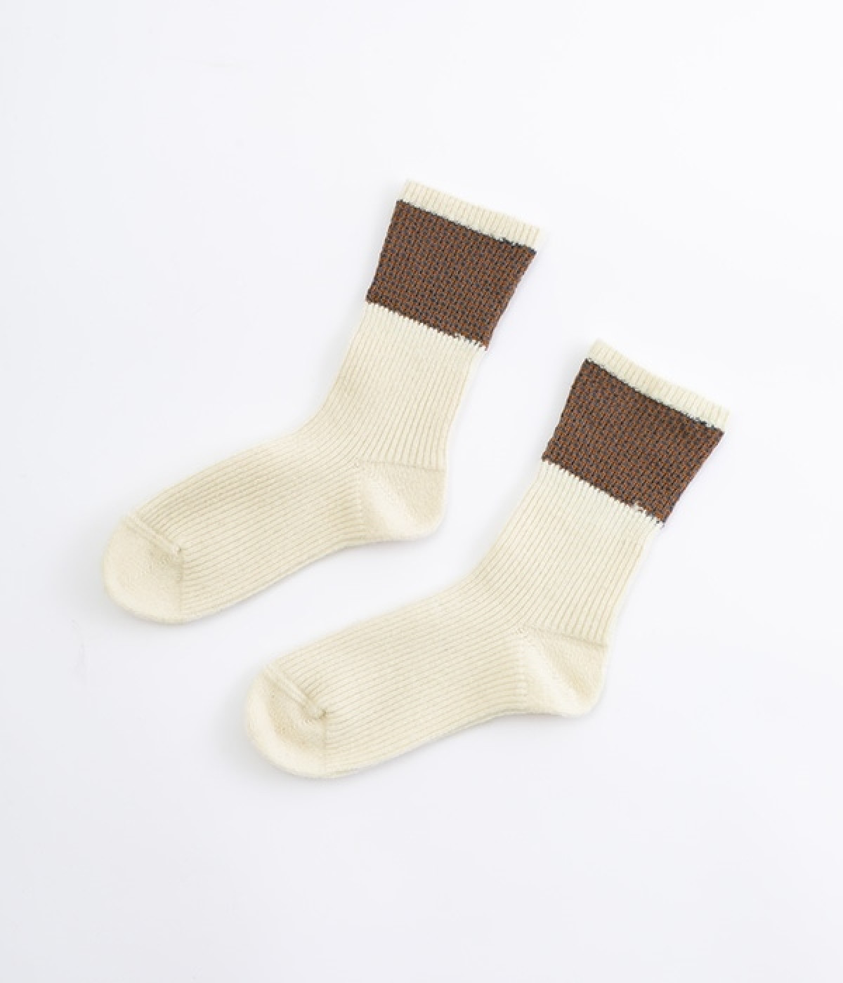すっきりと伸ばしても、柄部分を折り返しても履くことができる2way仕様のソックスです。履き口はゴムを入れていないため締め付け感がなく、落ちてこないよう柄終わりにゴムを入れています。明るみをおさえたバイカラーが幅広いコーディネートになじみの良い一足。環境にもやさしいリサイクルウール混の糸を使用して仕立てました。