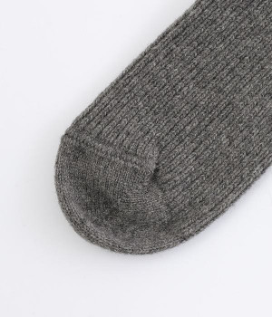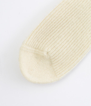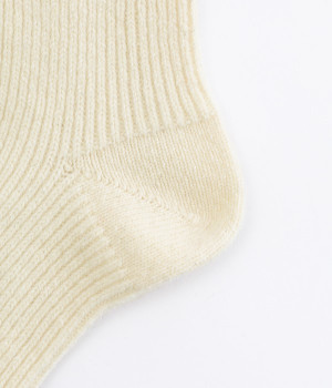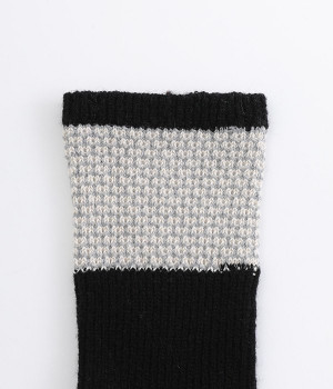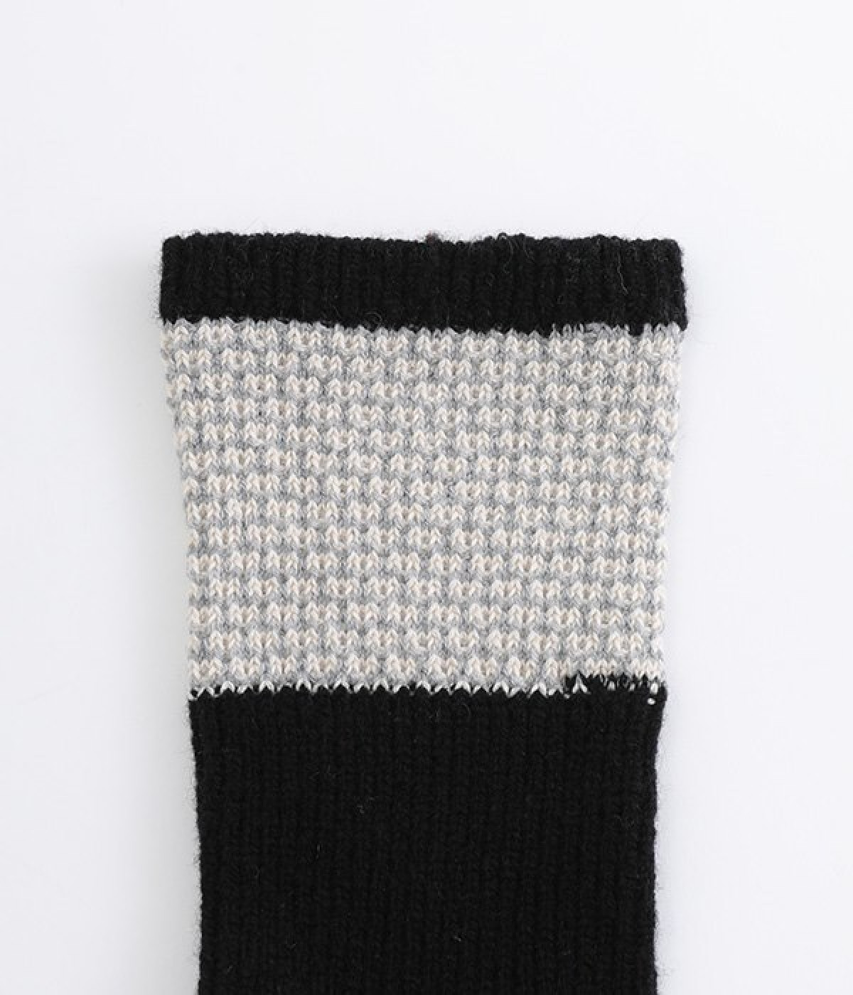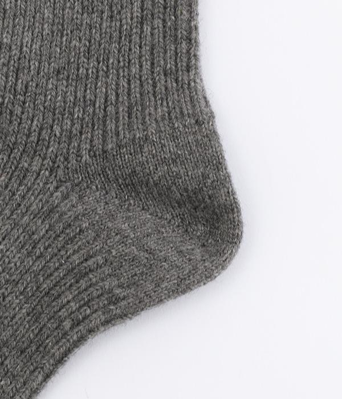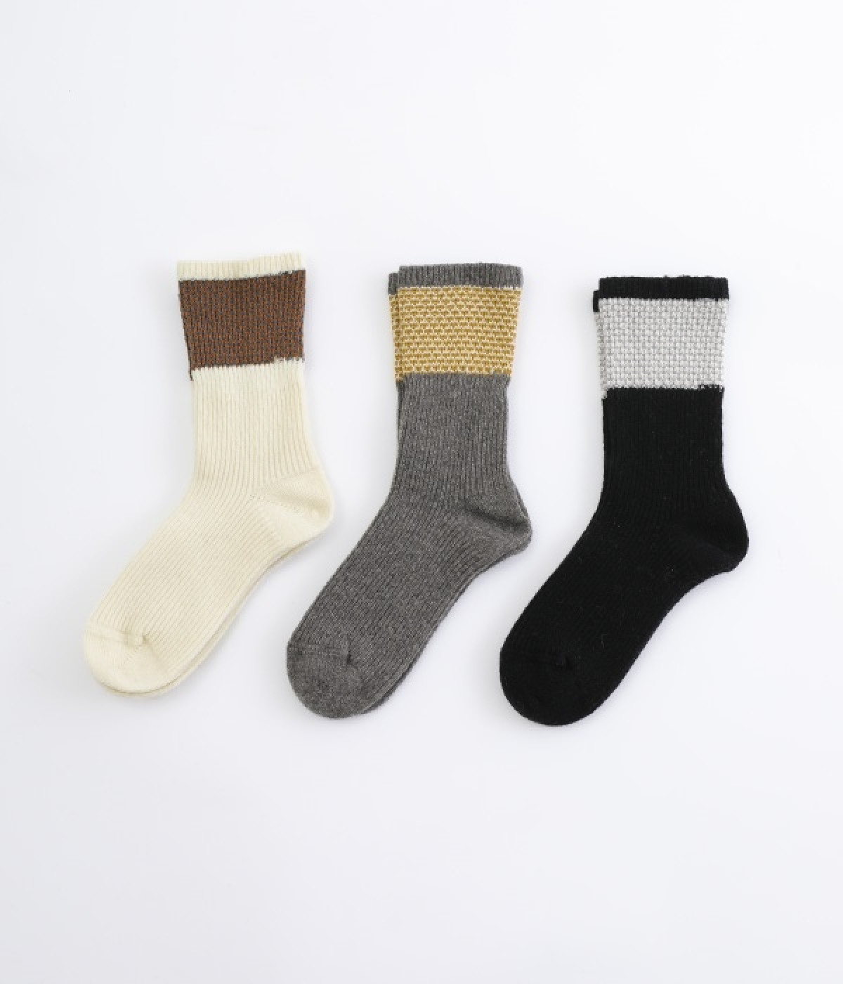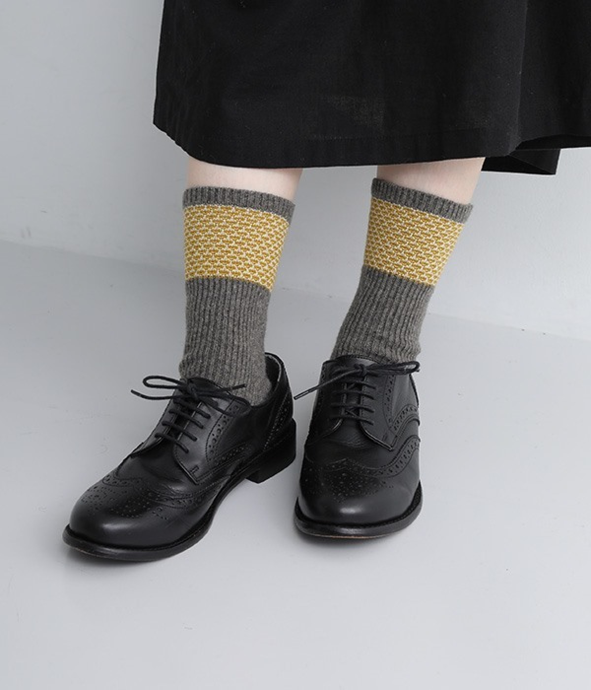 すっきりと伸ばしても、柄部分を折り返しても履くことができる2way仕様のソックスです。履き口はゴムを入れていないため締め付け感がなく、落ちてこないよう柄終わりにゴムを入れています。明るみをおさえたバイカラーが幅広いコーディネートになじみの良い一足。環境にもやさしいリサイクルウール混の糸を使用して仕立てました。
