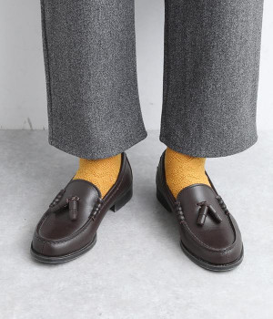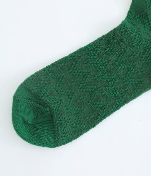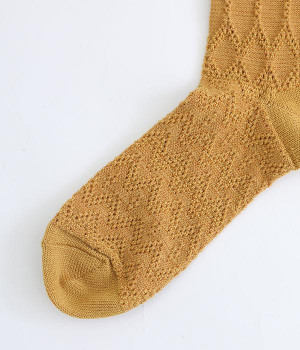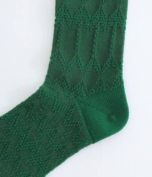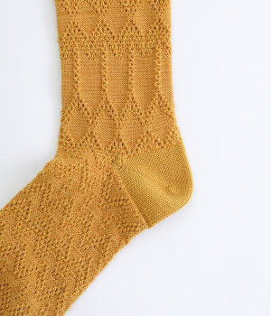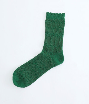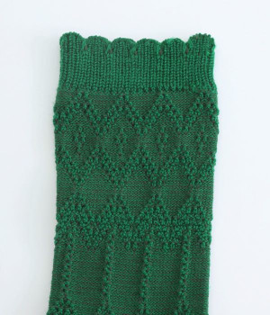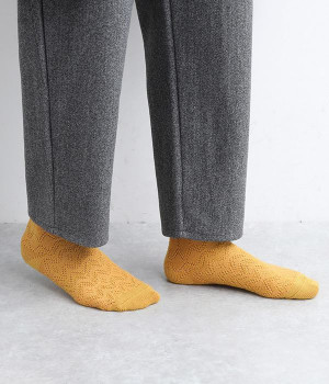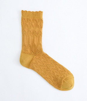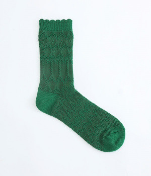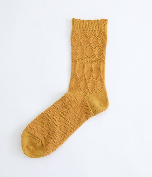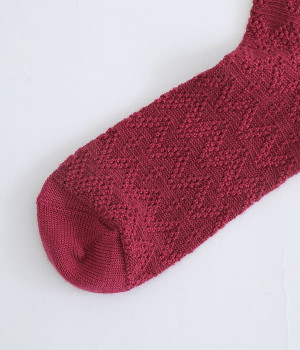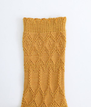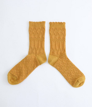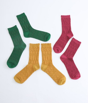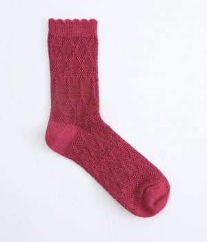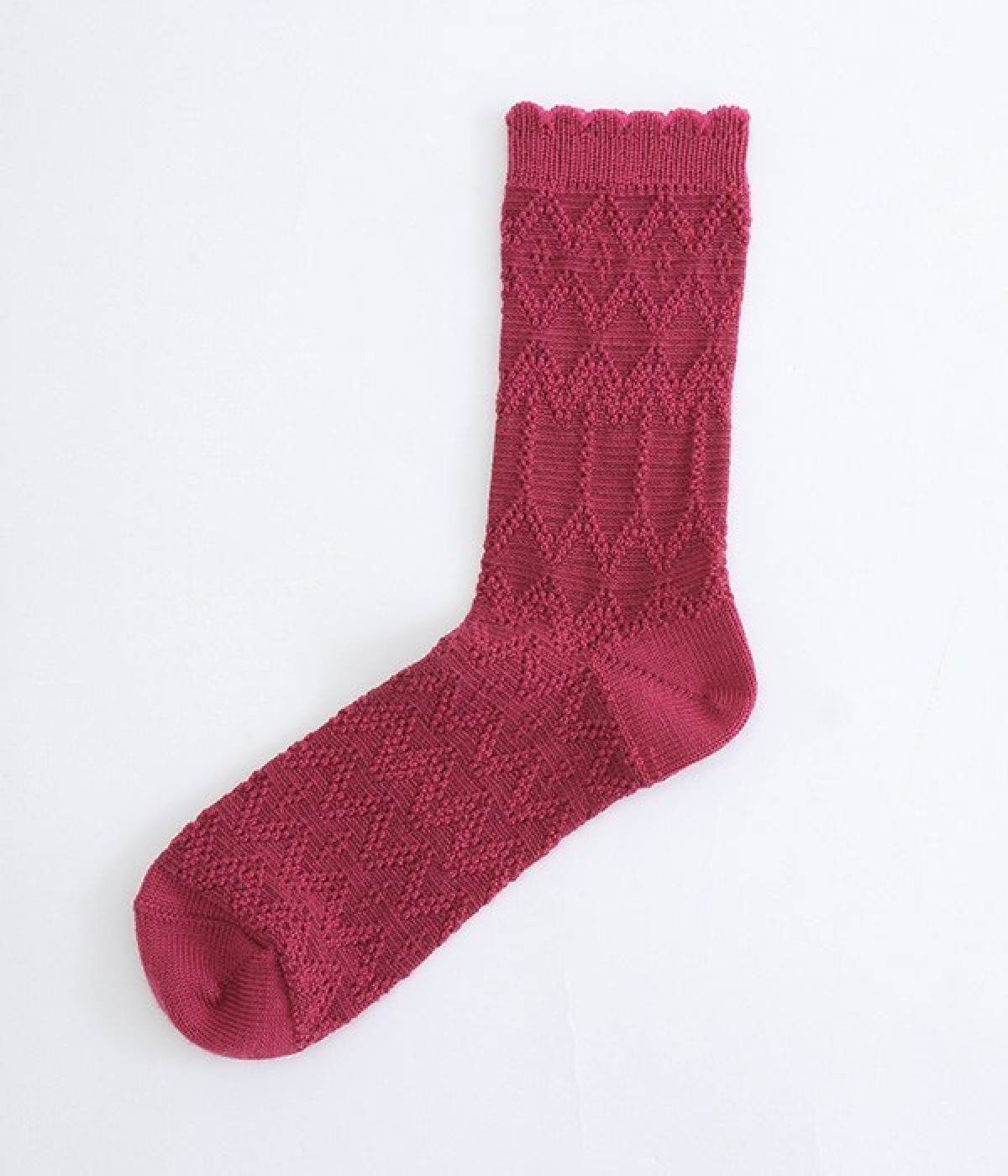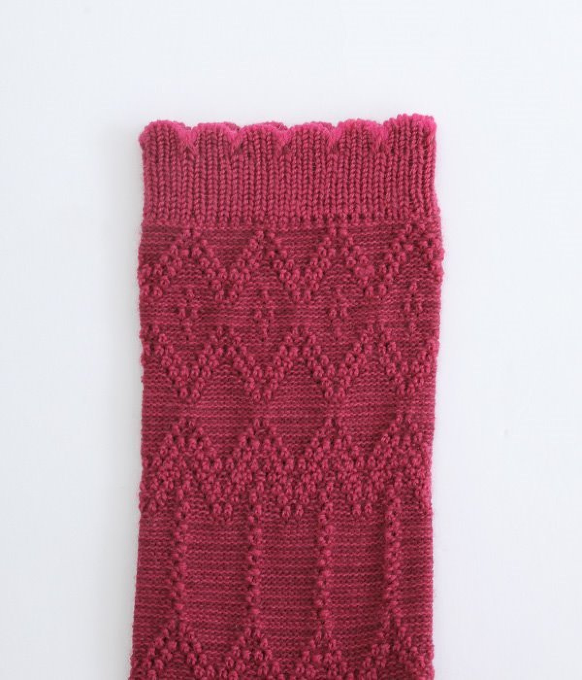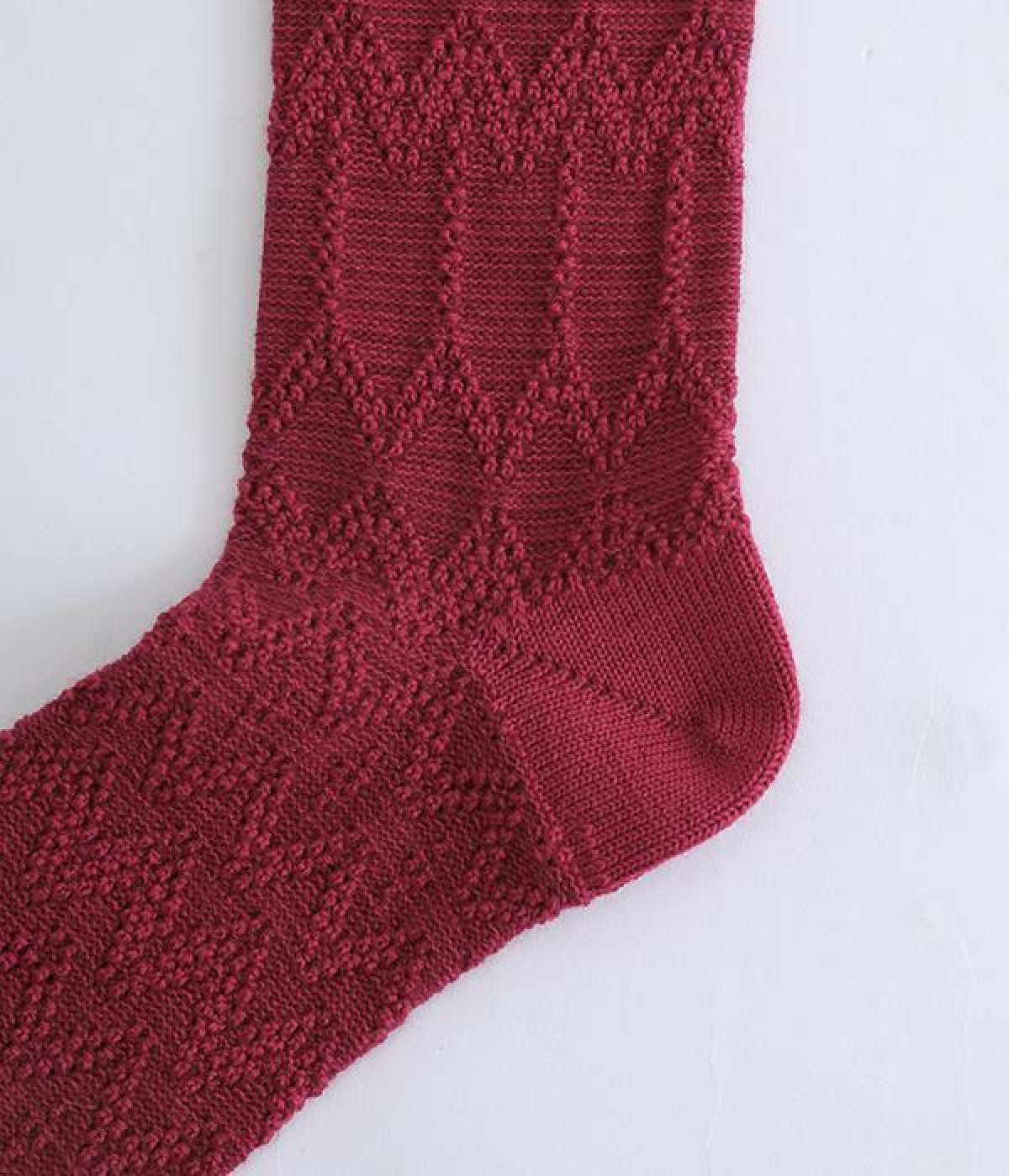 ループ状の立体的な織り柄が深いニュアンスを生み出すソックスです。差し色としてコーディネートのポイントになる、おしゃれなカラーを取り揃えました。履き口はフリルのようなかわいらしい形で、ボトムからのぞかせると印象的な足元に。ワンカラ―なので柄ボトムとの組み合わせにも活躍します。