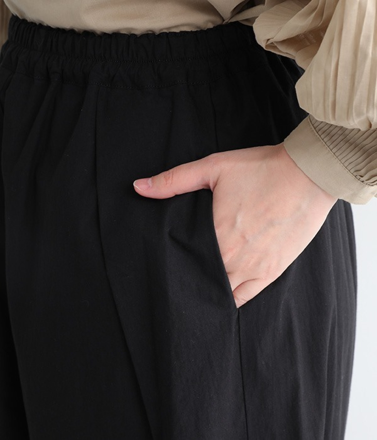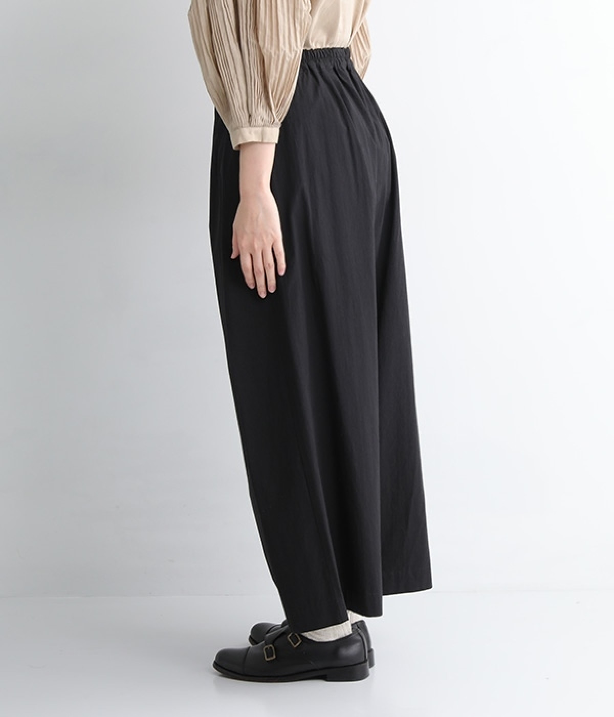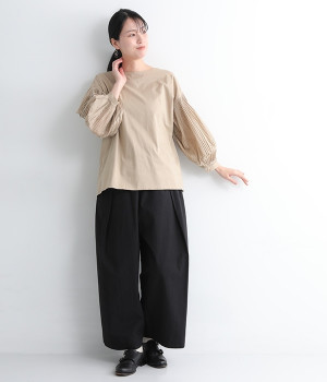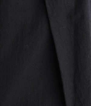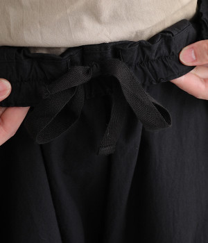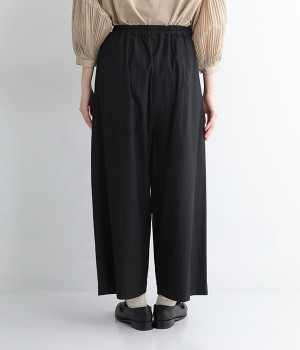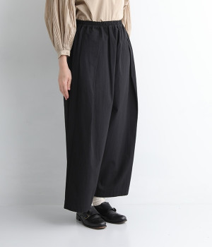 ワタリから裾にかけての幅広なシルエットとウエストの深いタックで、落ち感のあるフォルムに仕上げたワイドパンツです。染色前に生地を繰り返し揉み込み、洗いざらしのシワとふくらみを引き出した滋賀県近江産地の「近江晒し」という染色技法を採用しています。ややハリのあるコットン生地できれいめなスタイルにも好相性。ウエストベルトの上部にゴムを、下部には細い内ひもを入れているため簡単にサイズ調節が可能です。