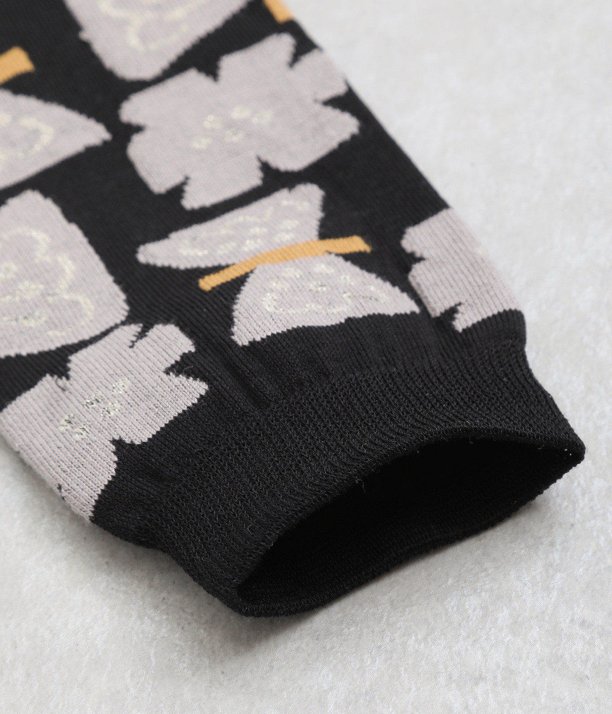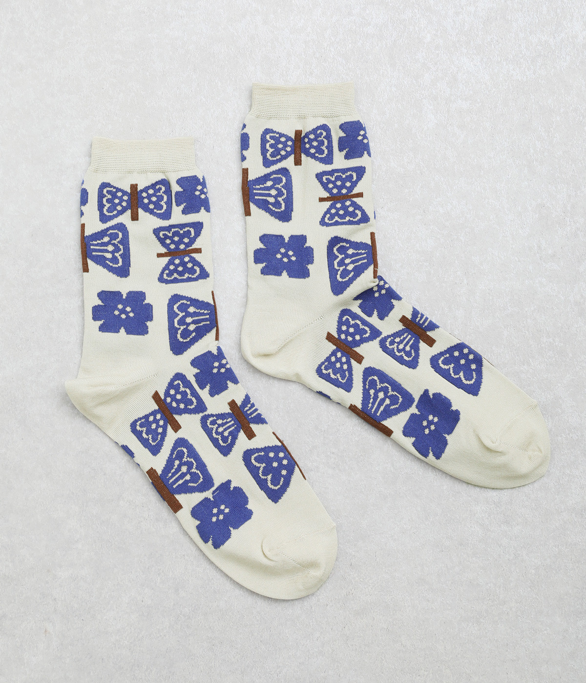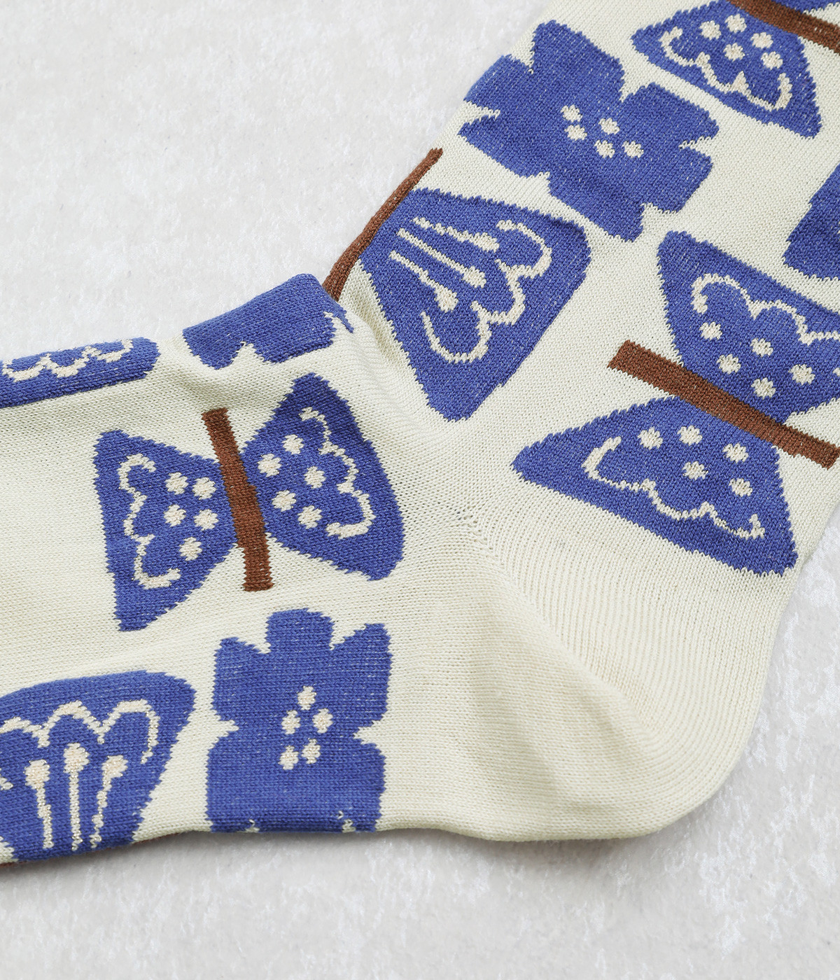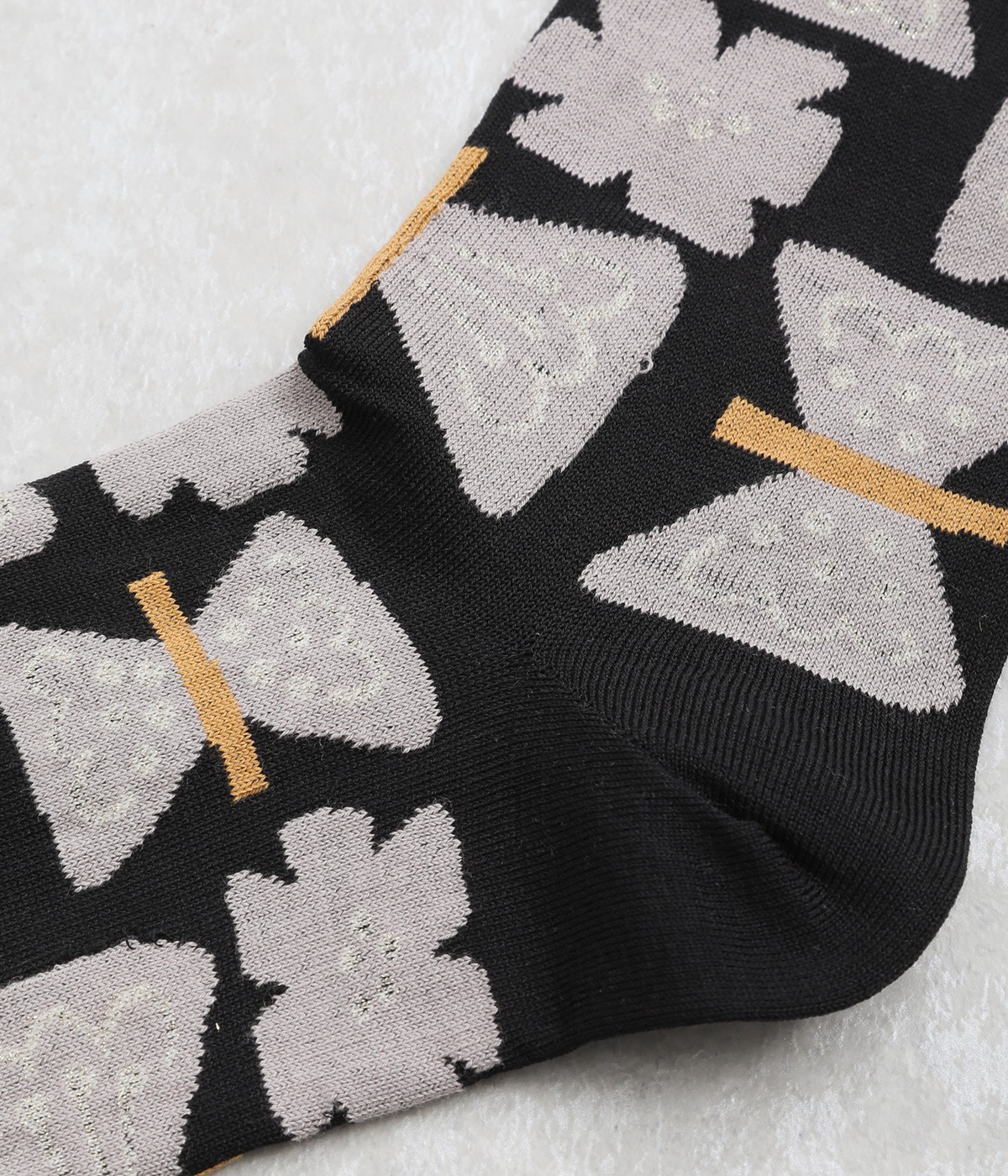 羽を広げた蝶をポップなデザインでソックスに落とし込みました。羽の模様はラメ糸を用いたり、ところどころにお花モチーフをまじえたりと、ディテールにもこだわっています。カジュアルスタイルに合う仕上がりです。