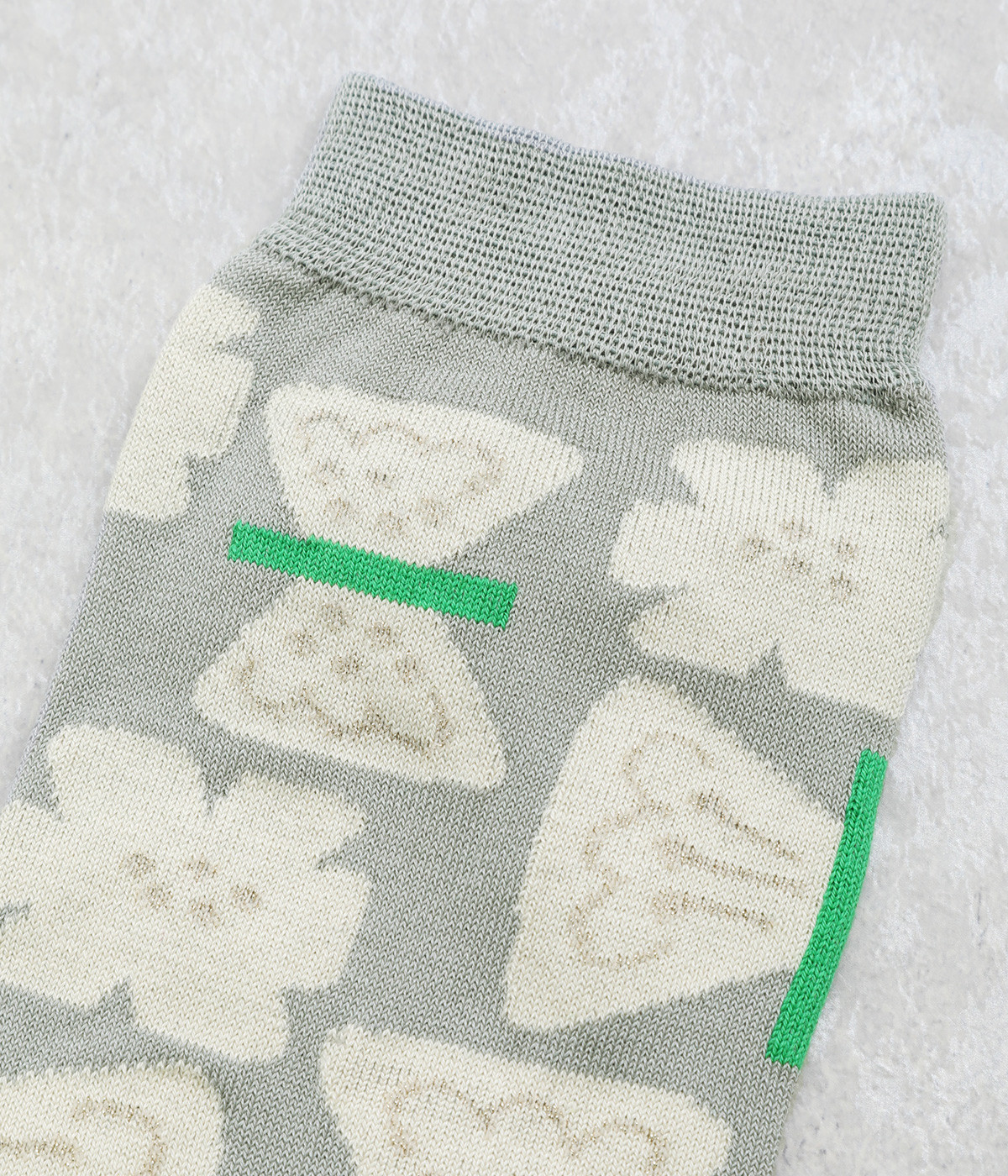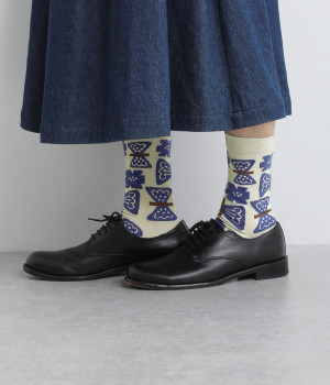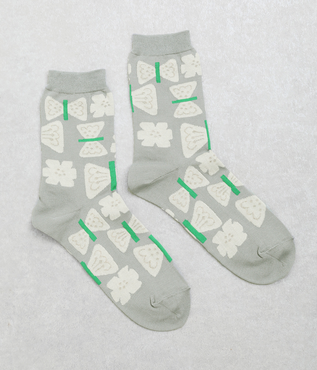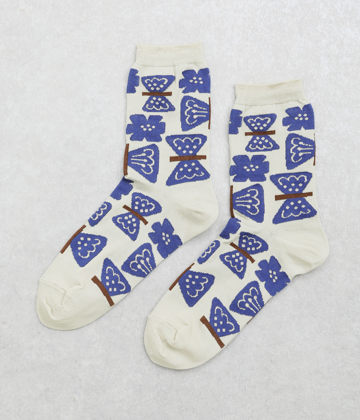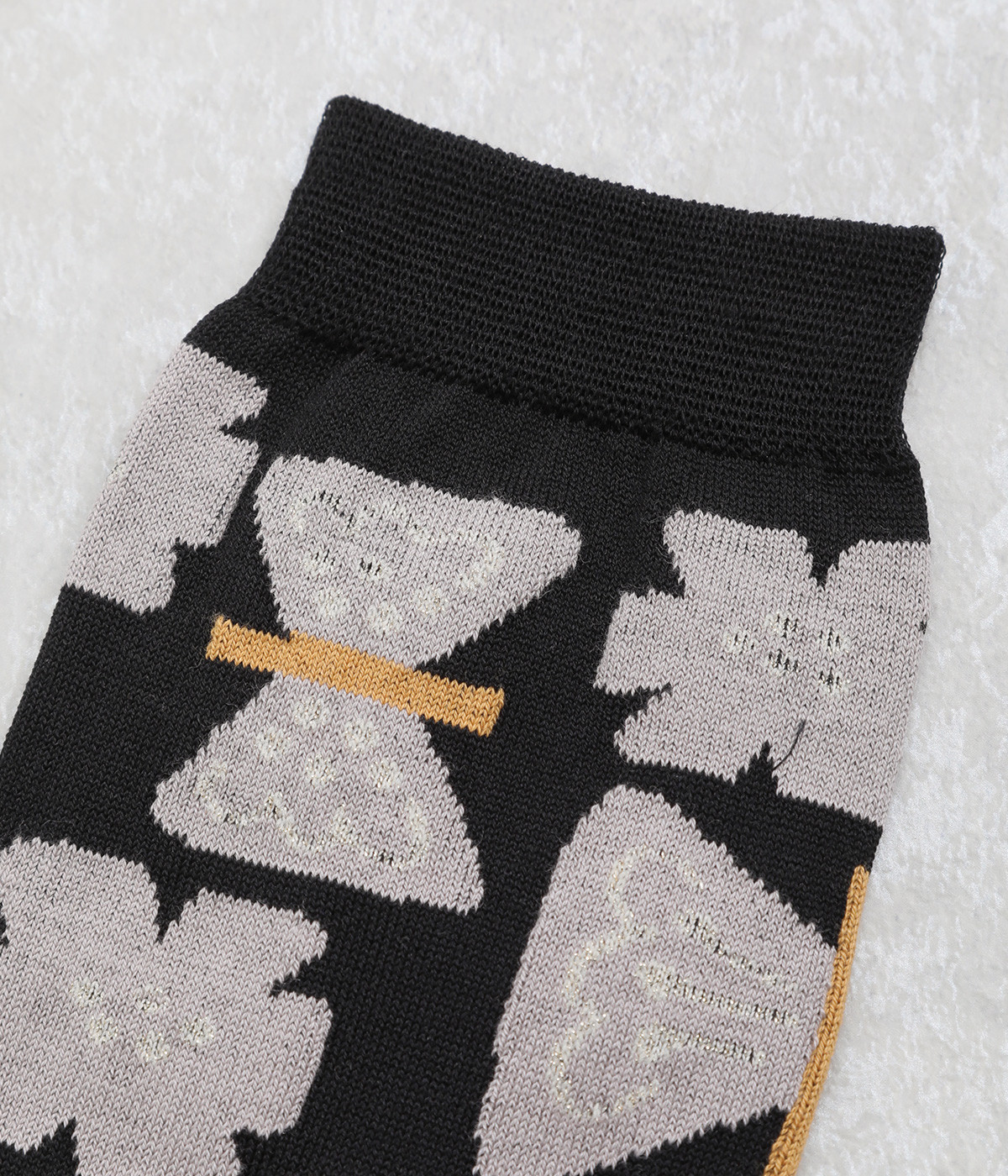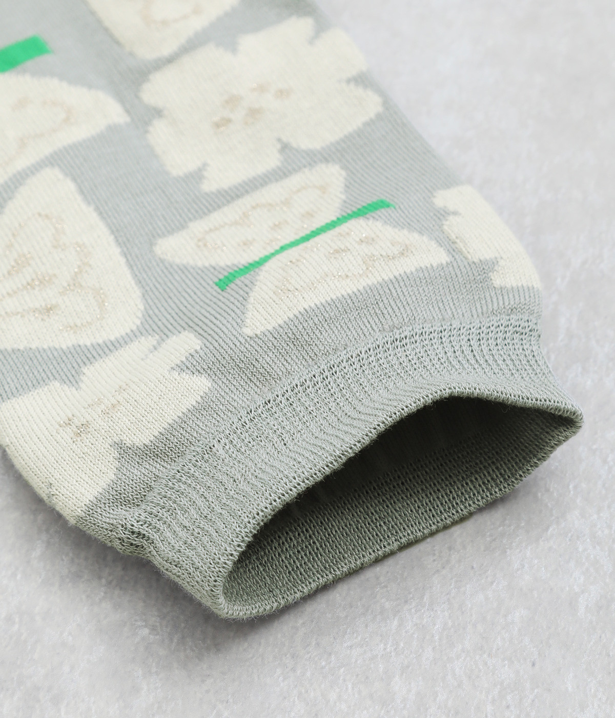 羽を広げた蝶をポップなデザインでソックスに落とし込みました。羽の模様はラメ糸を用いたり、ところどころにお花モチーフをまじえたりと、ディテールにもこだわっています。カジュアルスタイルに合う仕上がりです。
