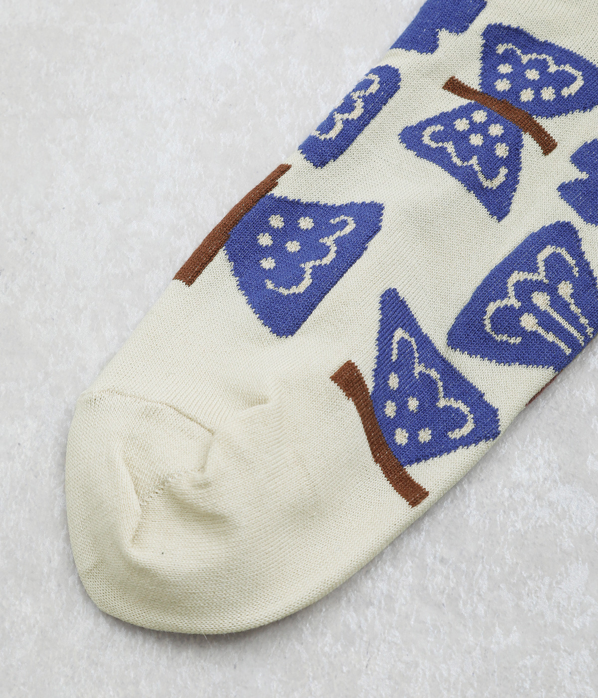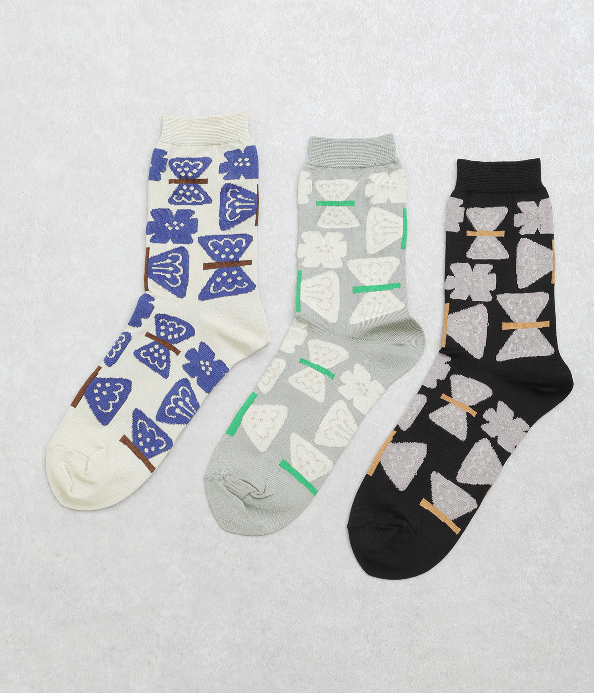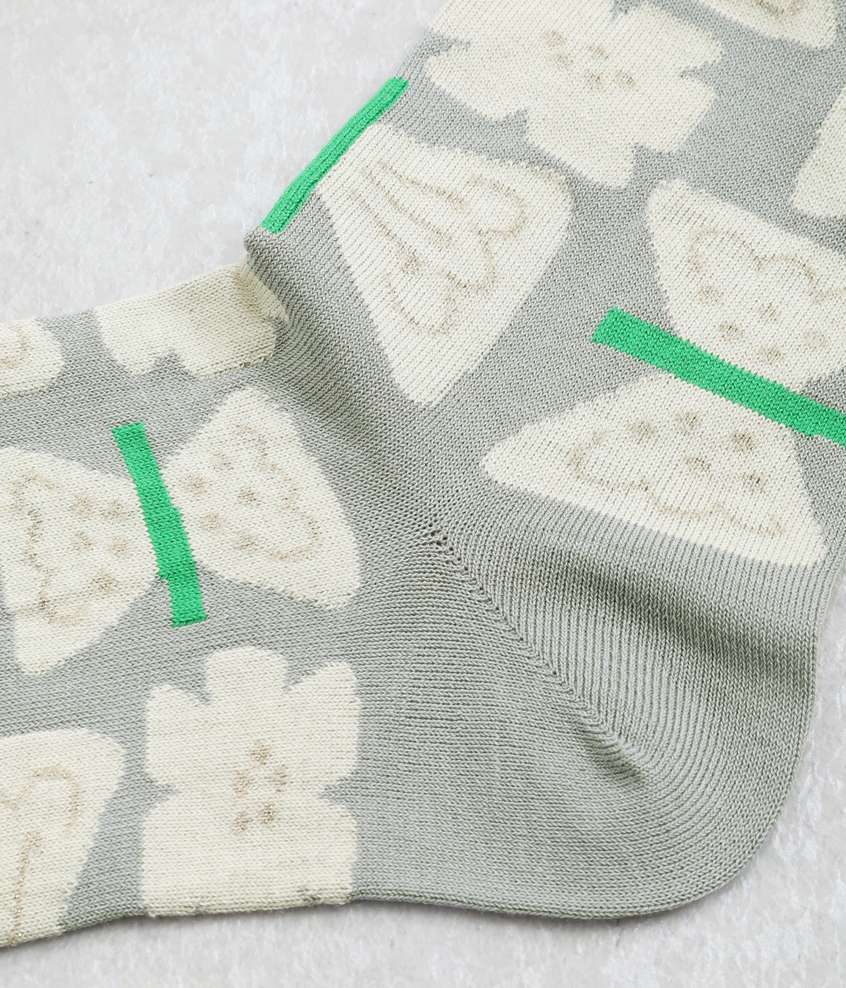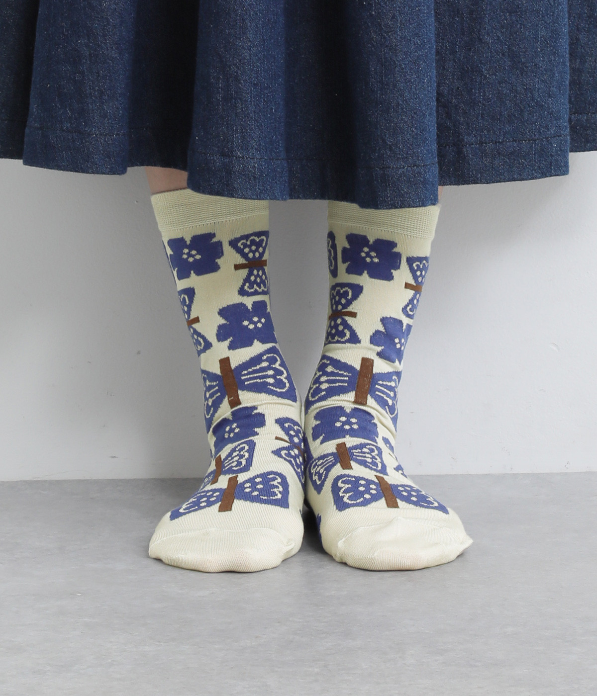 羽を広げた蝶をポップなデザインでソックスに落とし込みました。羽の模様はラメ糸を用いたり、ところどころにお花モチーフをまじえたりと、ディテールにもこだわっています。カジュアルスタイルに合う仕上がりです。