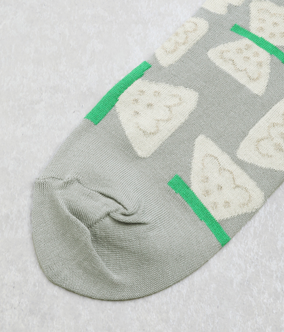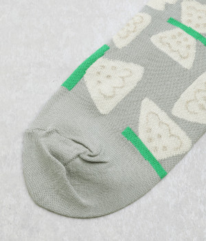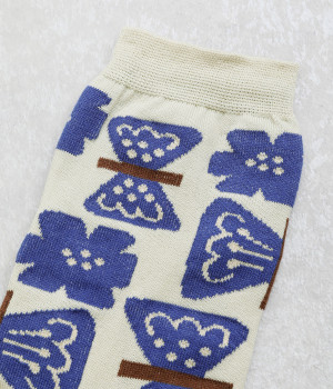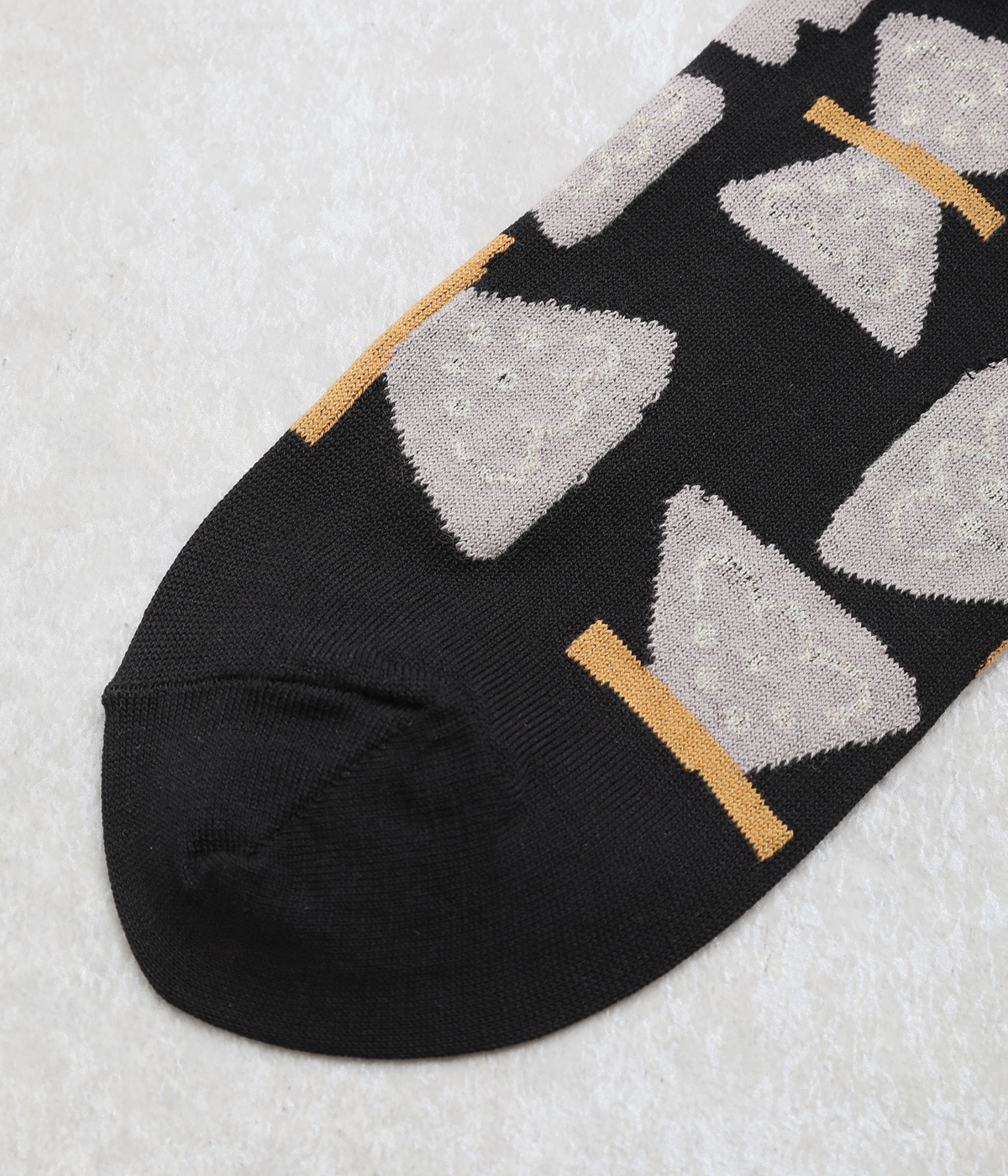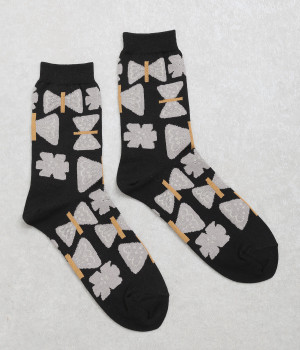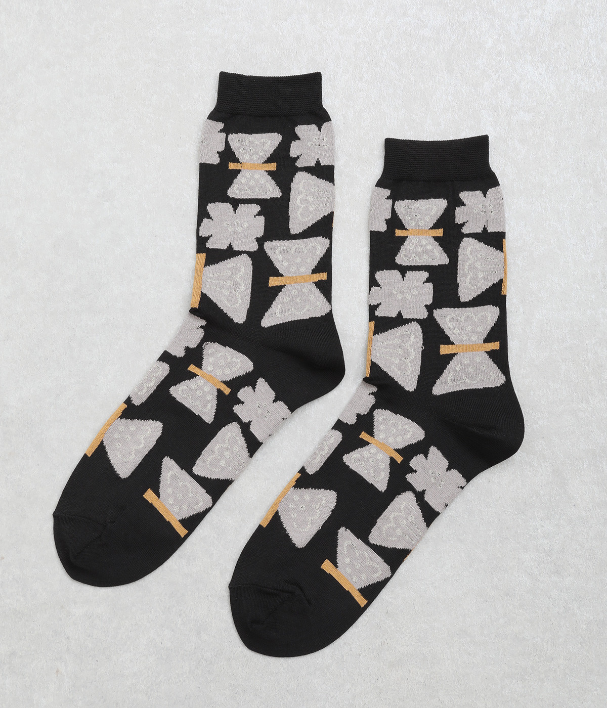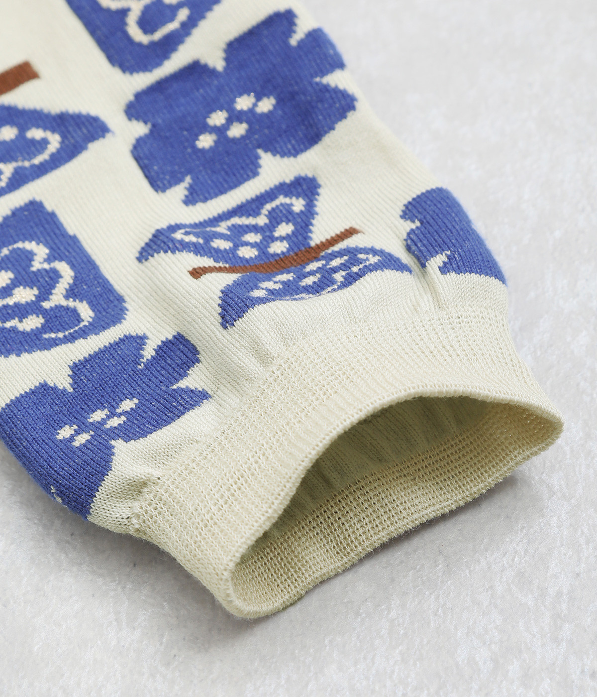 羽を広げた蝶をポップなデザインでソックスに落とし込みました。羽の模様はラメ糸を用いたり、ところどころにお花モチーフをまじえたりと、ディテールにもこだわっています。カジュアルスタイルに合う仕上がりです。
