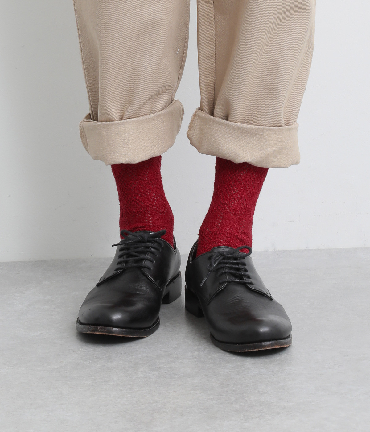 シンプルなワンカラーながらもしっかりと存在感を発揮してくれる一足。ロールアップしたパンツの裾からのぞかせれば、スタイリングにもメリハリがつきます。ナチュラル感のある編み模様でデイリー使いに最適です。