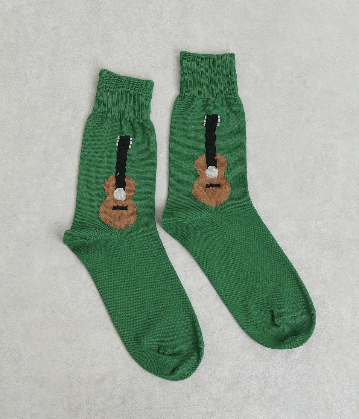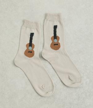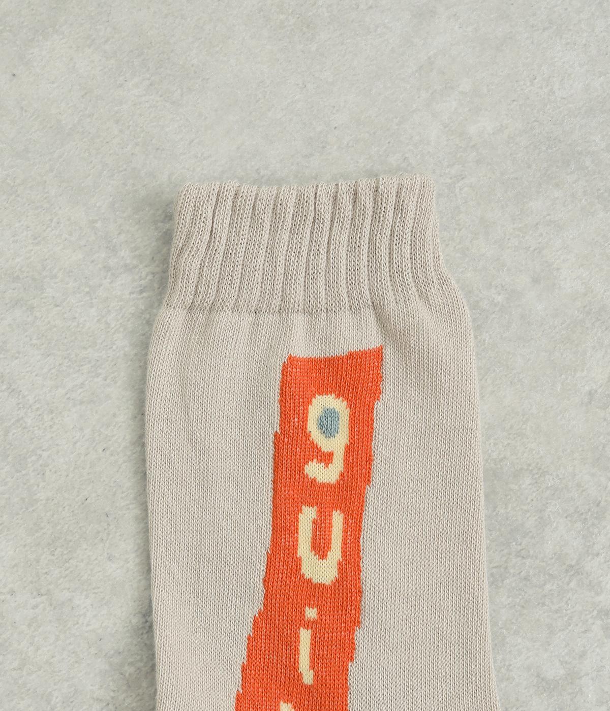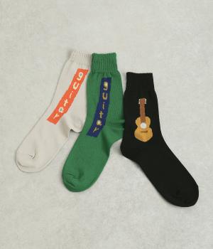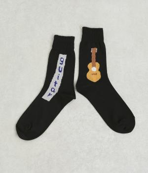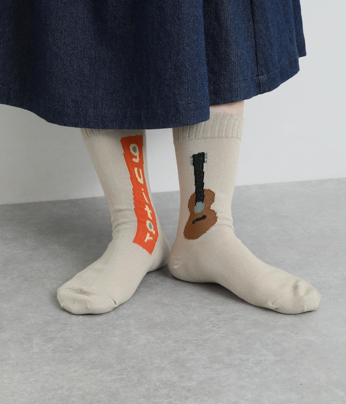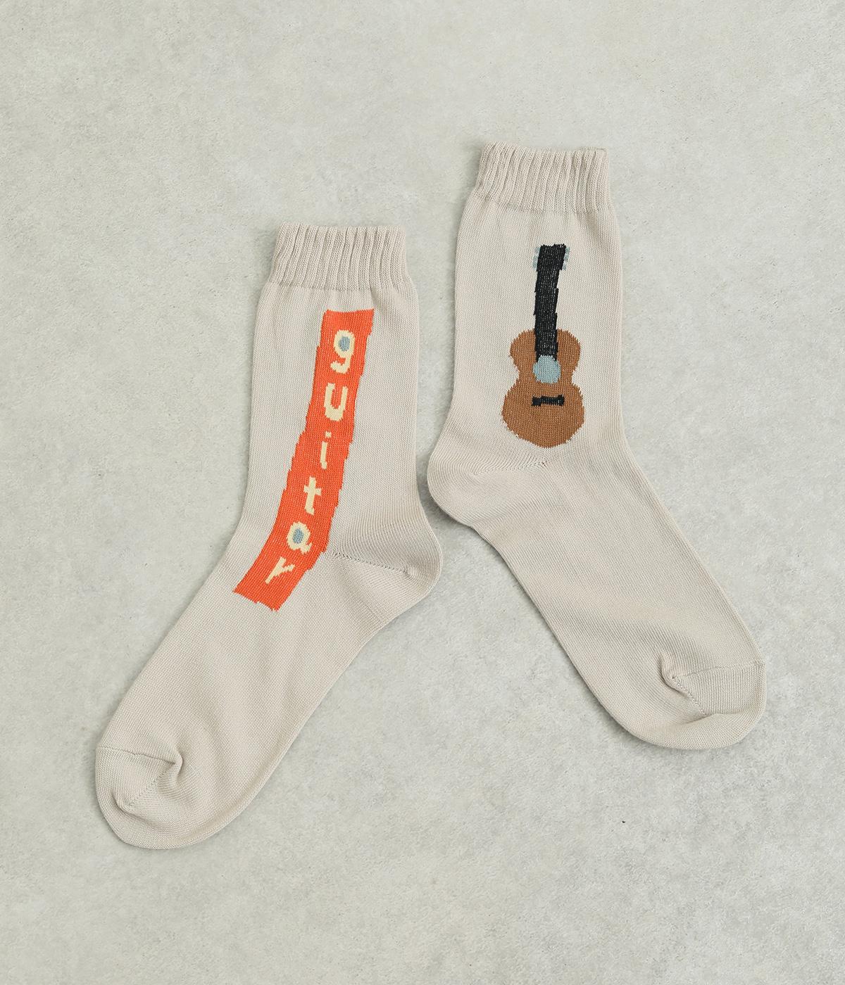 ラフに描かれたギターとポップなロゴをあしらった、左右で異なるデザインがユニークなソックスです。目を引く配色がコーディネートのアクセントにぴったり。カジュアルさを加速させる幅広のリブもポイントです。