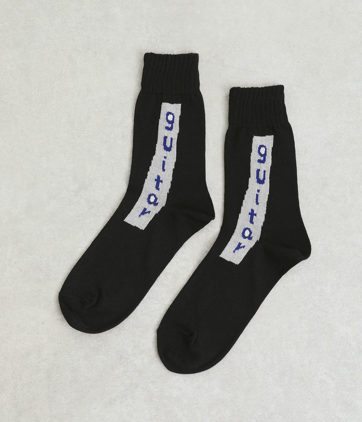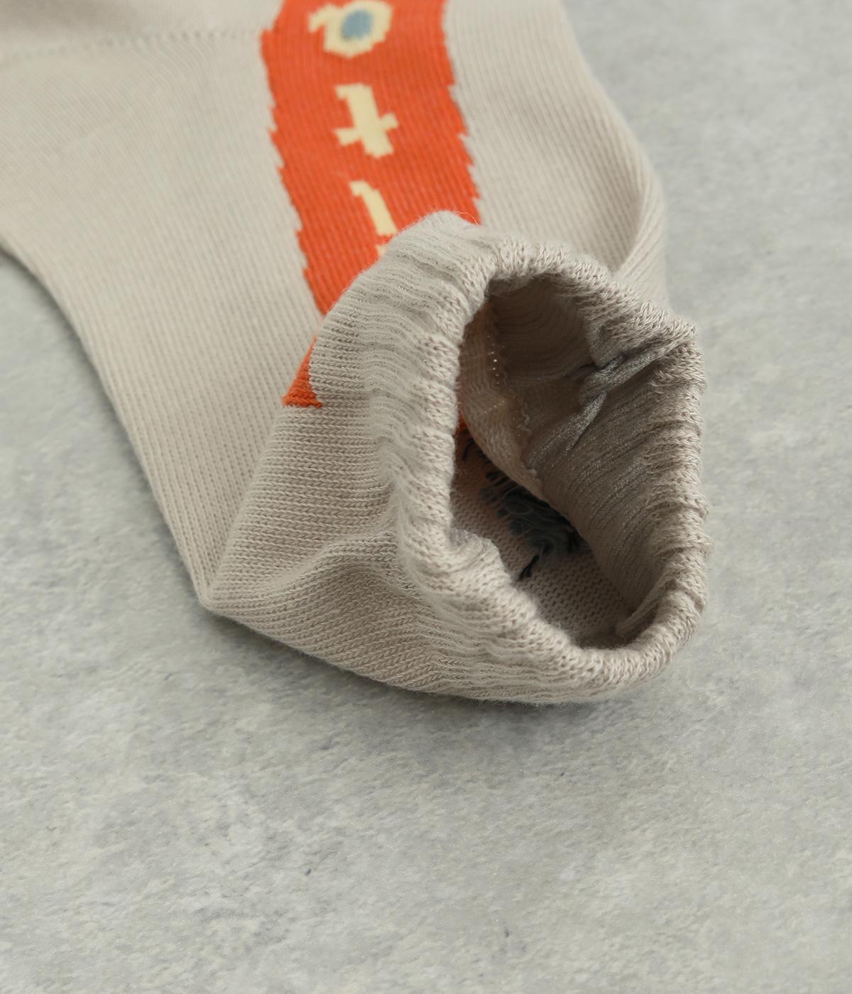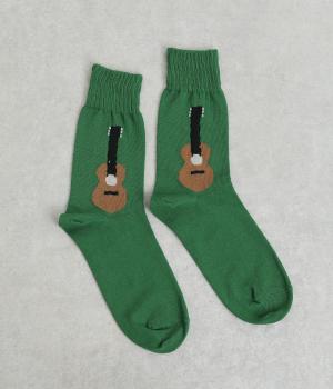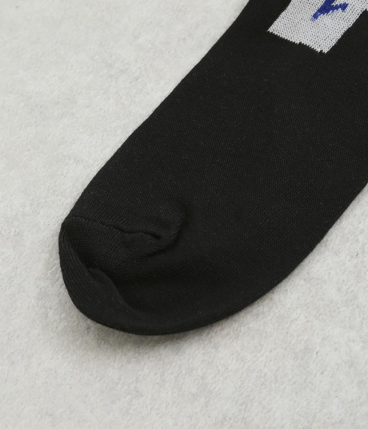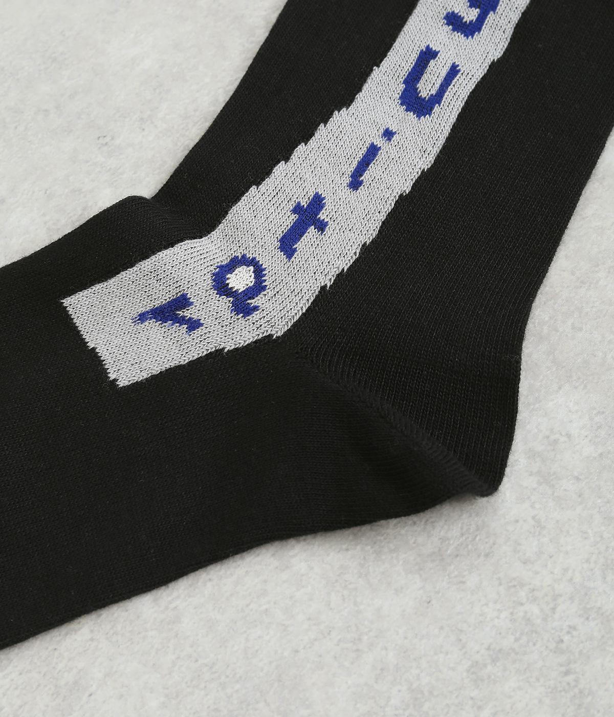 ラフに描かれたギターとポップなロゴをあしらった、左右で異なるデザインがユニークなソックスです。目を引く配色がコーディネートのアクセントにぴったり。カジュアルさを加速させる幅広のリブもポイントです。