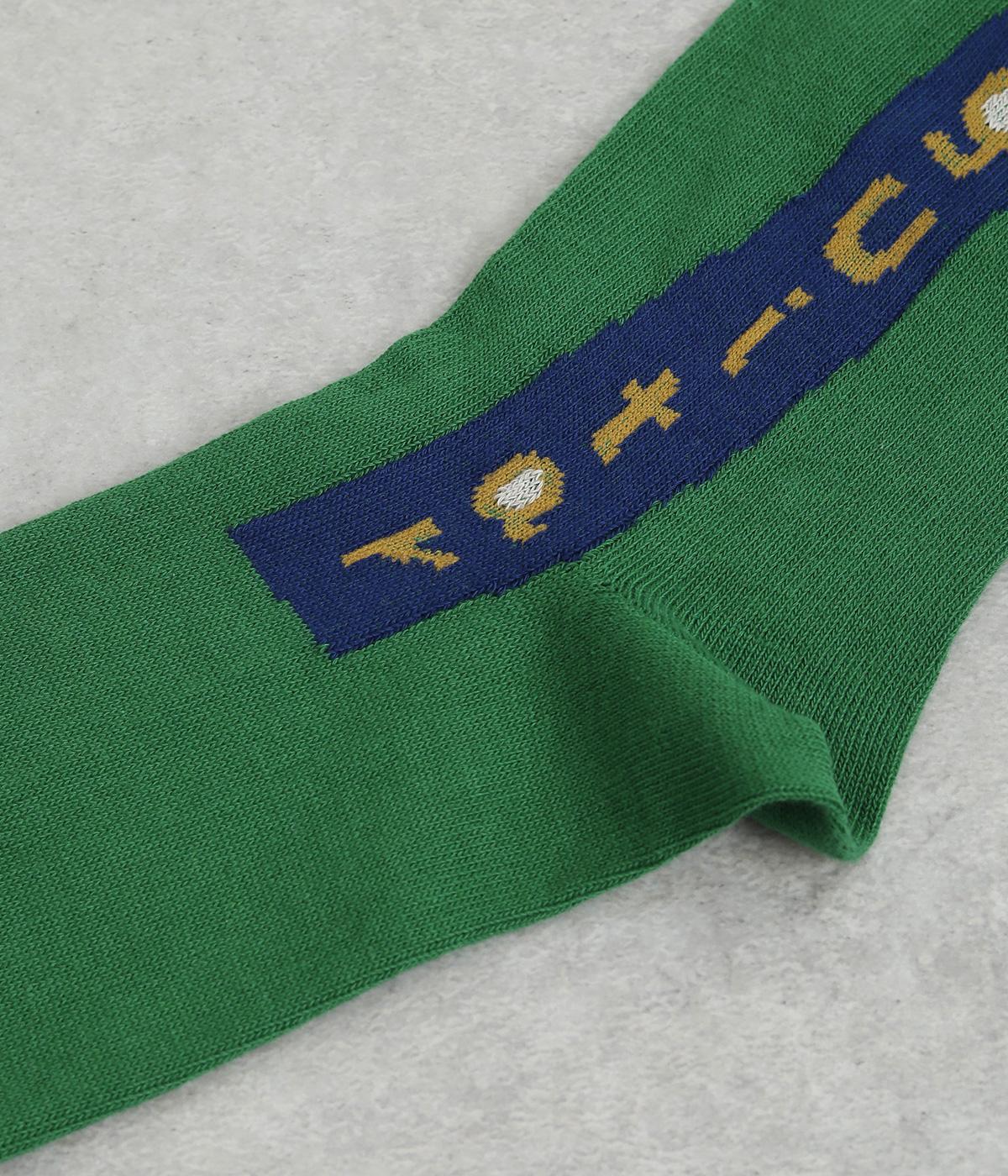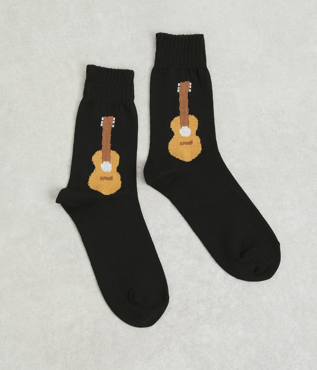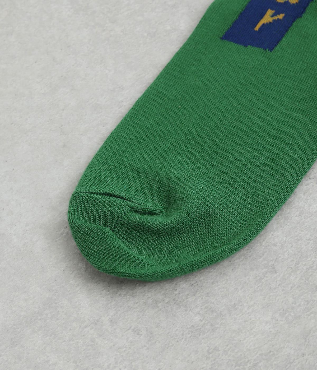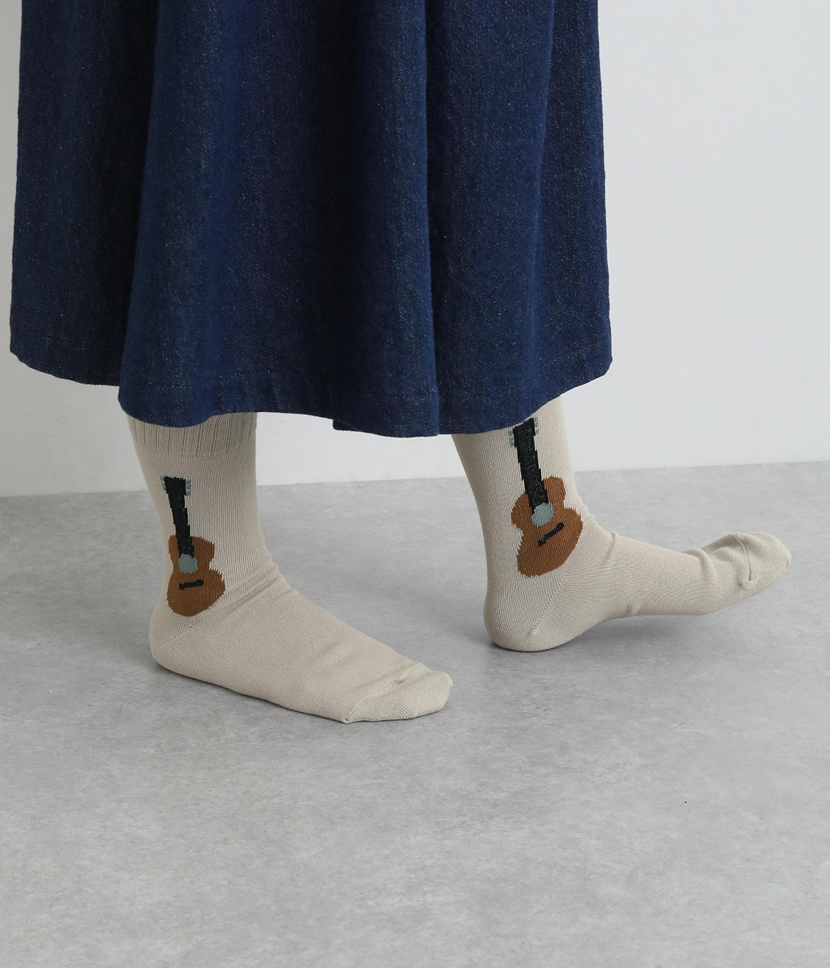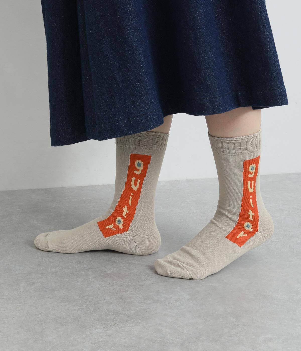 ラフに描かれたギターとポップなロゴをあしらった、左右で異なるデザインがユニークなソックスです。目を引く配色がコーディネートのアクセントにぴったり。カジュアルさを加速させる幅広のリブもポイントです。