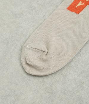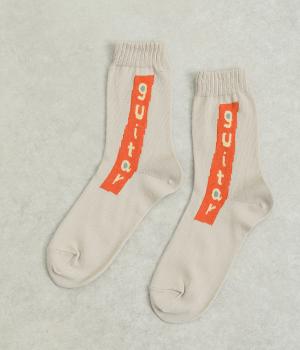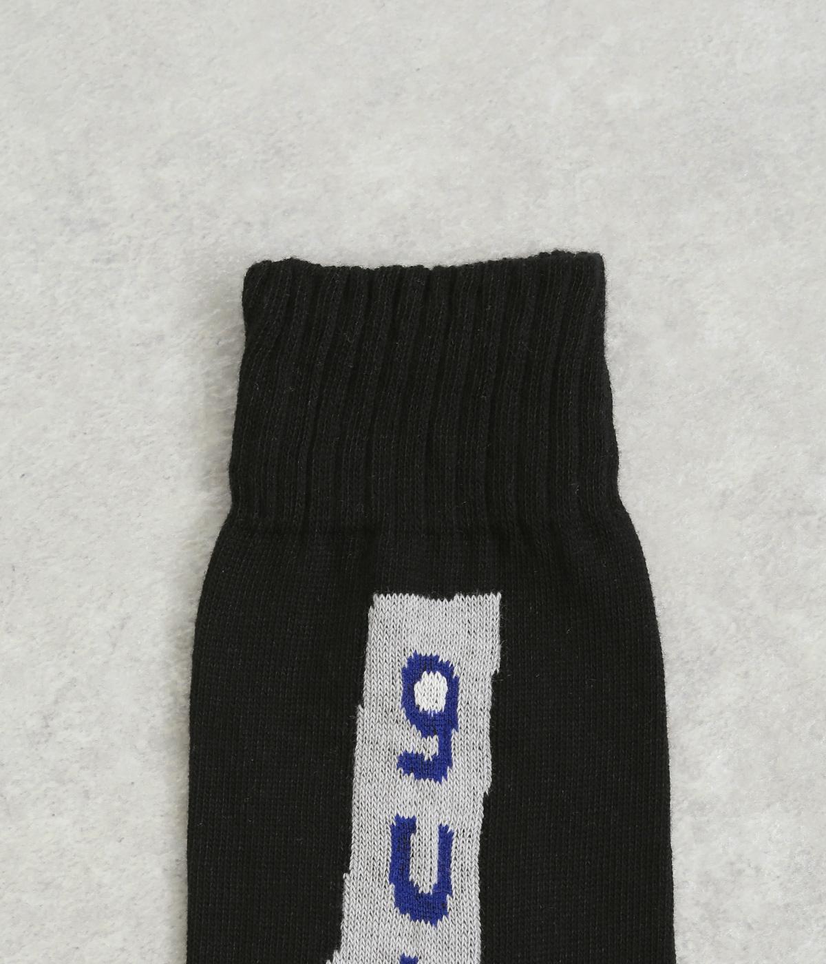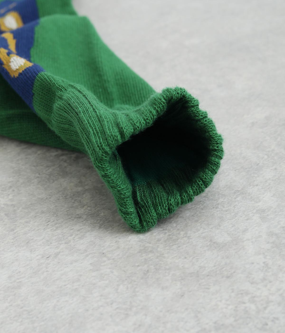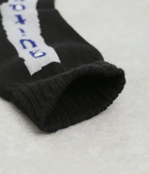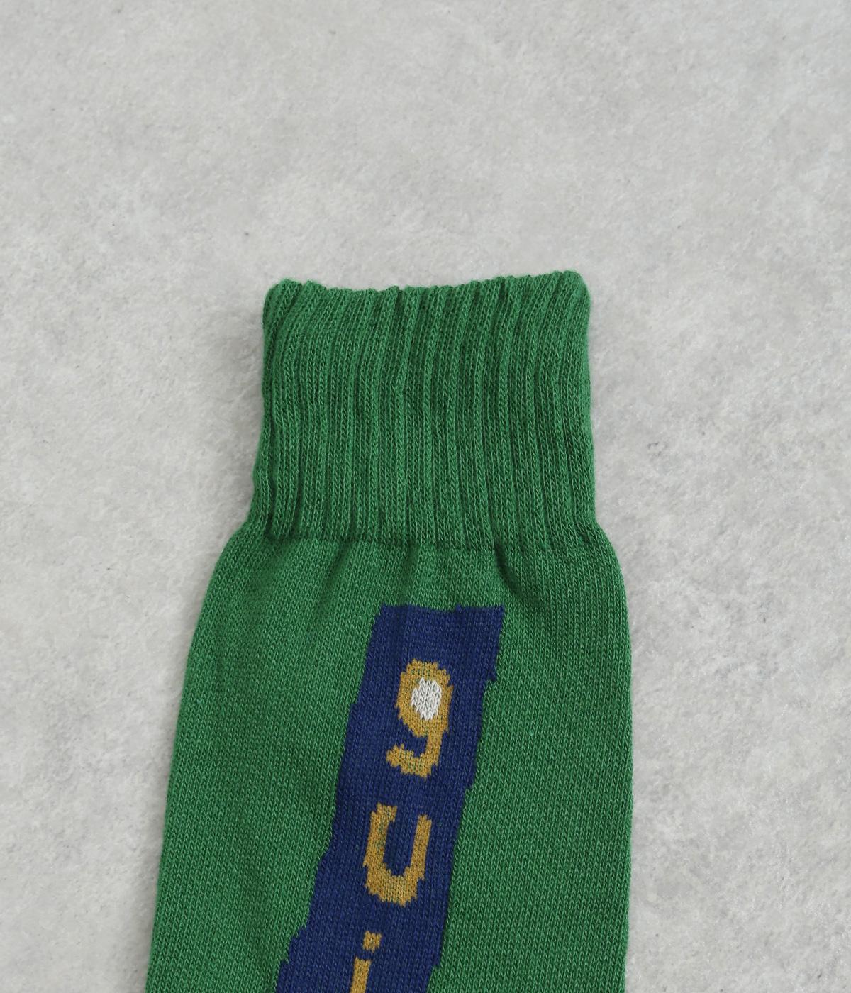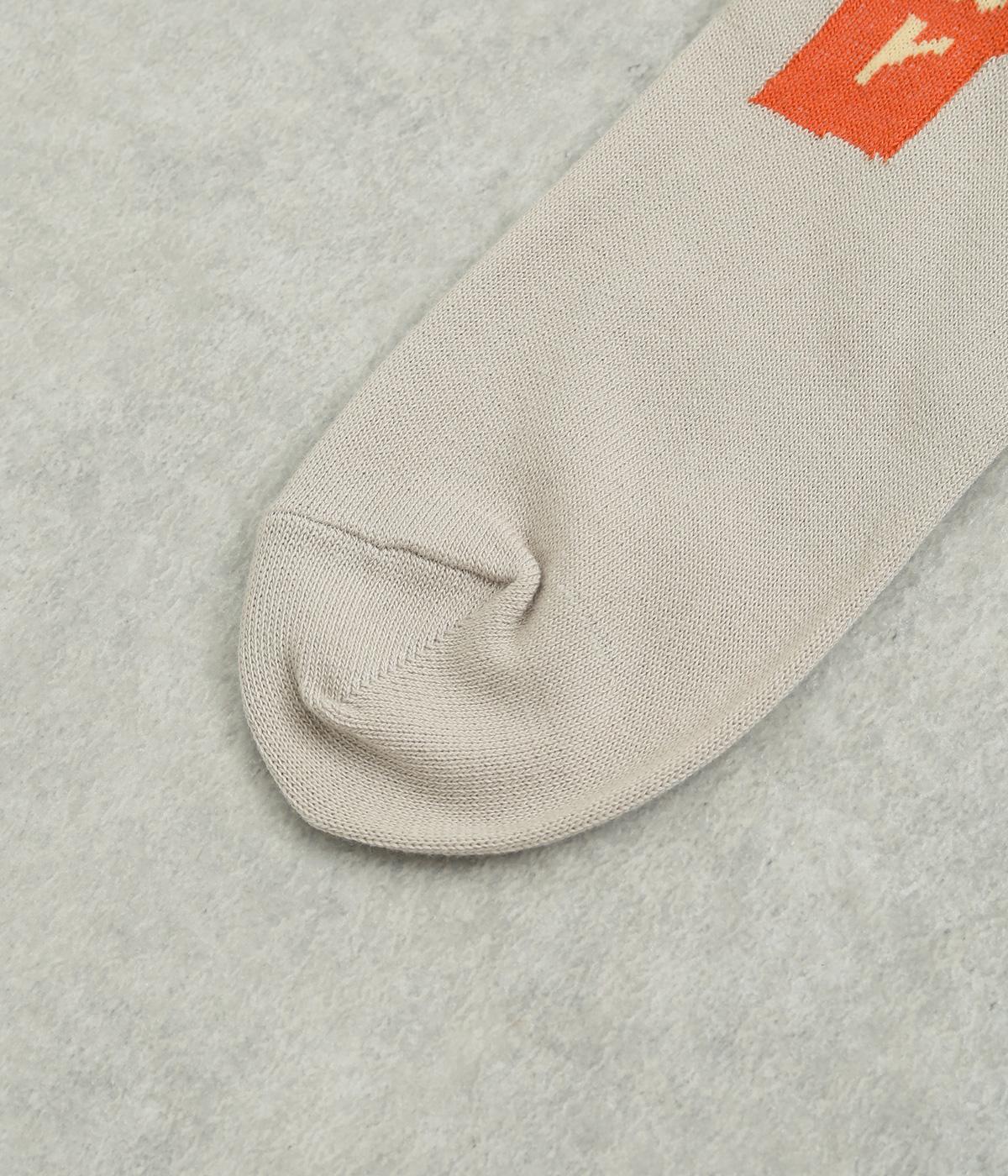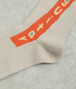 ラフに描かれたギターとポップなロゴをあしらった、左右で異なるデザインがユニークなソックスです。目を引く配色がコーディネートのアクセントにぴったり。カジュアルさを加速させる幅広のリブもポイントです。